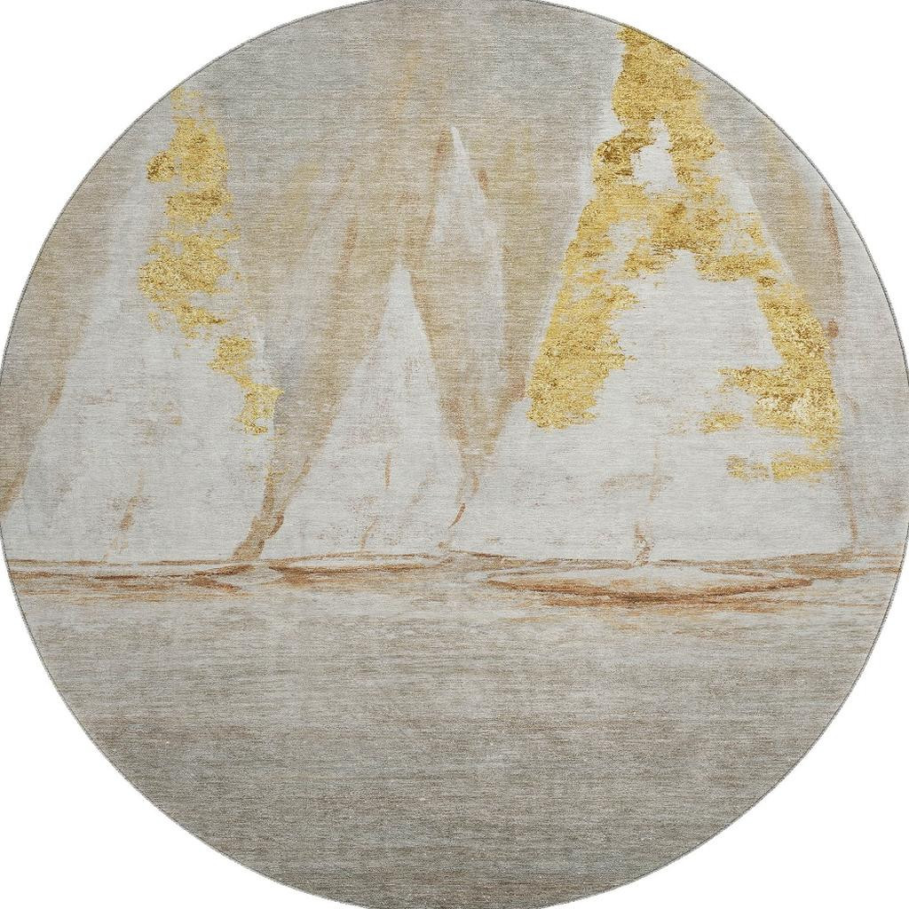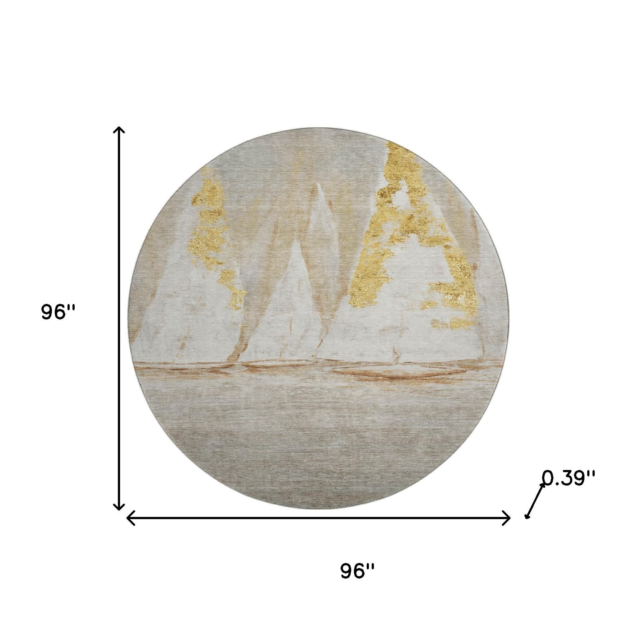 This 8-foot taupe and gold nautical washable round rug with uv protection, is a great way to add warmth to a room. Ideal for spaces with kids and pets, this rug is stain resistant to help repel dirt and spilled liquids. Built to last, this rug crafted from polyester fibers is known for its durability and long lasting appeal. Rugs are a great way to showcase your style, hide imperfections, warm your home and reduce noise. This larger sized, transitional styled rug is ready to create a focal point or statement piece in your room. 96.00-inch h x 96.00-inch w x 0.39-inch d.