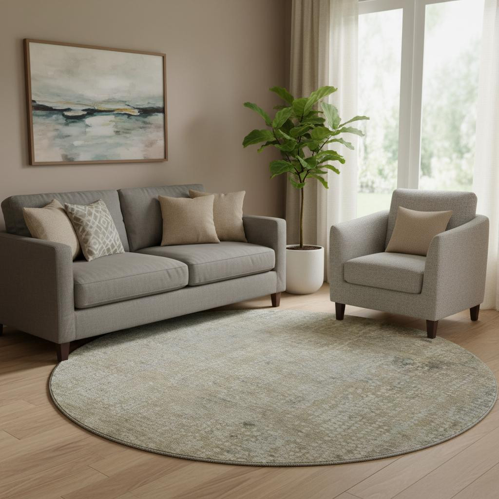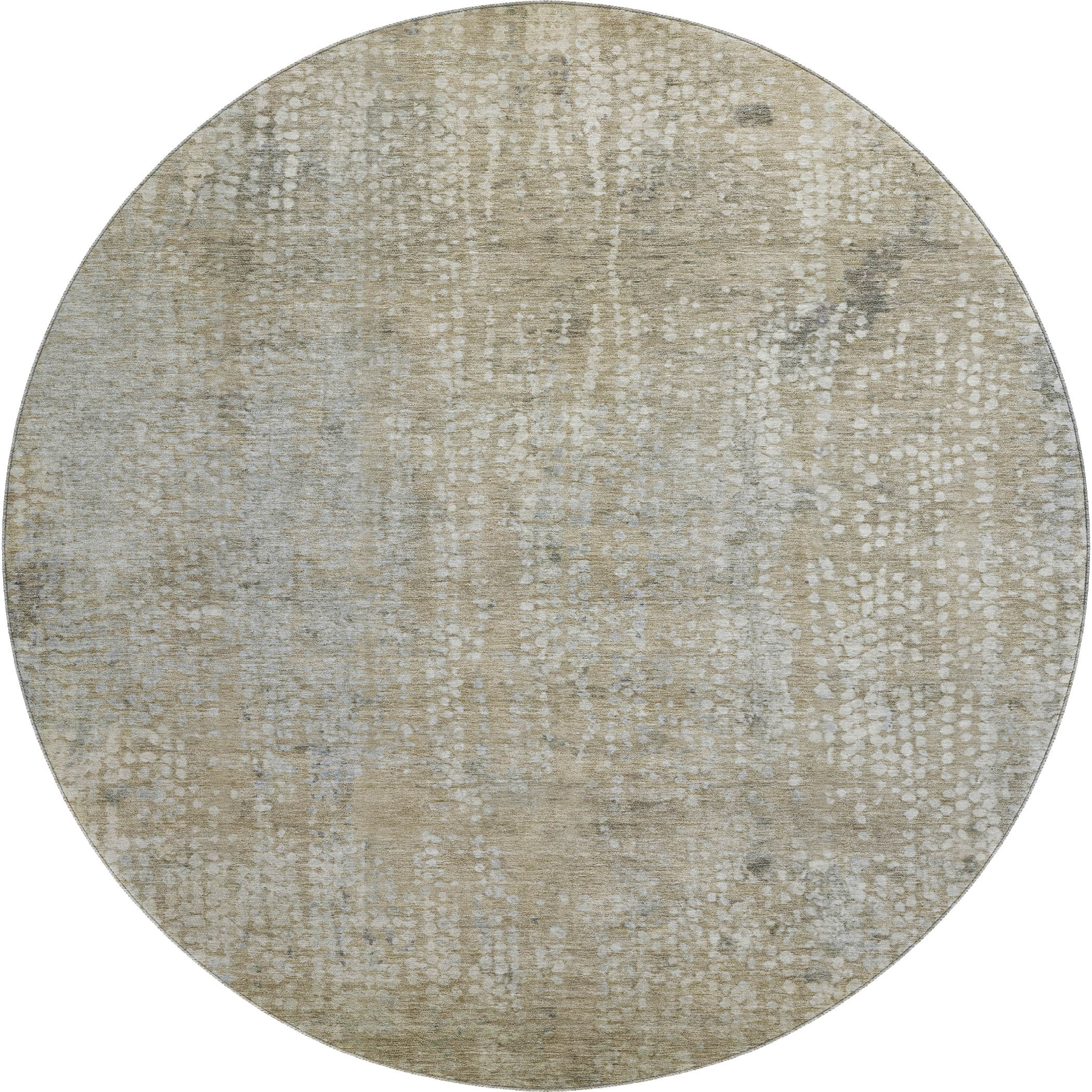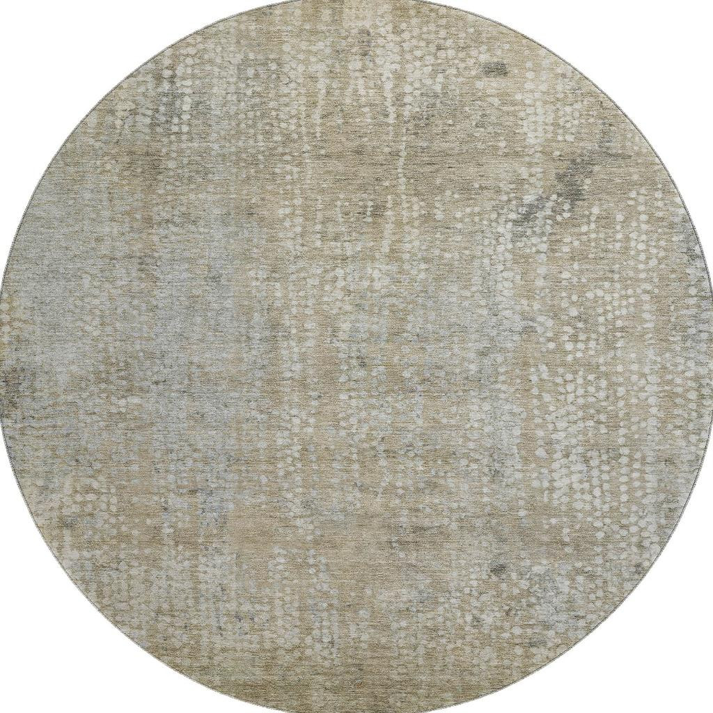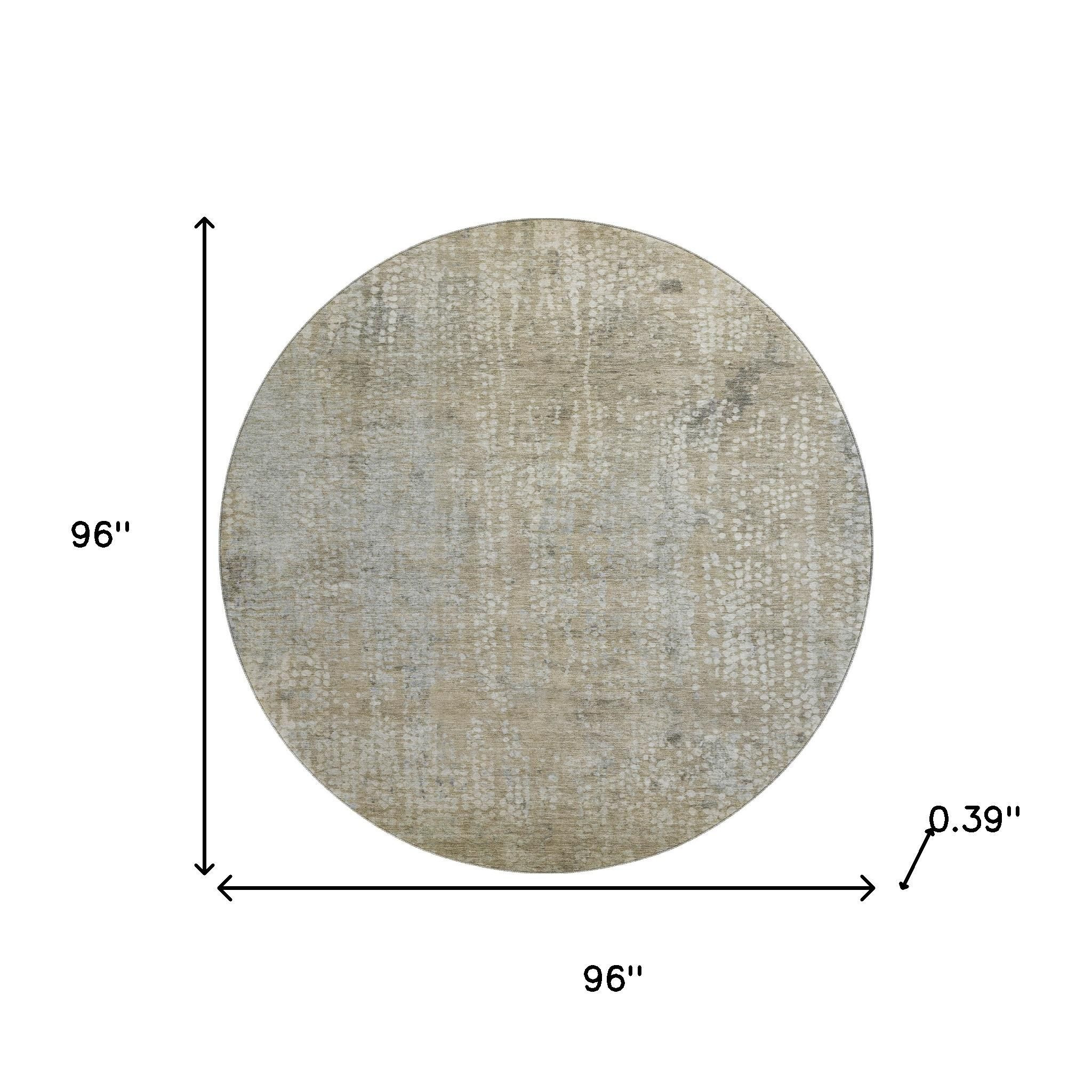 This 8-foot beige and gray abstract washable round rug with uv protection, is a great way to add warmth to a room. Ideal for spaces with kids and pets, this rug is stain resistant to help repel dirt and spilled liquids. Built to last, this rug crafted from polyester fibers is known for its durability and long lasting appeal. Rugs are a great way to showcase your style, hide imperfections, warm your home and reduce noise. This larger sized, transitional styled rug is ready to create a focal point or statement piece in your room. 96.00-inch h x 96.00-inch w x 0.39-inch d.