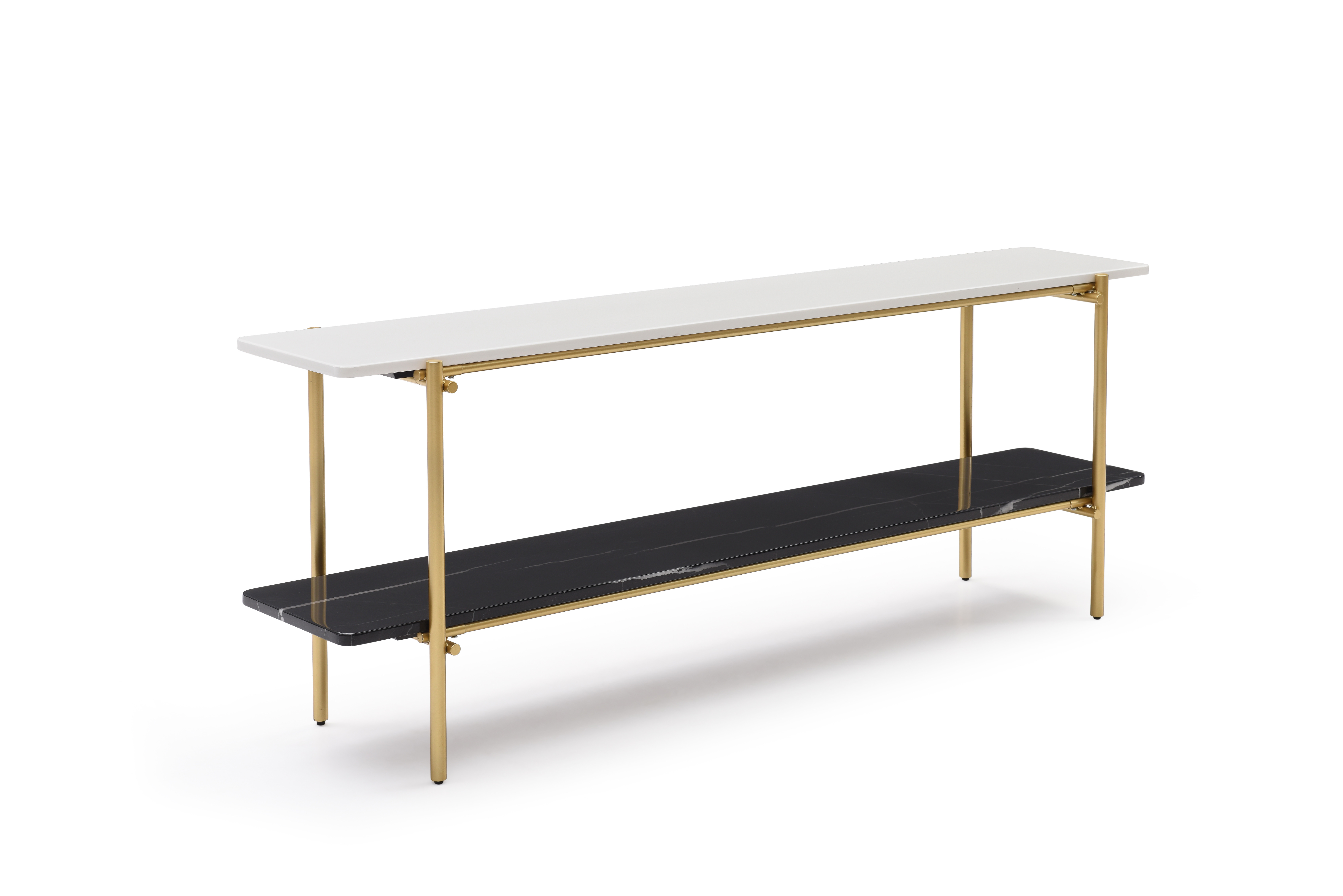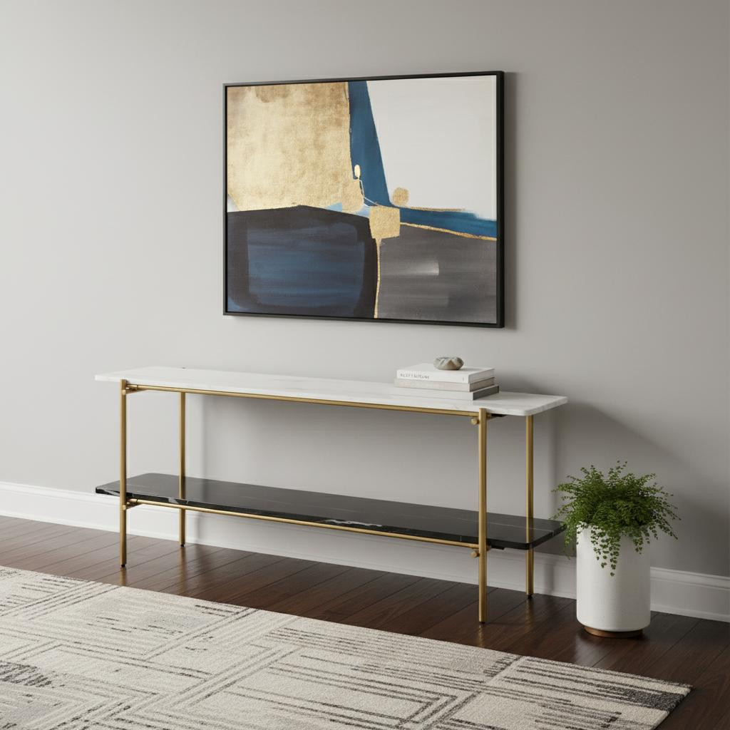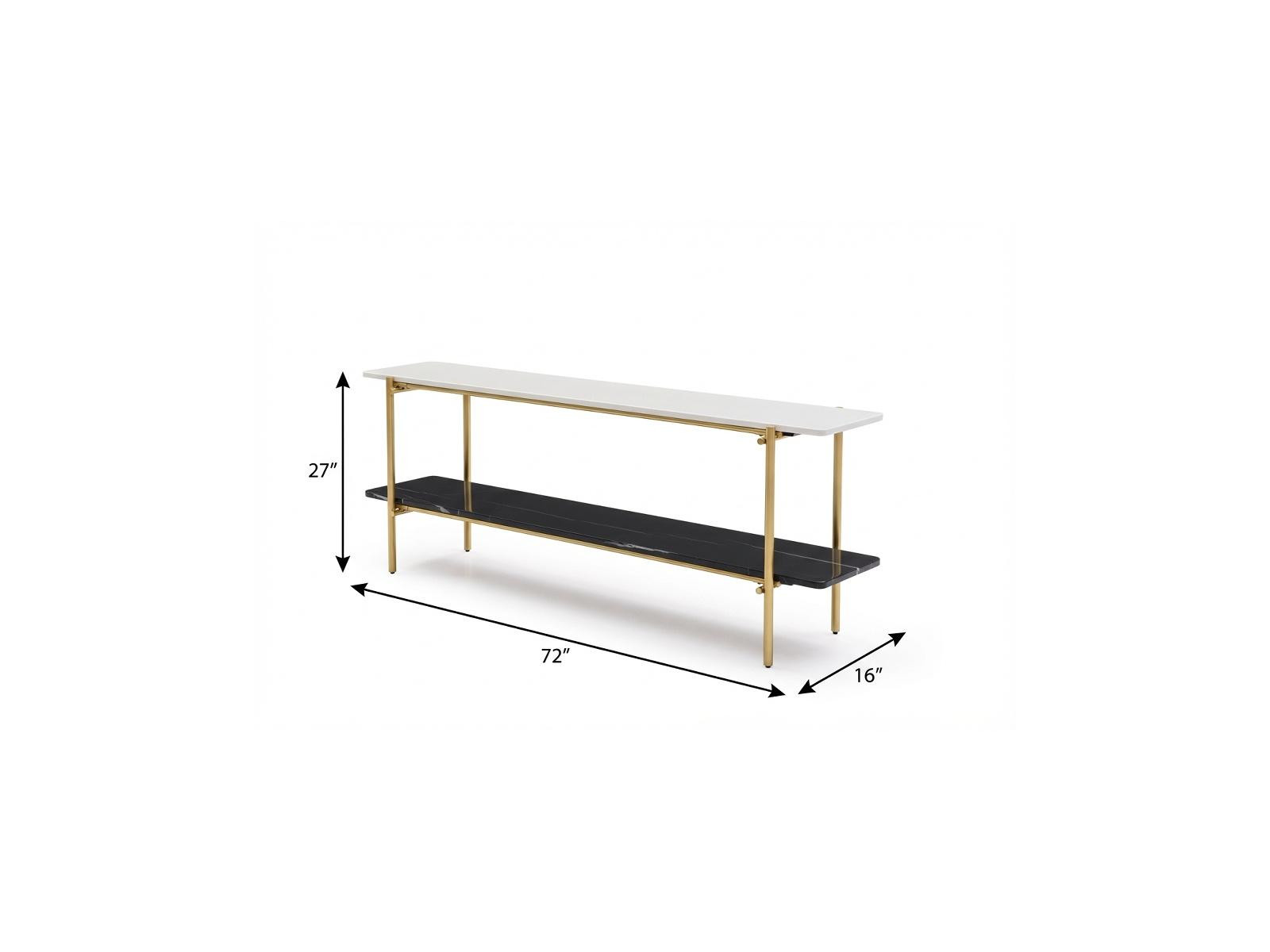 Don't settle for a boring entryway, upgrade your home with our 72-inch white black and gold genuine marble and metal console table with shelf today. This rectangular table is ideal for up against the wall, can free stand in a room, or sit behind the sofa perfectly. The white top of this genuine marble table will add beauty to any room with its alluring and distinctive veining of the stone. Versatile in use, console tables can be used for a variety of purposes in a variety of rooms and settings. 27.00-inch h x 72.00-inch w x 16.00-inch d.