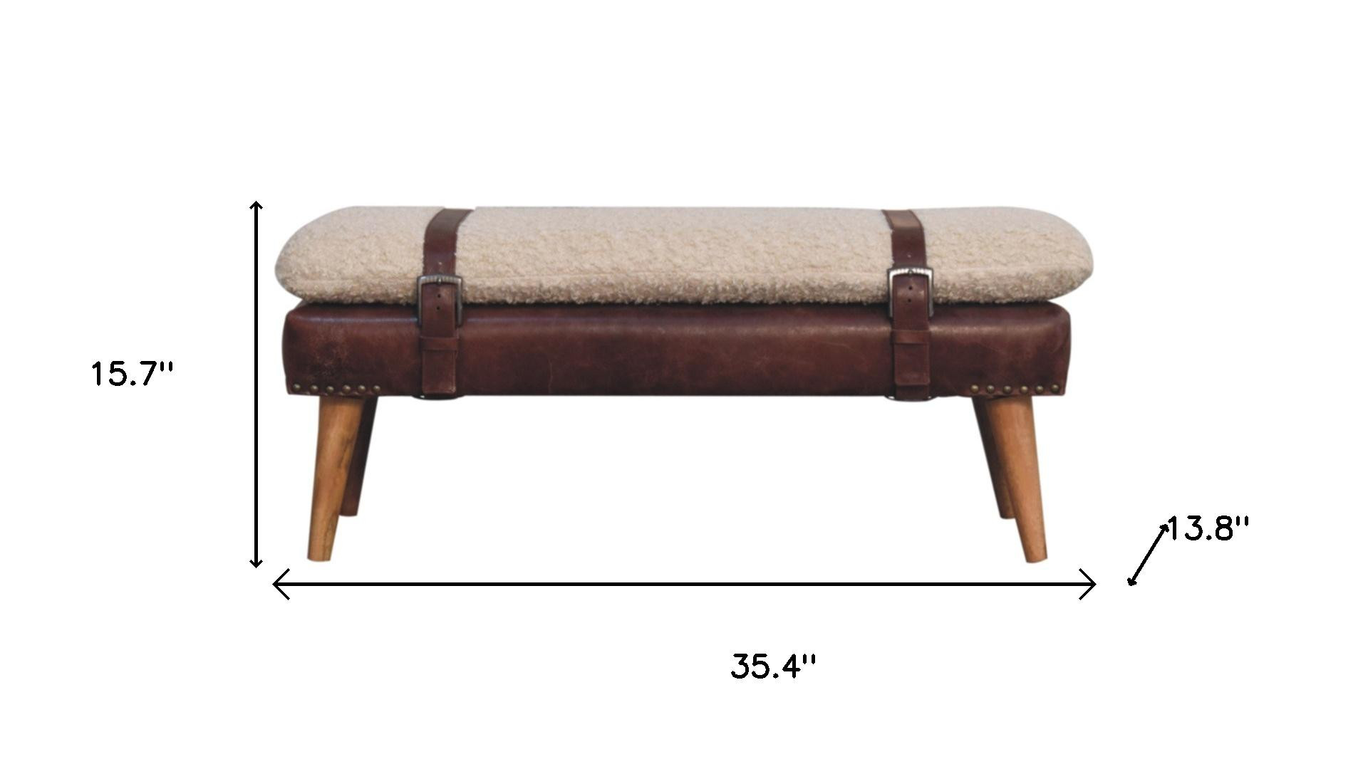 Distinctive in style the 35-inch brown genuine leather and solid wood upholstered storage bench with cabinet radiates a versatile charm. A brown coloration runs throughout this good looking solid wood and upholstery bench. Expertly upholstered with padding in a soft solid color genuine leather, this bench is as comfortable as it is good looking. This multi-function bench features a cabinet area in addition to seating to help keep your space neat and tidy. An included back gives this bench an extra opportunity to keep you supported and comfortable. Ideal for entrance foyer, hallway, or laundry room. This bench is a great place store your keys, put on your shoes, or be a catchall on your way in or out. Easy to blend into most any room, a bench is a way to add a good looking accent to your space that can also be practical and useful. 15.70-inch h x 35.40-inch w x 13.80-inch d.