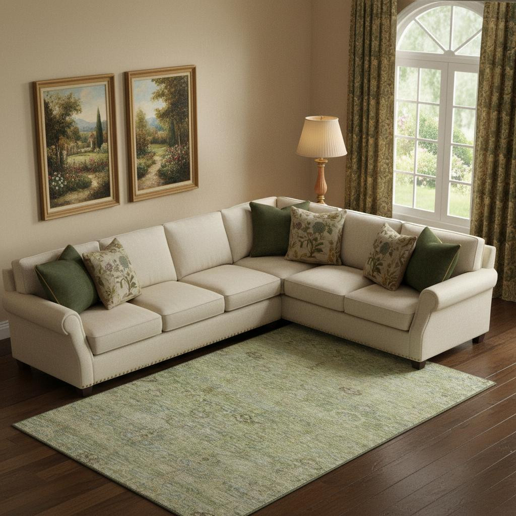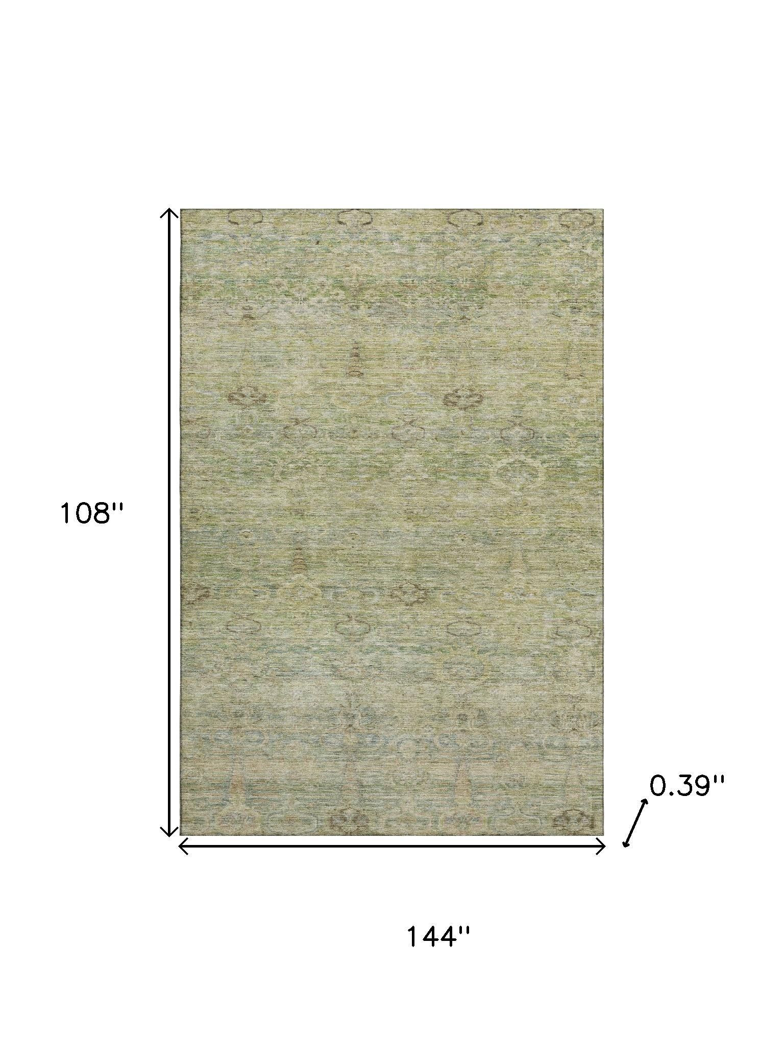 This 9-foot x 12-foot green and beige abstract washable area rug with uv protection, is a great way to add warmth to a room. Ideal for spaces with kids and pets, this rug is stain resistant to help repel dirt and spilled liquids. Built to last, this rug crafted from polyester fibers is known for its durability and long lasting appeal. Rugs are a great way to showcase your style, hide imperfections, warm your home and reduce noise. This larger sized, traditional styled rug is ready to create a focal point or statement piece in your room. 108.00-inch h x 144.00-inch w x 0.39-inch d.