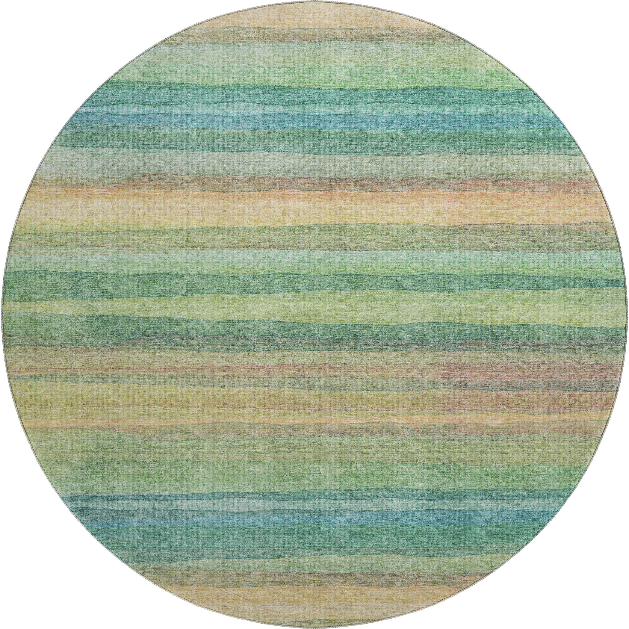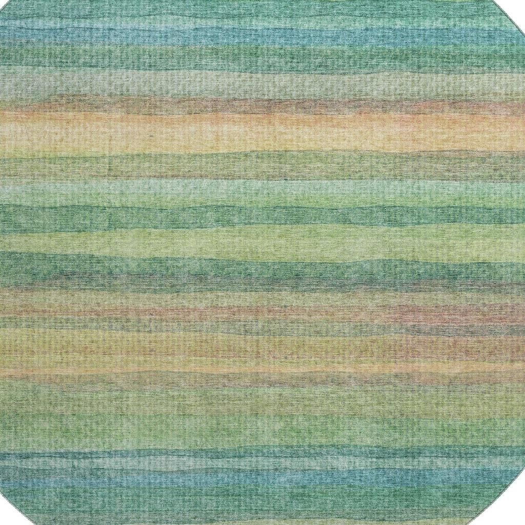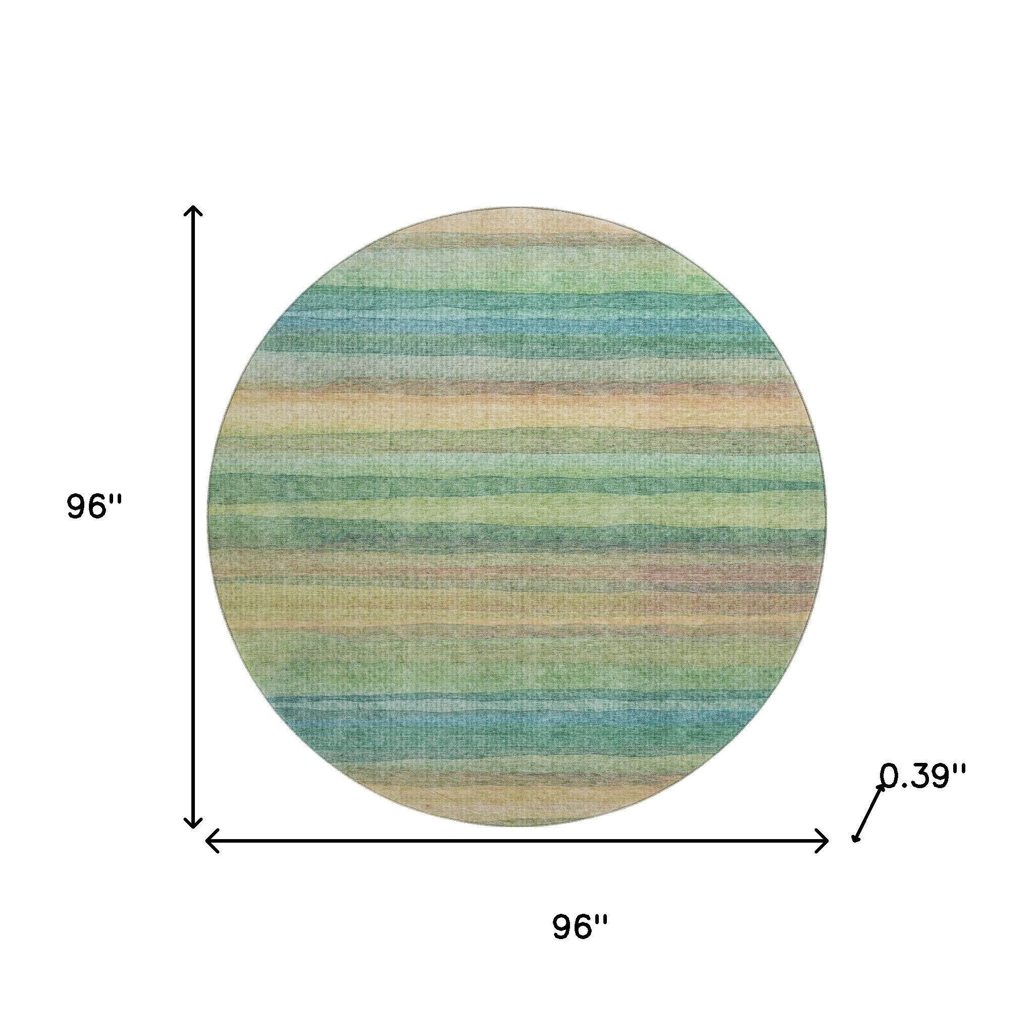 This 8-foot sage and peach striped washable round rug with uv protection, is a great way to add warmth to a room. Ideal for spaces with kids and pets, this rug is stain resistant to help repel dirt and spilled liquids. Built to last, this rug crafted from polyester fibers is known for its durability and long lasting appeal. Rugs are a great way to showcase your style, hide imperfections, warm your home and reduce noise. This larger sized, transitional styled rug is ready to create a focal point or statement piece in your room. 96.00-inch h x 96.00-inch w x 0.39-inch d.