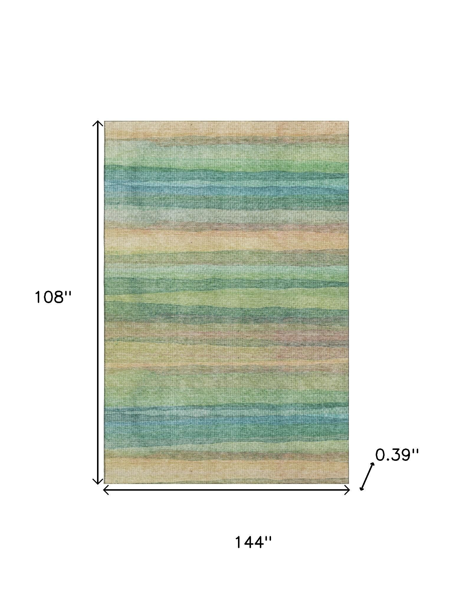 Add great coloration and comfortable texture to your space with this 9-foot x 12-foot sage and peach striped washable area rug with uv protection. Ideal for spaces with kids and pets, this rug is stain resistant to help repel dirt and spilled liquids. Built to last, this rug crafted from polyester fibers is known for its durability and long lasting appeal. Rugs are a great way to showcase your style, hide imperfections, warm your home and reduce noise. This larger sized, transitional styled rug is ready to create a focal point or statement piece in your room. 108.00-inch h x 144.00-inch w x 0.39-inch d.