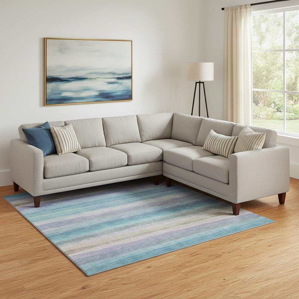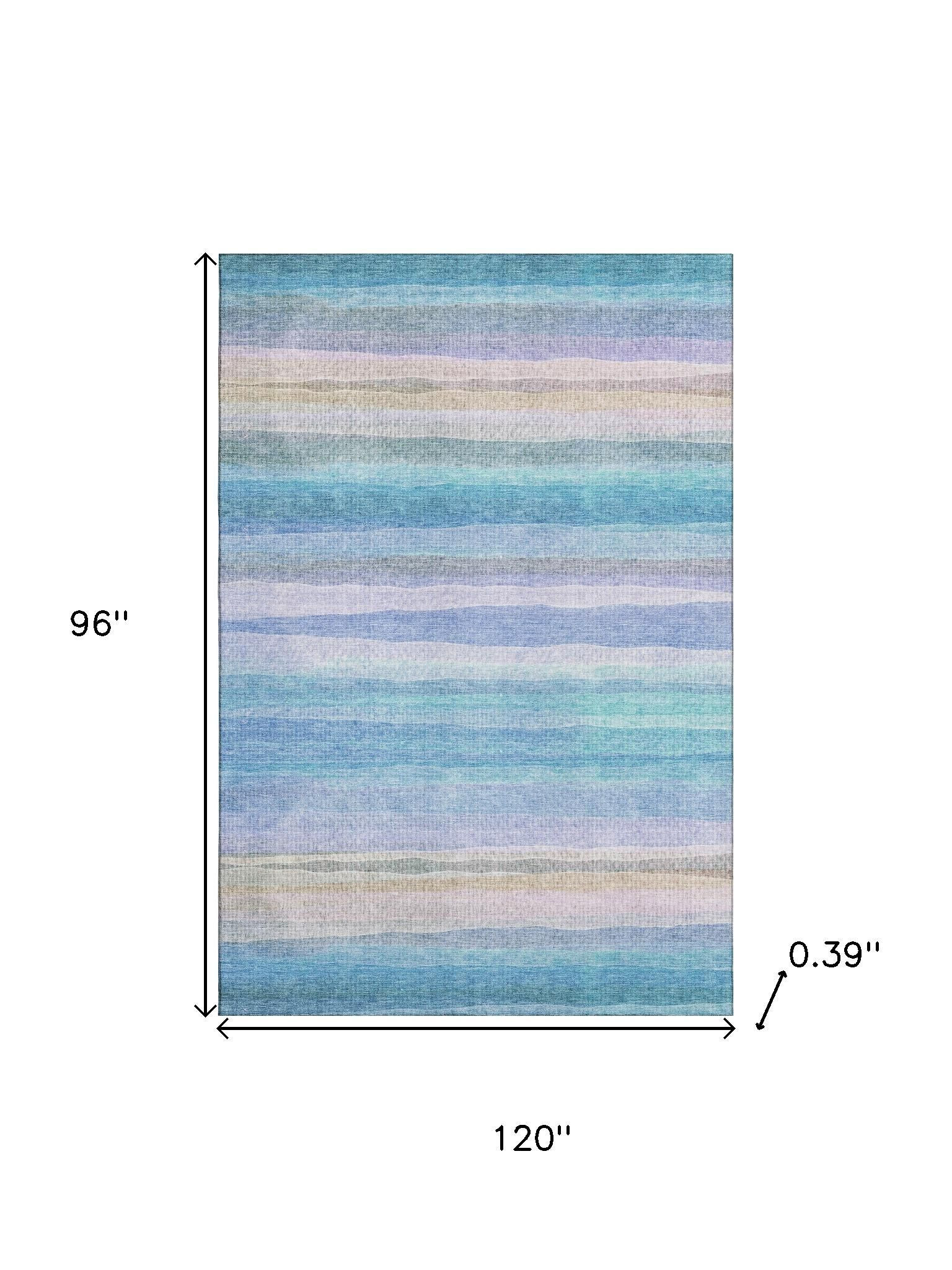 Add some artistry to your room with this 8-foot x 10-foot aqua and lavender striped washable area rug with uv protection. Ideal for spaces with kids and pets, this rug is stain resistant to help repel dirt and spilled liquids. Built to last, this rug crafted from polyester fibers is known for its durability and long lasting appeal. Rugs are a great way to showcase your style, hide imperfections, warm your home and reduce noise. This larger sized, transitional styled rug is ready to create a focal point or statement piece in your room. 96.00-inch h x 120.00-inch w x 0.39-inch d.