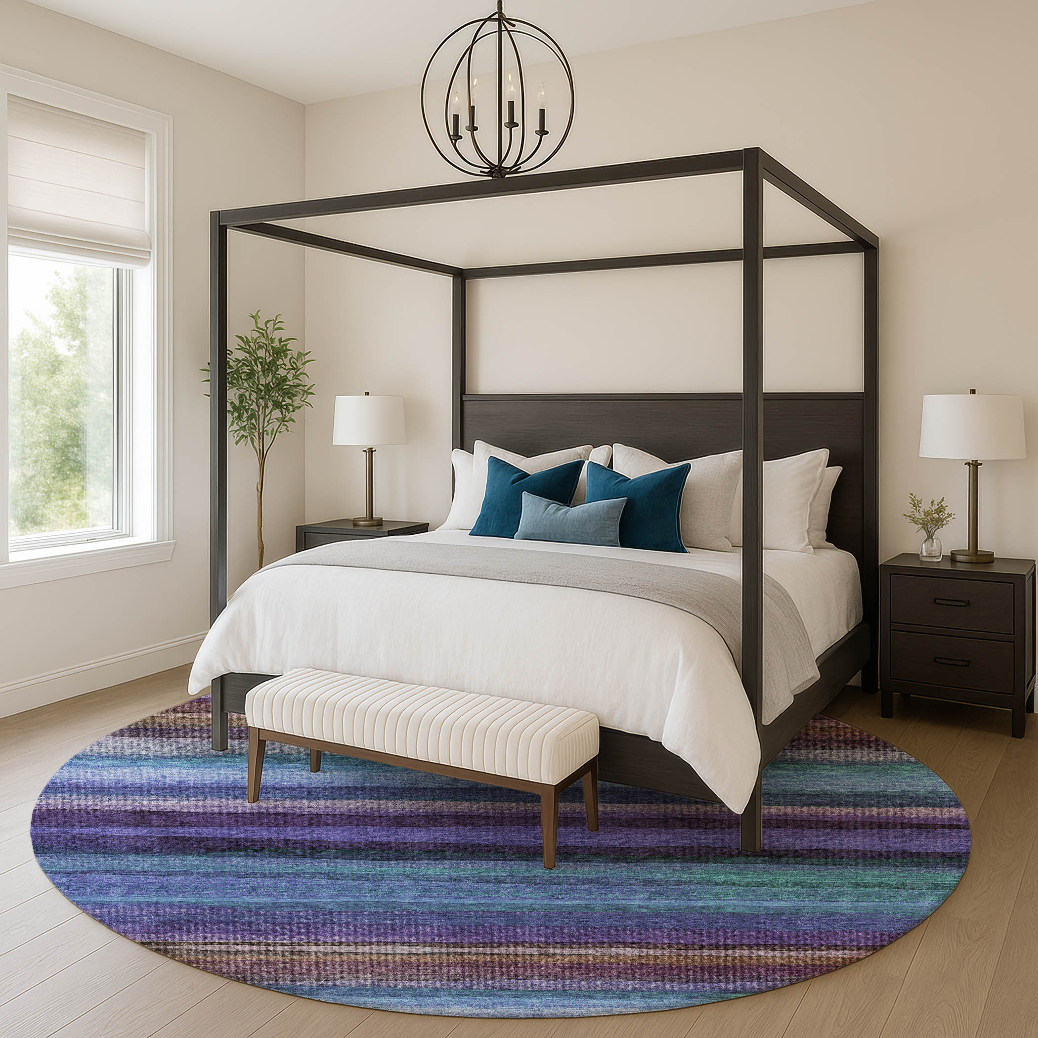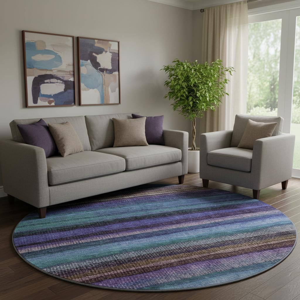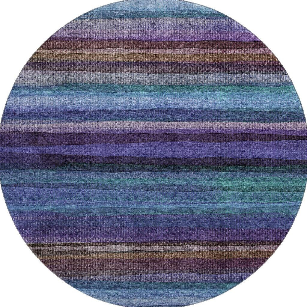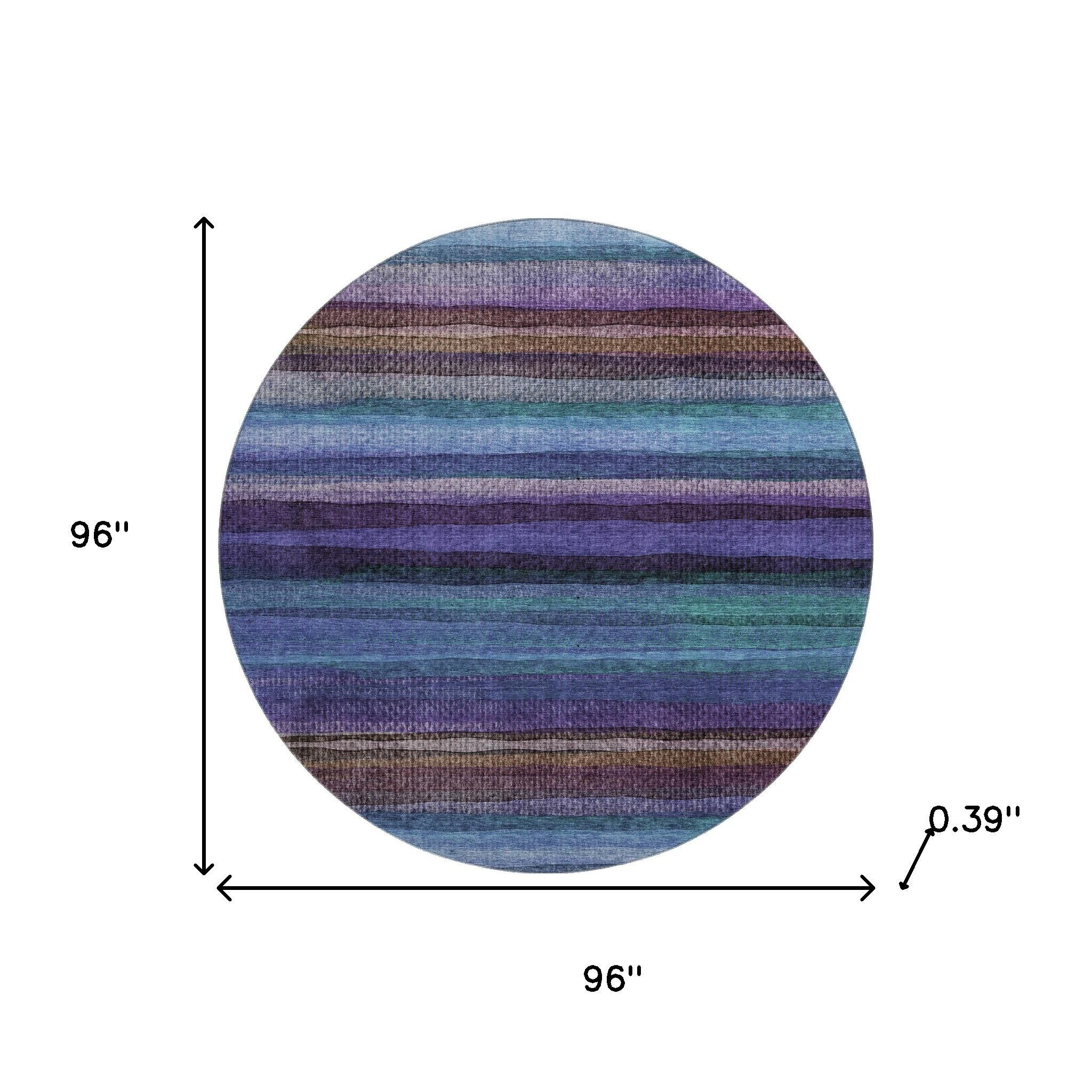 Set an inviting tone in your space with this 8-foot blue and purple striped washable round rug with uv protection. Ideal for spaces with kids and pets, this rug is stain resistant to help repel dirt and spilled liquids. Built to last, this rug crafted from polyester fibers is known for its durability and long lasting appeal. Rugs are a great way to showcase your style, hide imperfections, warm your home and reduce noise. This larger sized, transitional styled rug is ready to create a focal point or statement piece in your room. 96.00-inch h x 96.00-inch w x 0.39-inch d.