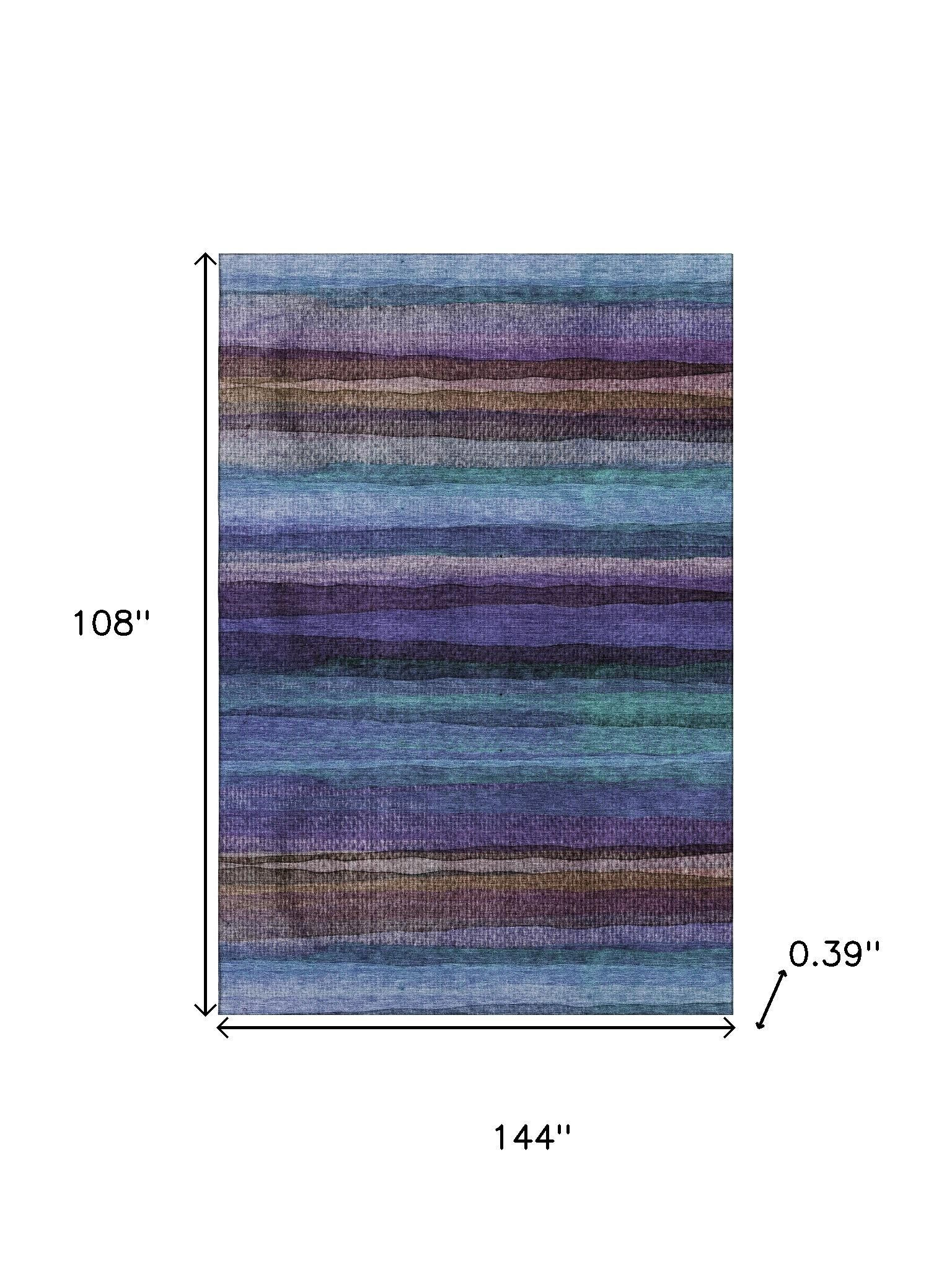 Add great coloration and comfortable texture to your space with this 9-foot x 12-foot blue and purple striped washable area rug with uv protection. Ideal for spaces with kids and pets, this rug is stain resistant to help repel dirt and spilled liquids. Built to last, this rug crafted from polyester fibers is known for its durability and long lasting appeal. Rugs are a great way to showcase your style, hide imperfections, warm your home and reduce noise. This larger sized, transitional styled rug is ready to create a focal point or statement piece in your room. 108.00-inch h x 144.00-inch w x 0.39-inch d.