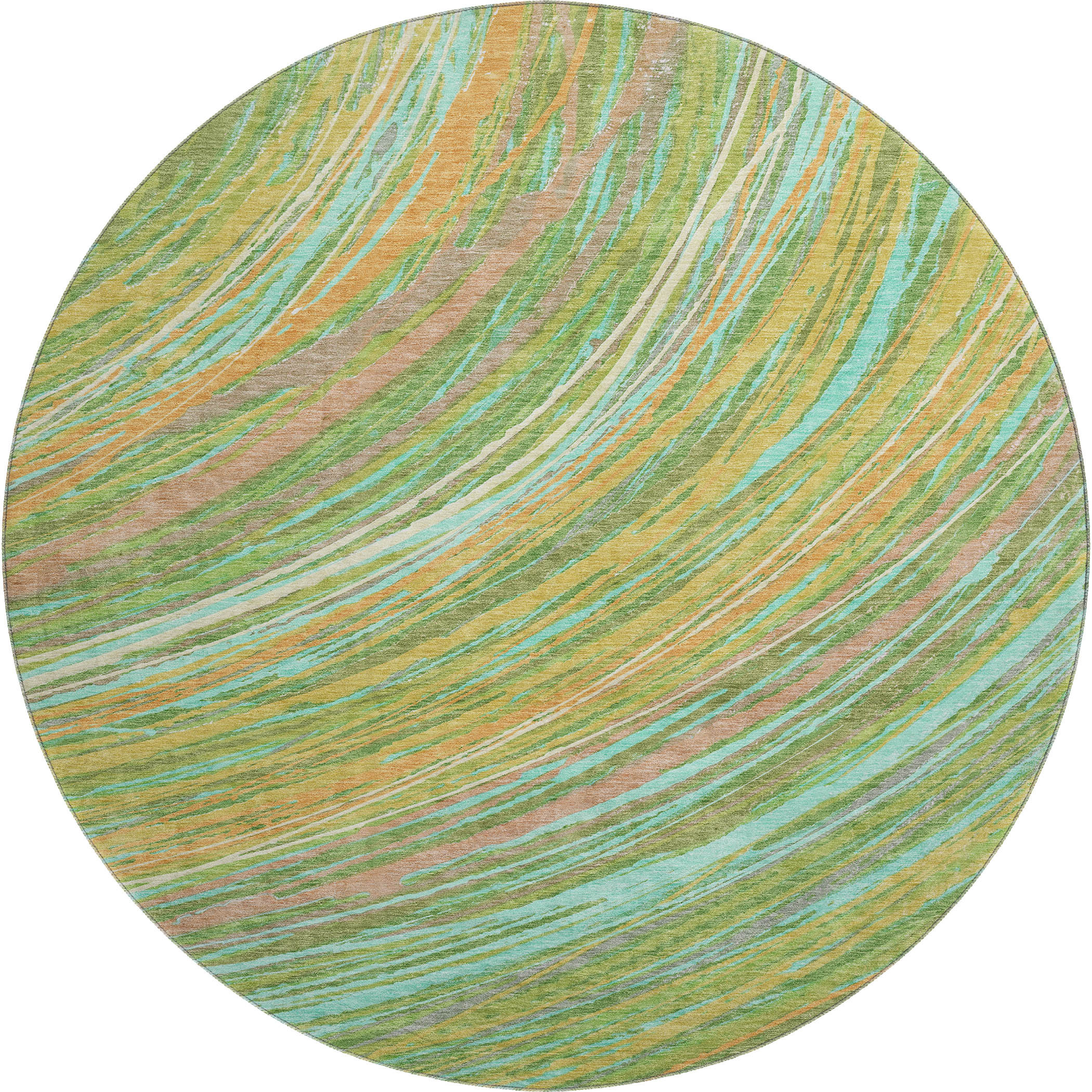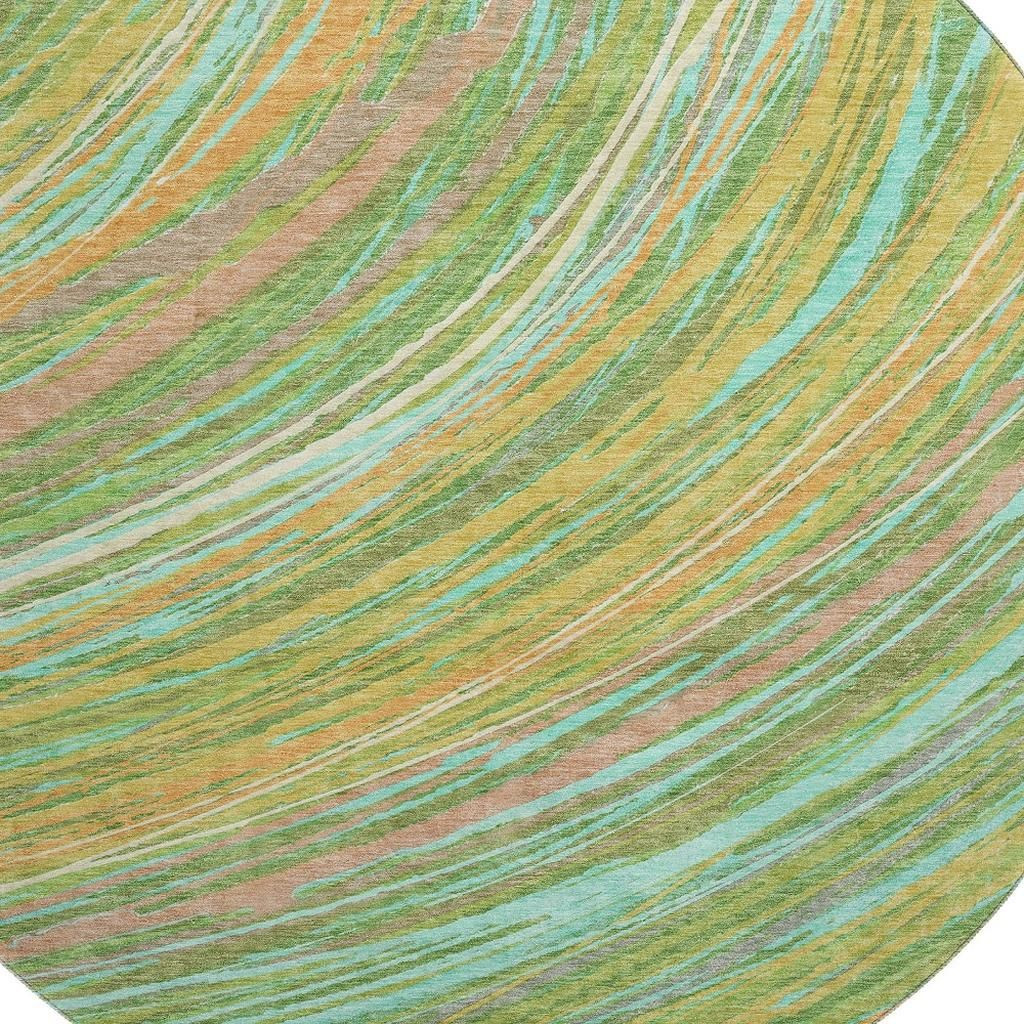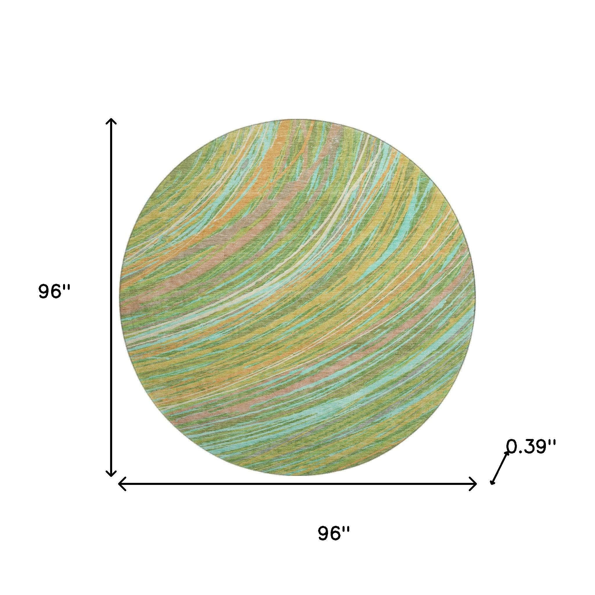 Set an inviting tone in your space with this 8-foot green and peach abstract washable round rug with uv protection. Ideal for spaces with kids and pets, this rug is stain resistant to help repel dirt and spilled liquids. Built to last, this rug crafted from polyester fibers is known for its durability and long lasting appeal. Rugs are a great way to showcase your style, hide imperfections, warm your home and reduce noise. This larger sized, transitional styled rug is ready to create a focal point or statement piece in your room. 96.00-inch h x 96.00-inch w x 0.39-inch d.