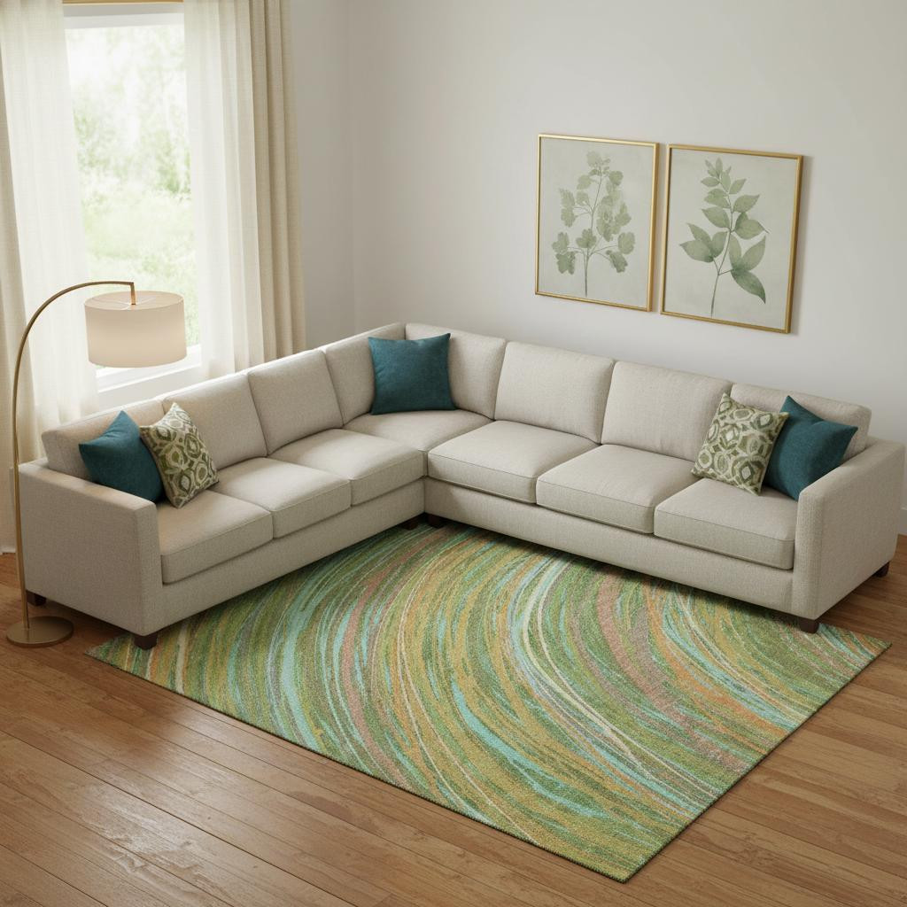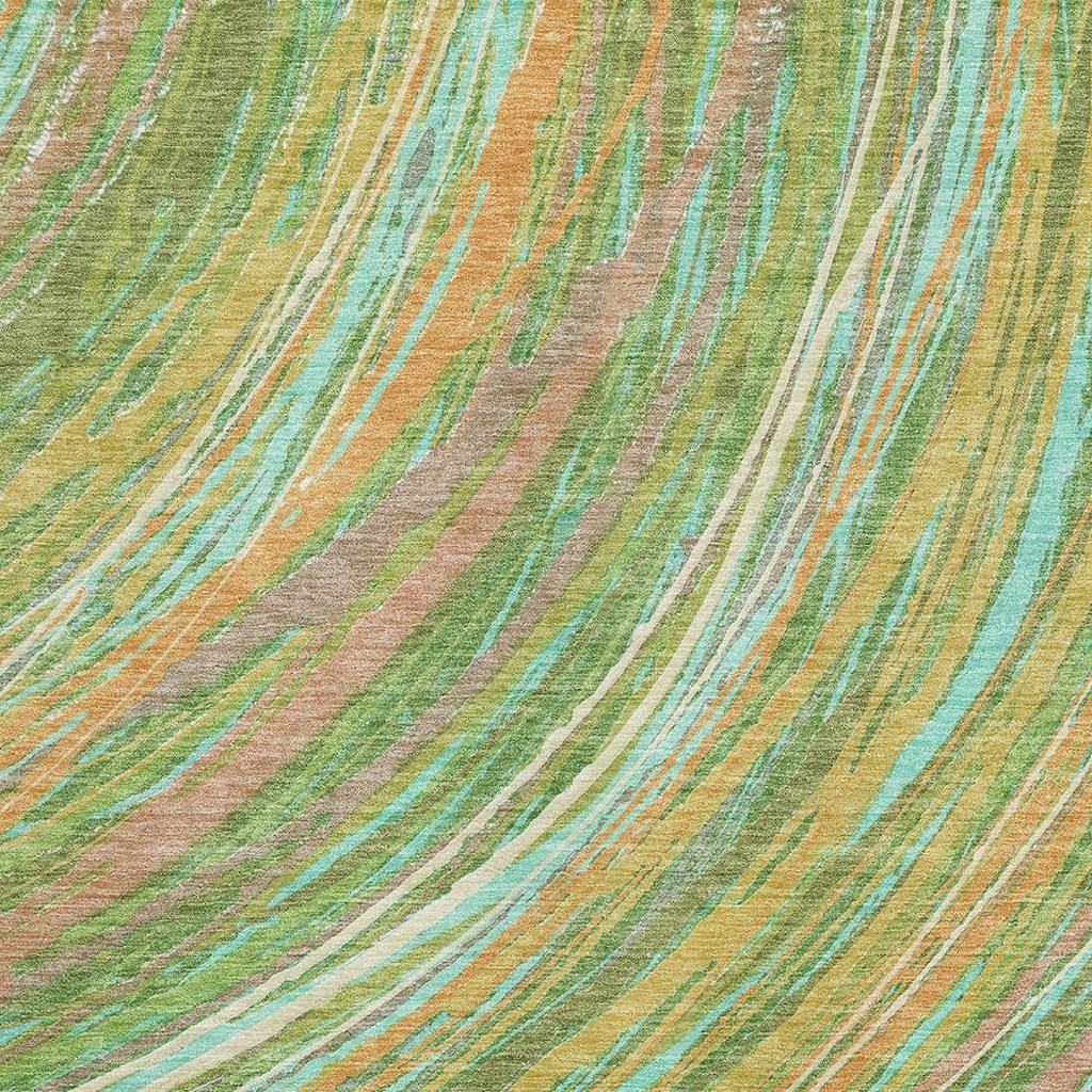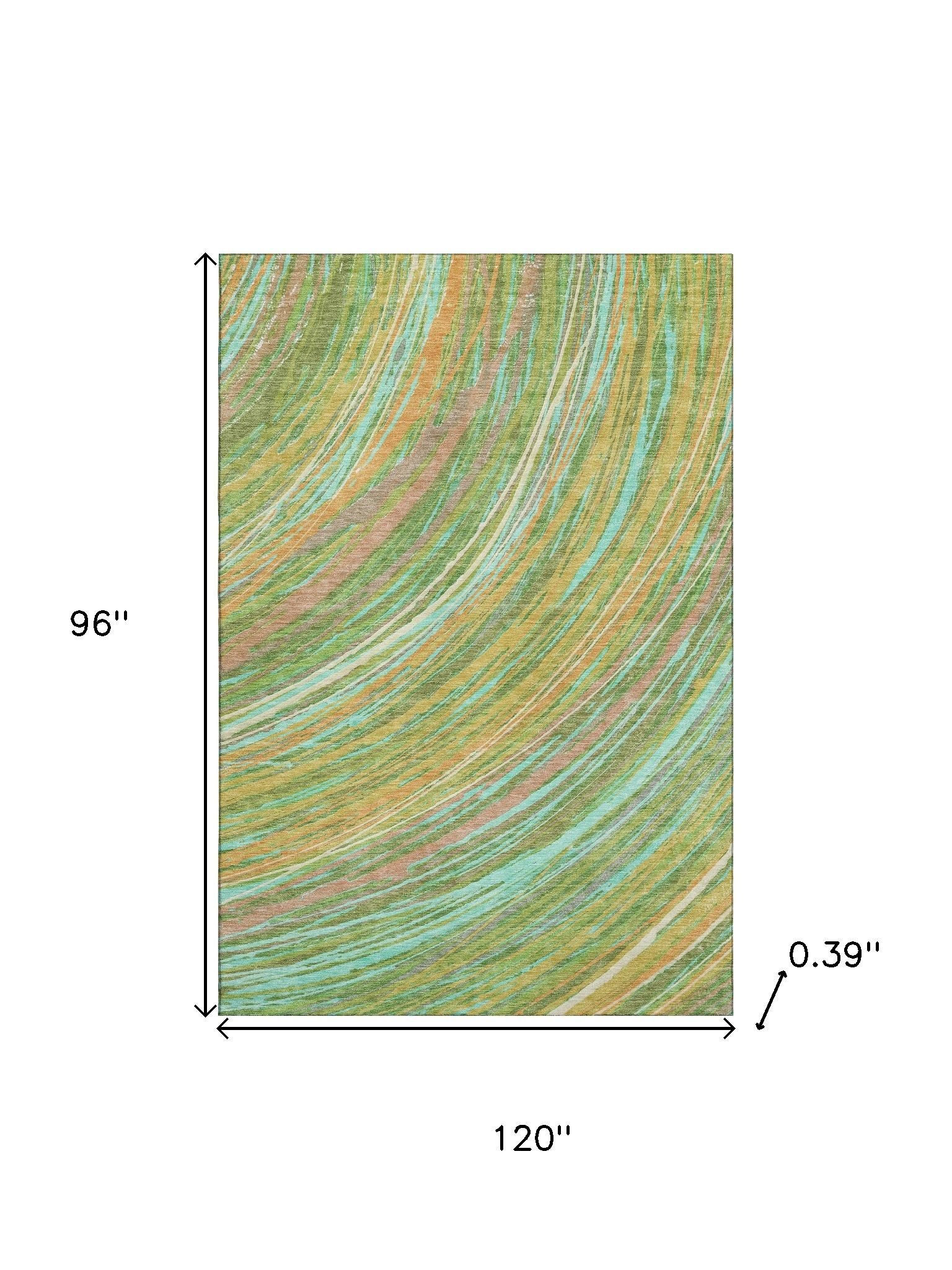 This 8-foot x 10-foot green and peach abstract washable area rug with uv protection, is a great way to add warmth to a room. Ideal for spaces with kids and pets, this rug is stain resistant to help repel dirt and spilled liquids. Built to last, this rug crafted from polyester fibers is known for its durability and long lasting appeal. Rugs are a great way to showcase your style, hide imperfections, warm your home and reduce noise. This larger sized, transitional styled rug is ready to create a focal point or statement piece in your room. 96.00-inch h x 120.00-inch w x 0.39-inch d.