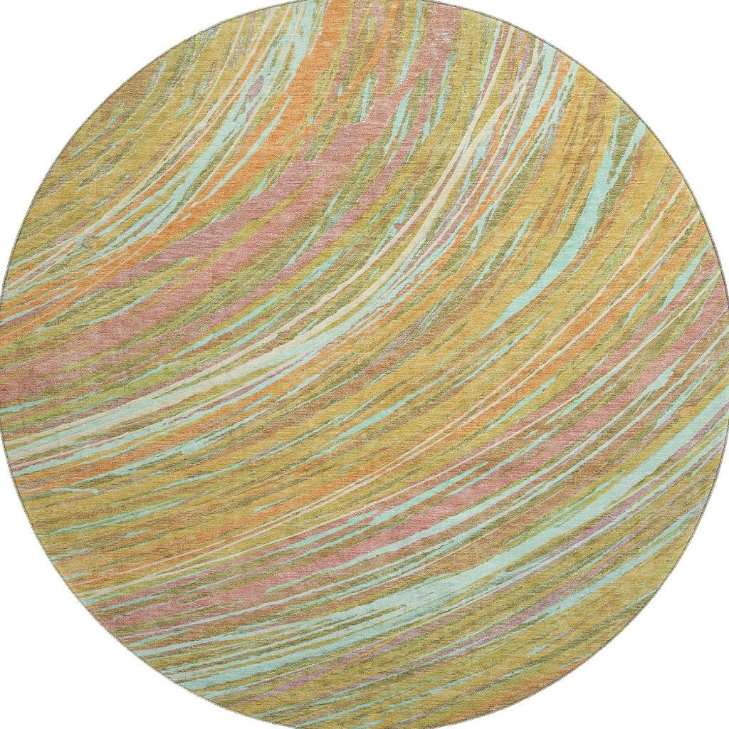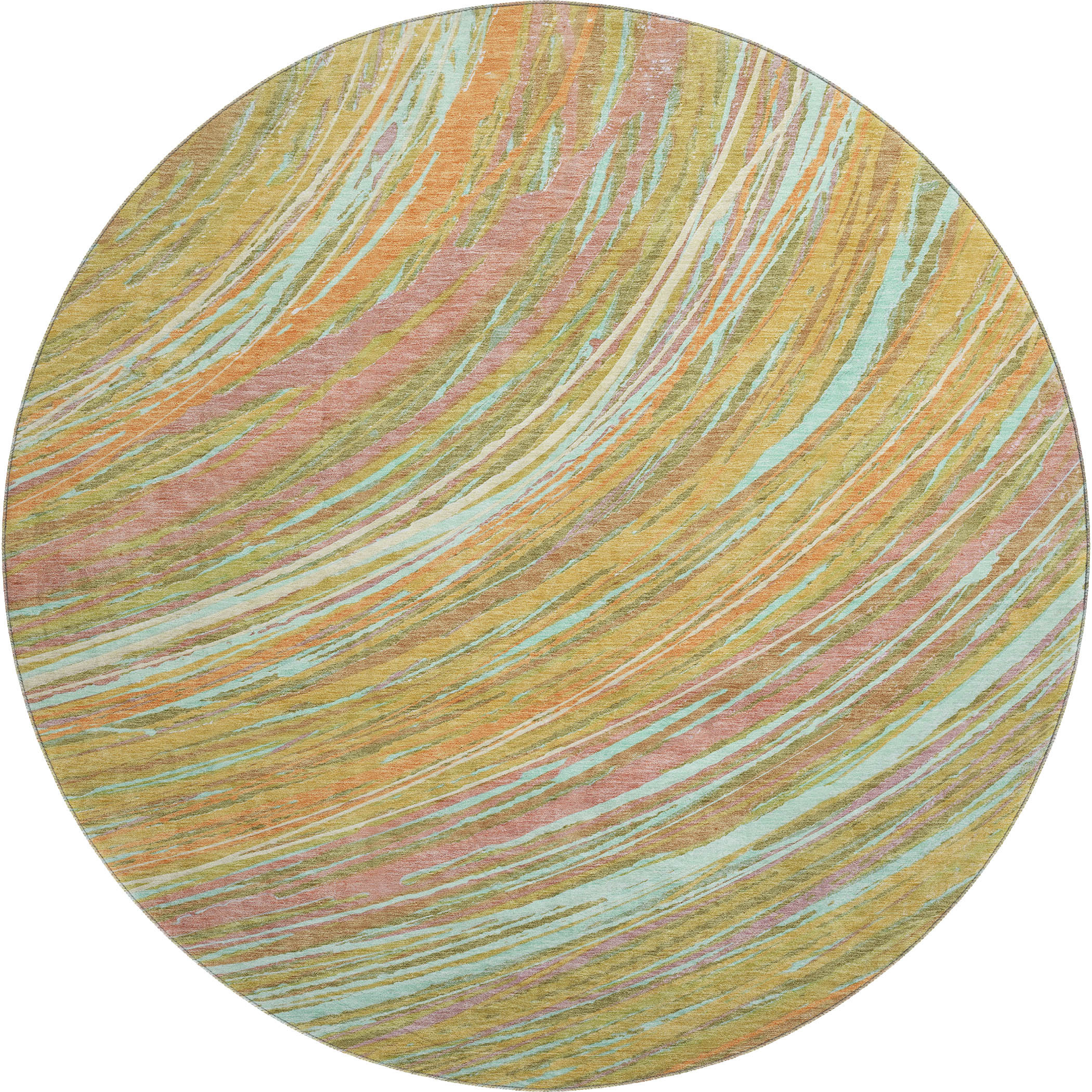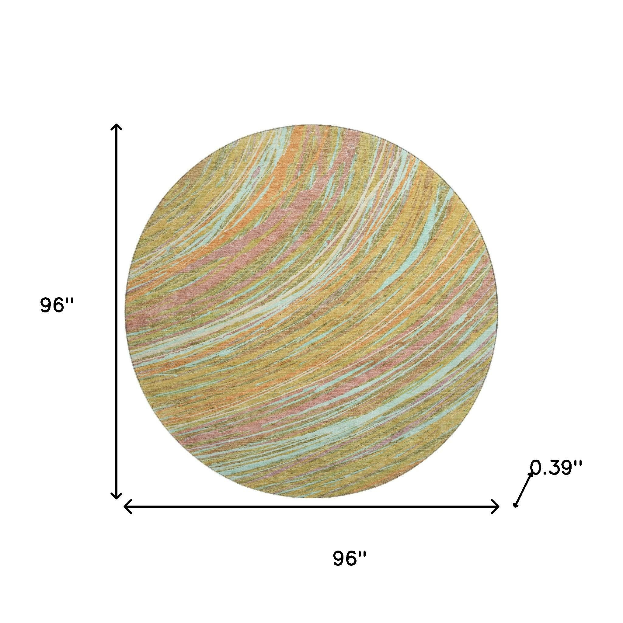 Add some artistry to your room with this 8-foot gold and copper abstract washable round rug with uv protection. Ideal for spaces with kids and pets, this rug is stain resistant to help repel dirt and spilled liquids. Built to last, this rug crafted from polyester fibers is known for its durability and long lasting appeal. Rugs are a great way to showcase your style, hide imperfections, warm your home and reduce noise. This larger sized, transitional styled rug is ready to create a focal point or statement piece in your room. 96.00-inch h x 96.00-inch w x 0.39-inch d.