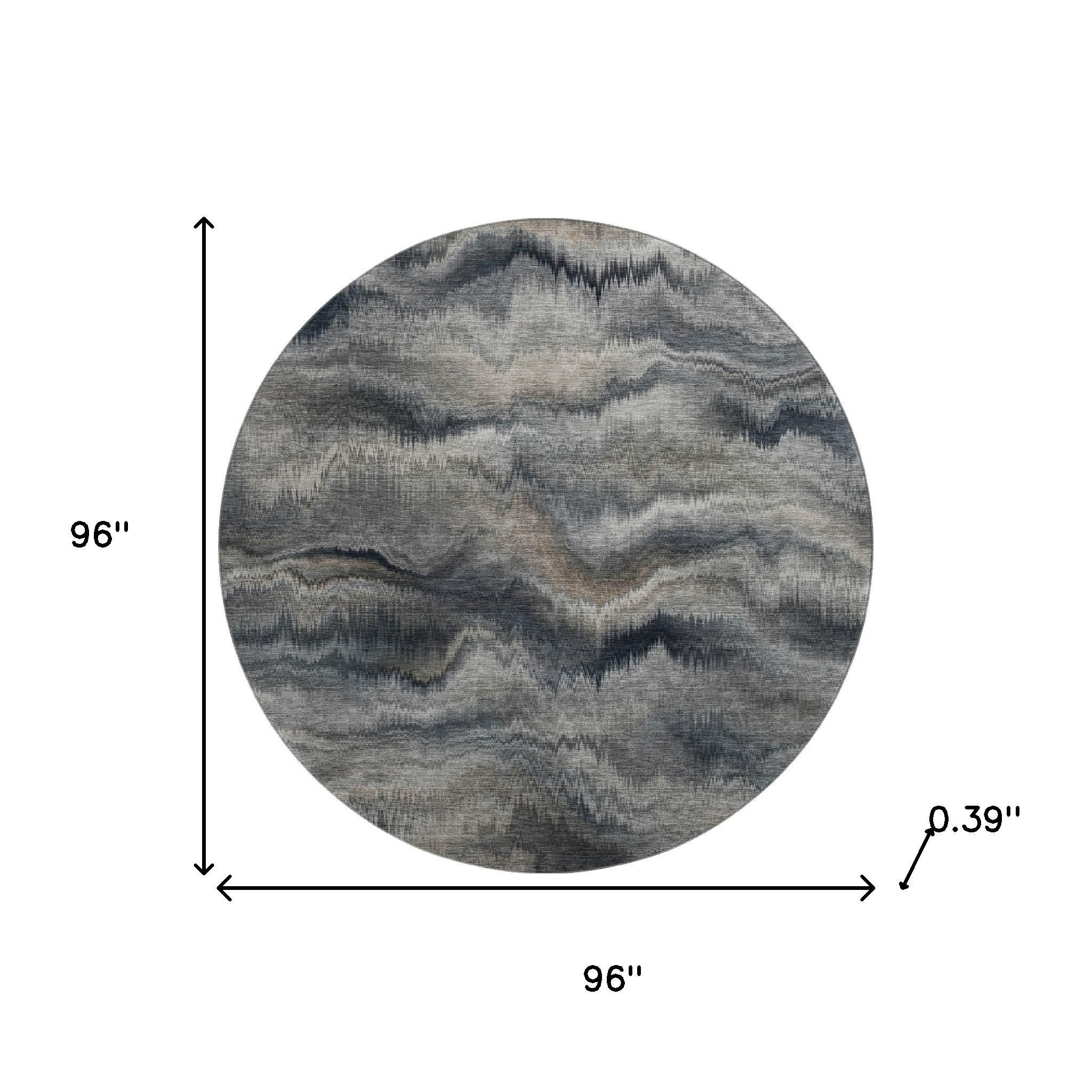 Add great coloration and comfortable texture to your space with this 8-foot gray and silver abstract washable round rug with uv protection. Ideal for spaces with kids and pets, this rug is stain resistant to help repel dirt and spilled liquids. Built to last, this rug crafted from polyester fibers is known for its durability and long lasting appeal. Rugs are a great way to showcase your style, hide imperfections, warm your home and reduce noise. This larger sized, transitional styled rug is ready to create a focal point or statement piece in your room. 96.00-inch h x 96.00-inch w x 0.39-inch d.