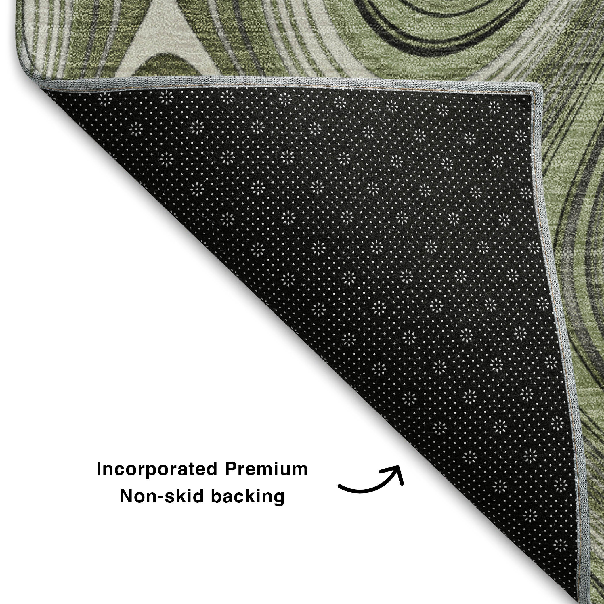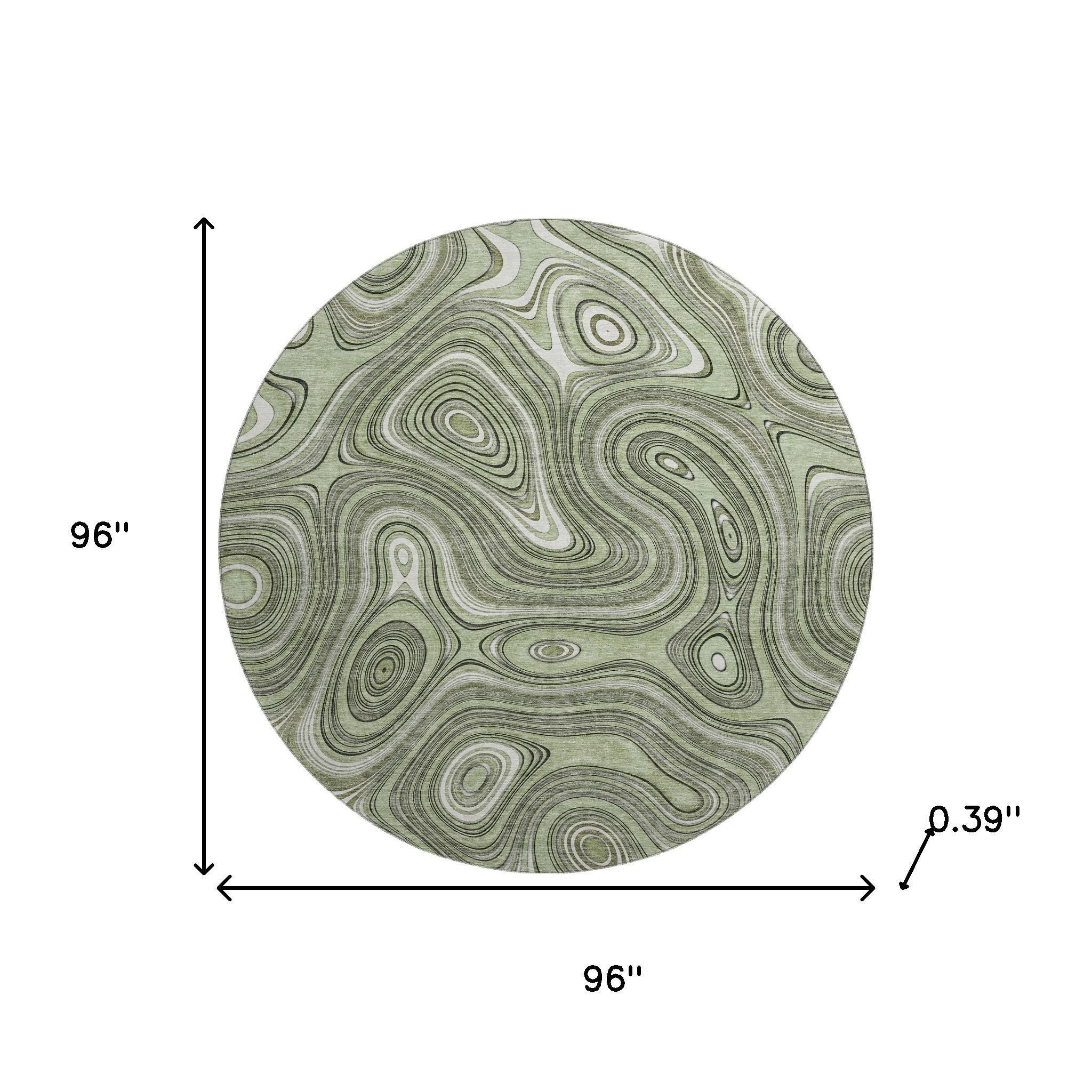 Add some artistry to your room with this 8-foot sage and ivory geometric washable round rug with uv protection. Ideal for spaces with kids and pets, this rug is stain resistant to help repel dirt and spilled liquids. Built to last, this rug crafted from polyester fibers is known for its durability and long lasting appeal. Rugs are a great way to showcase your style, hide imperfections, warm your home and reduce noise. This larger sized, transitional styled rug is ready to create a focal point or statement piece in your room. 96.00-inch h x 96.00-inch w x 0.39-inch d.