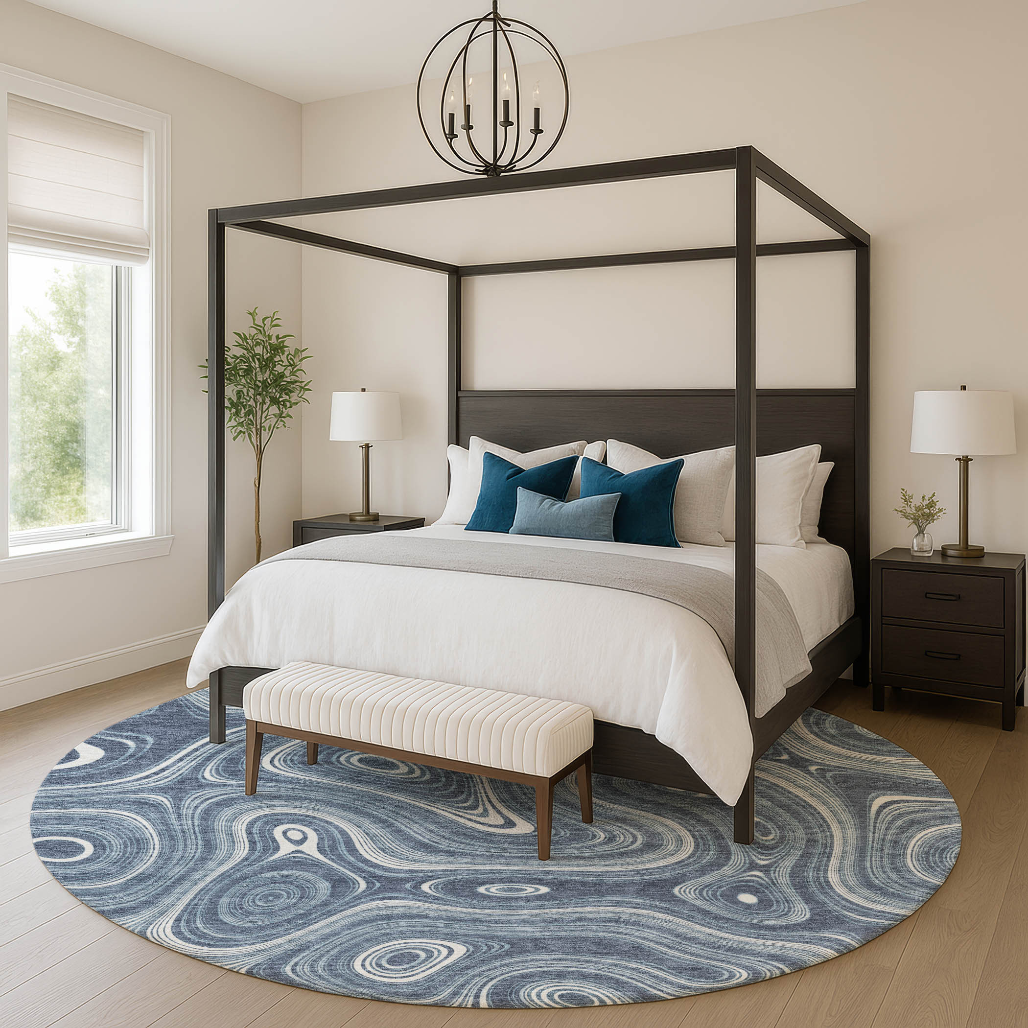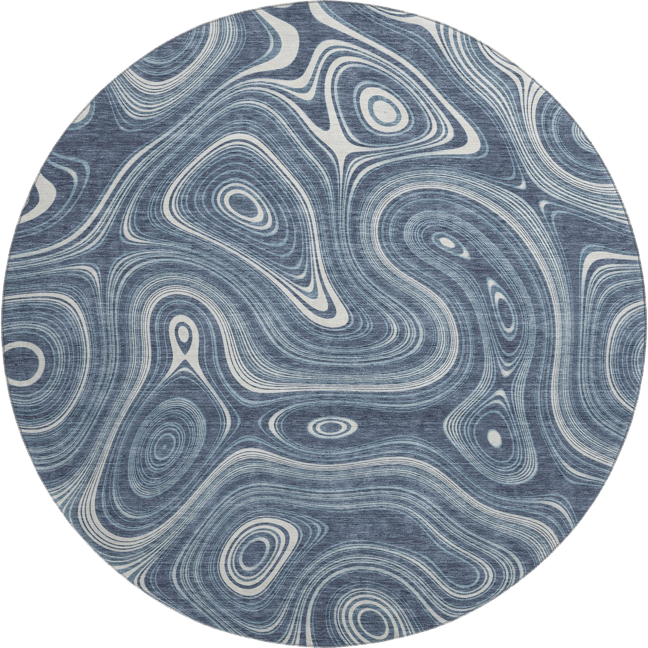 Add some artistry to your room with this 8-foot blue and ivory geometric washable round rug with uv protection. Ideal for spaces with kids and pets, this rug is stain resistant to help repel dirt and spilled liquids. Built to last, this rug crafted from polyester fibers is known for its durability and long lasting appeal. Rugs are a great way to showcase your style, hide imperfections, warm your home and reduce noise. This larger sized, transitional styled rug is ready to create a focal point or statement piece in your room. 96.00-inch h x 96.00-inch w x 0.39-inch d.