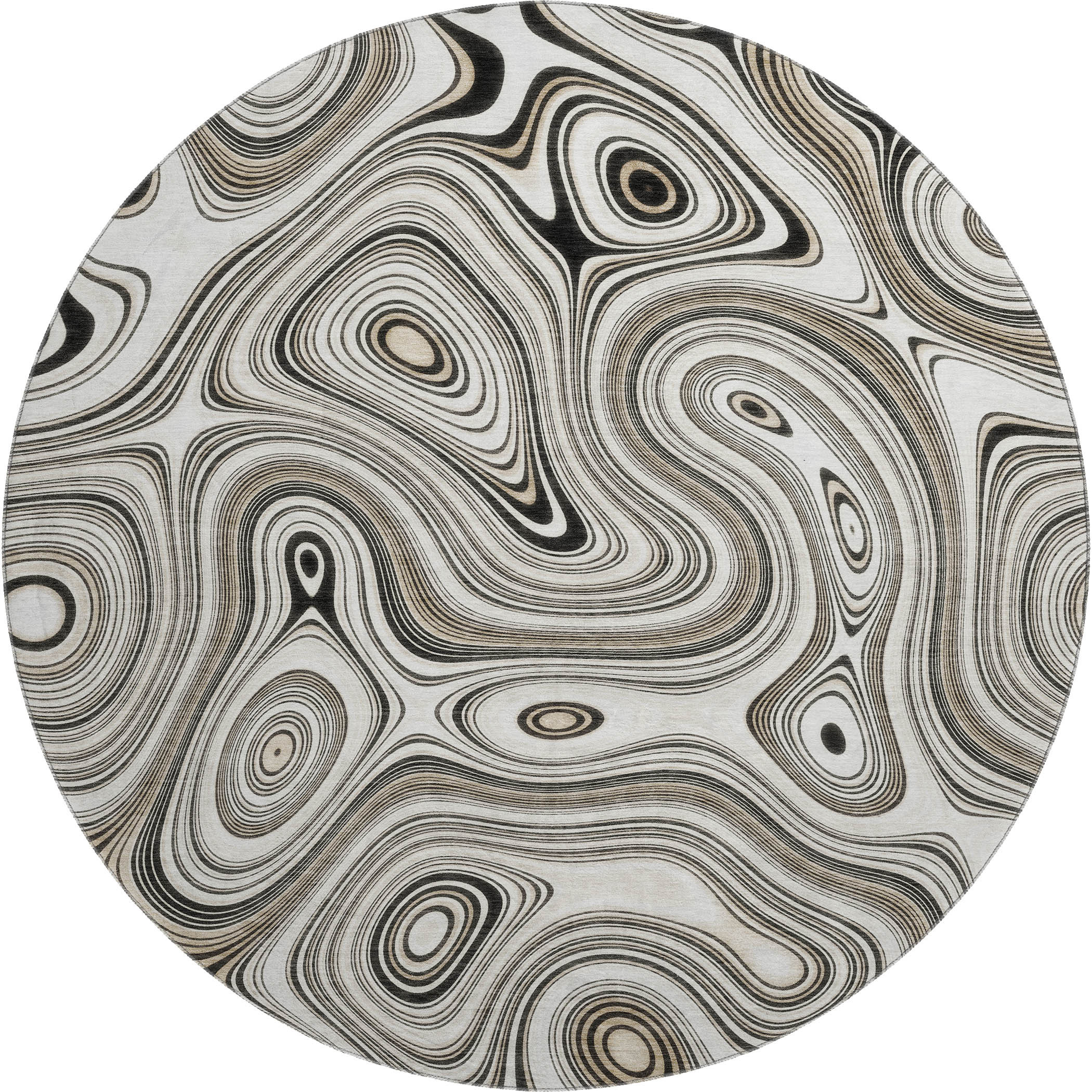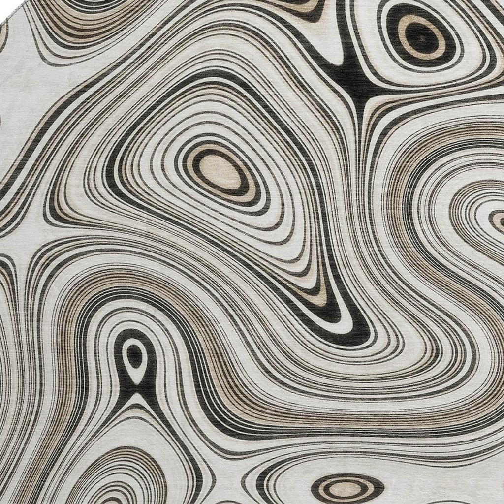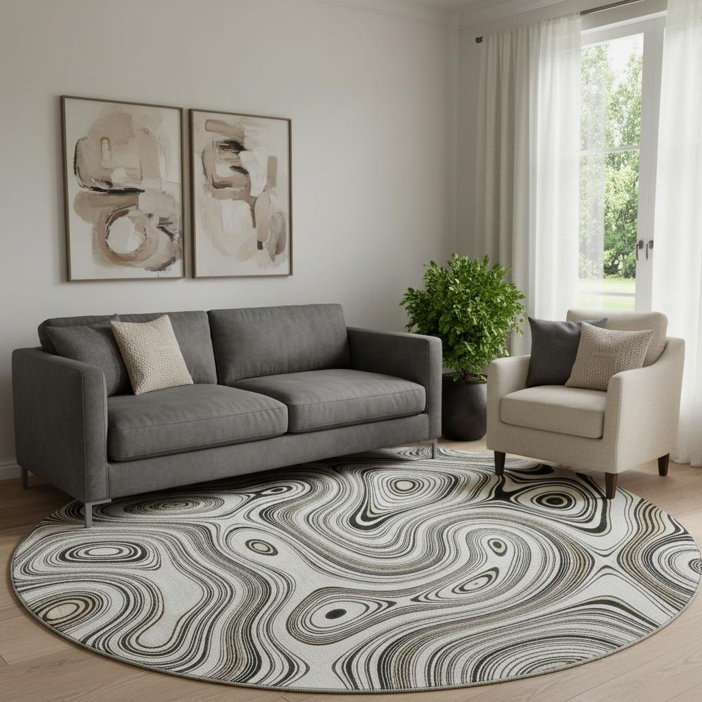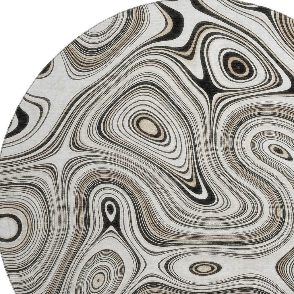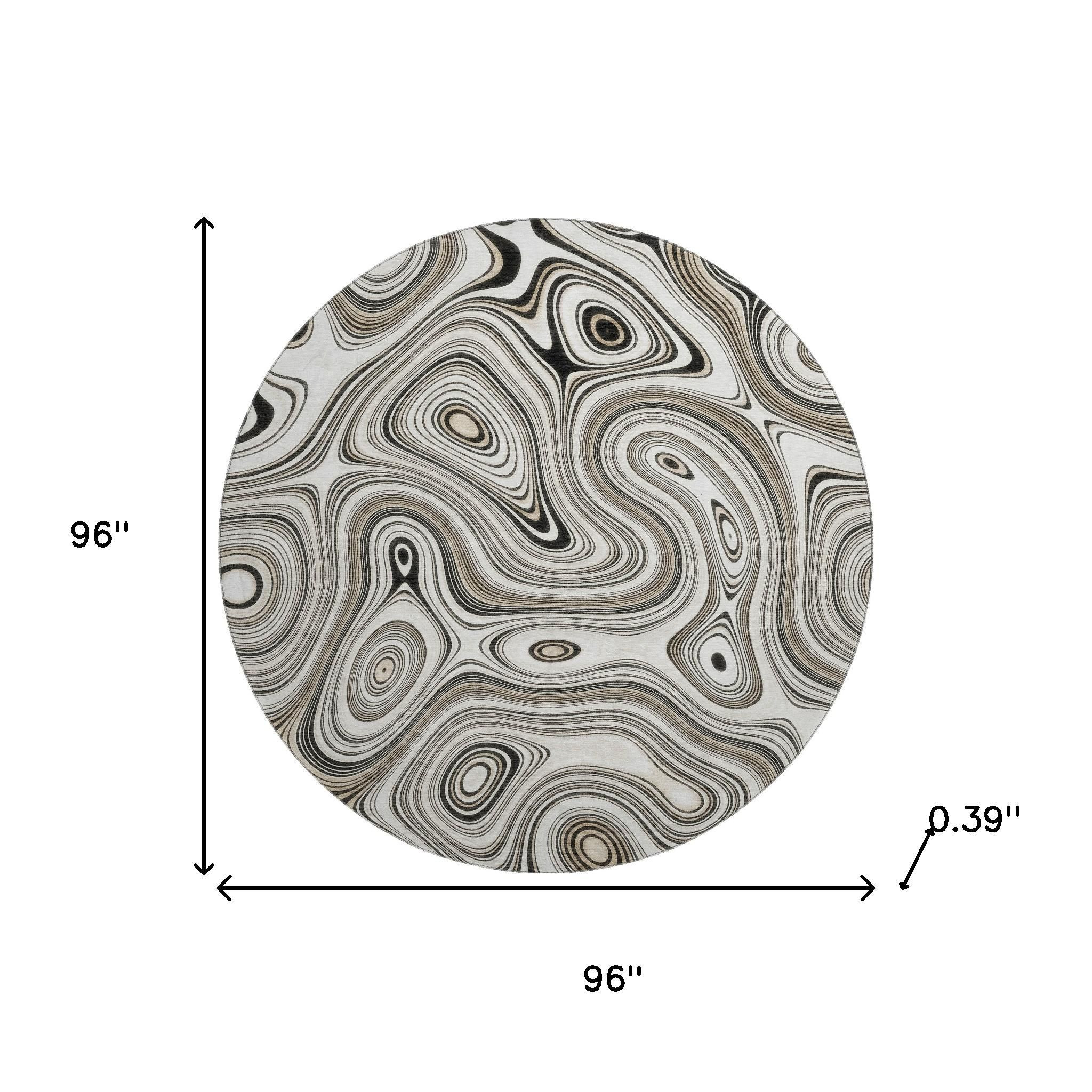 Set an inviting tone in your space with this 8-foot ivory and charcoal geometric washable round rug with uv protection. Ideal for spaces with kids and pets, this rug is stain resistant to help repel dirt and spilled liquids. Built to last, this rug crafted from polyester fibers is known for its durability and long lasting appeal. Rugs are a great way to showcase your style, hide imperfections, warm your home and reduce noise. This larger sized, transitional styled rug is ready to create a focal point or statement piece in your room. 96.00-inch h x 96.00-inch w x 0.39-inch d.