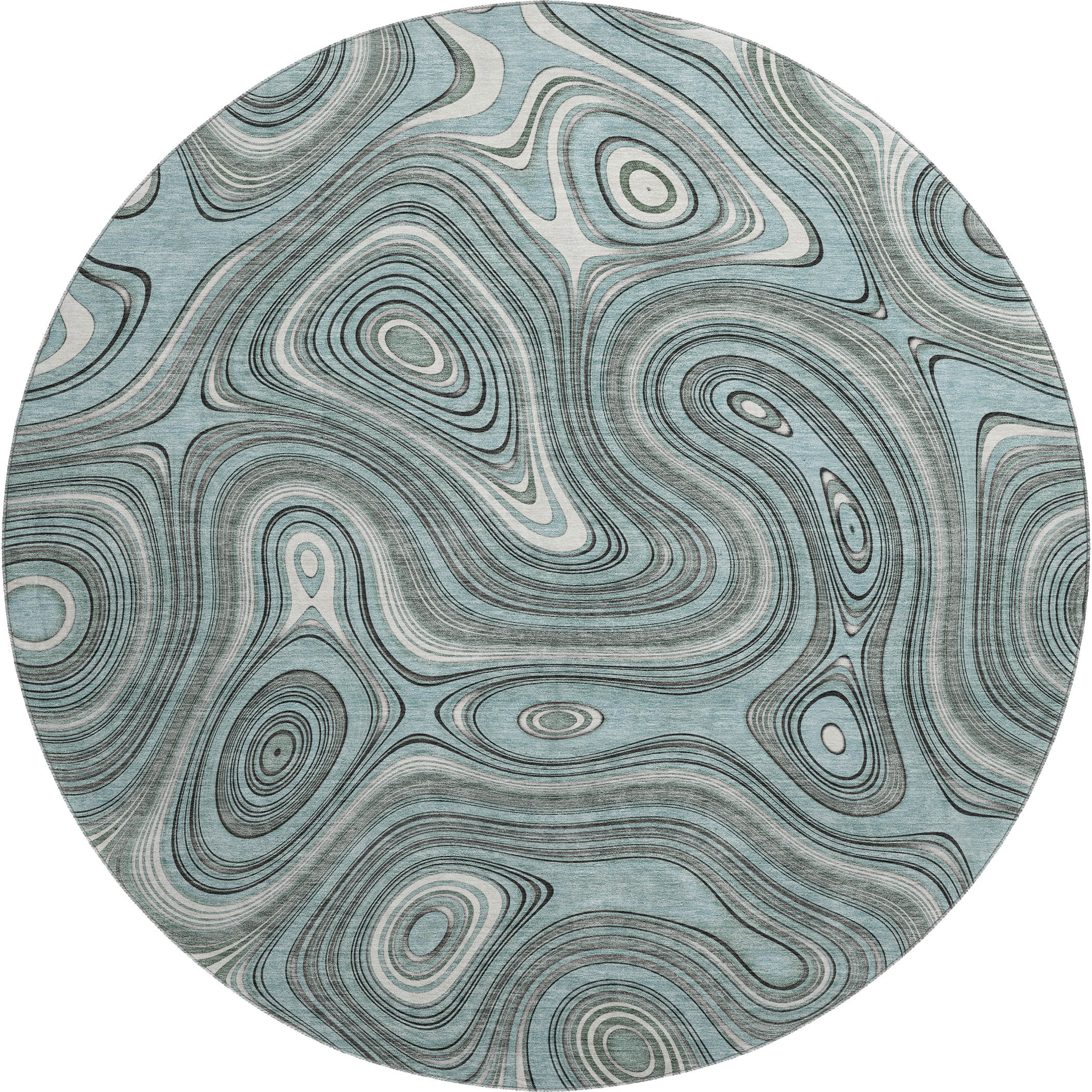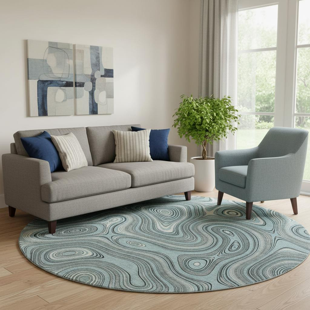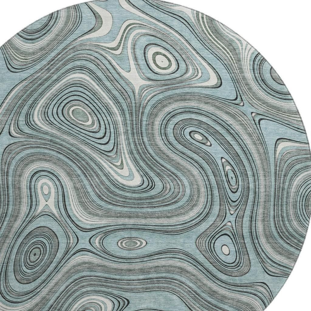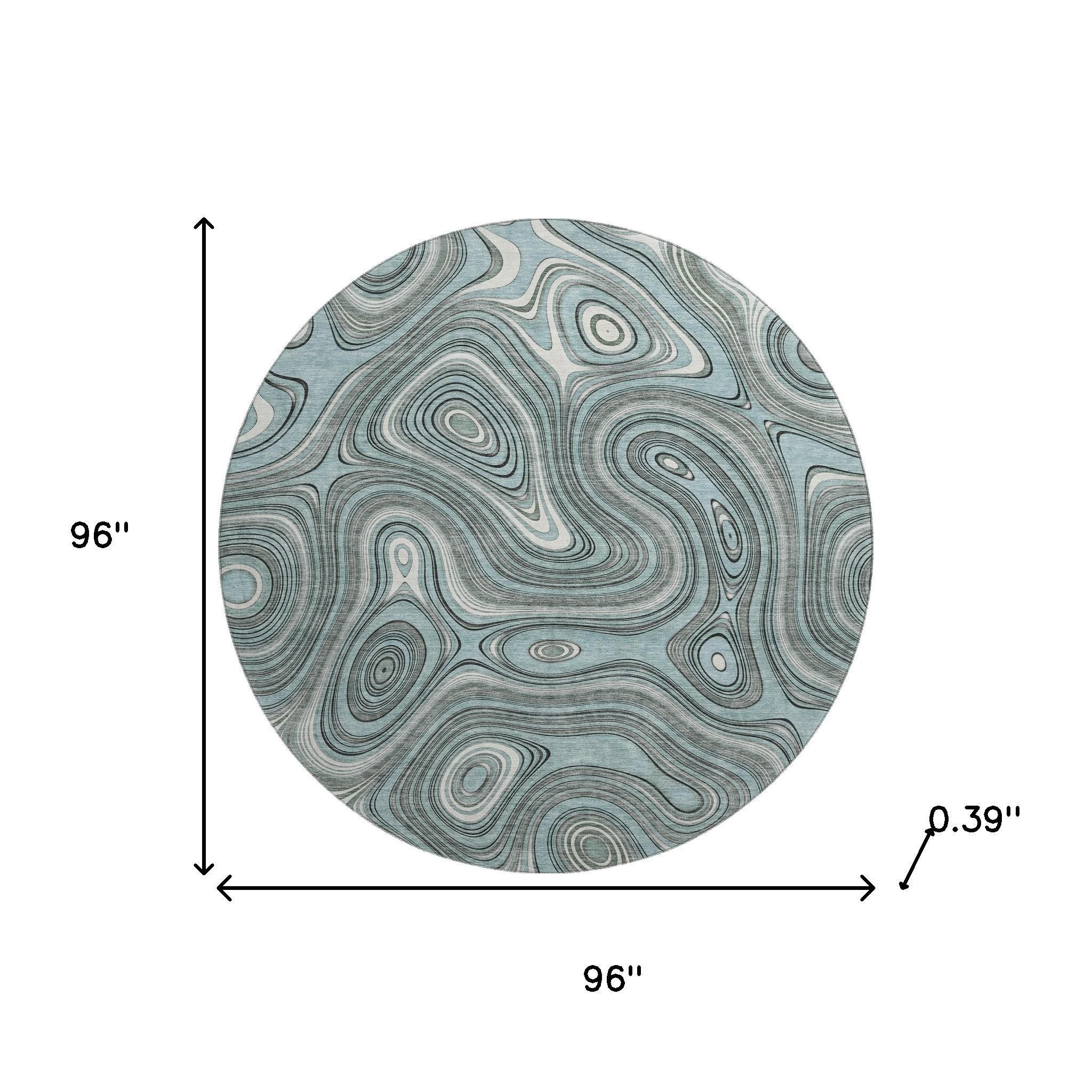 Add great coloration and comfortable texture to your space with this 8-foot sky blue and ivory geometric washable round rug with uv protection. Ideal for spaces with kids and pets, this rug is stain resistant to help repel dirt and spilled liquids. Built to last, this rug crafted from polyester fibers is known for its durability and long lasting appeal. Rugs are a great way to showcase your style, hide imperfections, warm your home and reduce noise. This larger sized, transitional styled rug is ready to create a focal point or statement piece in your room. 96.00-inch h x 96.00-inch w x 0.39-inch d.