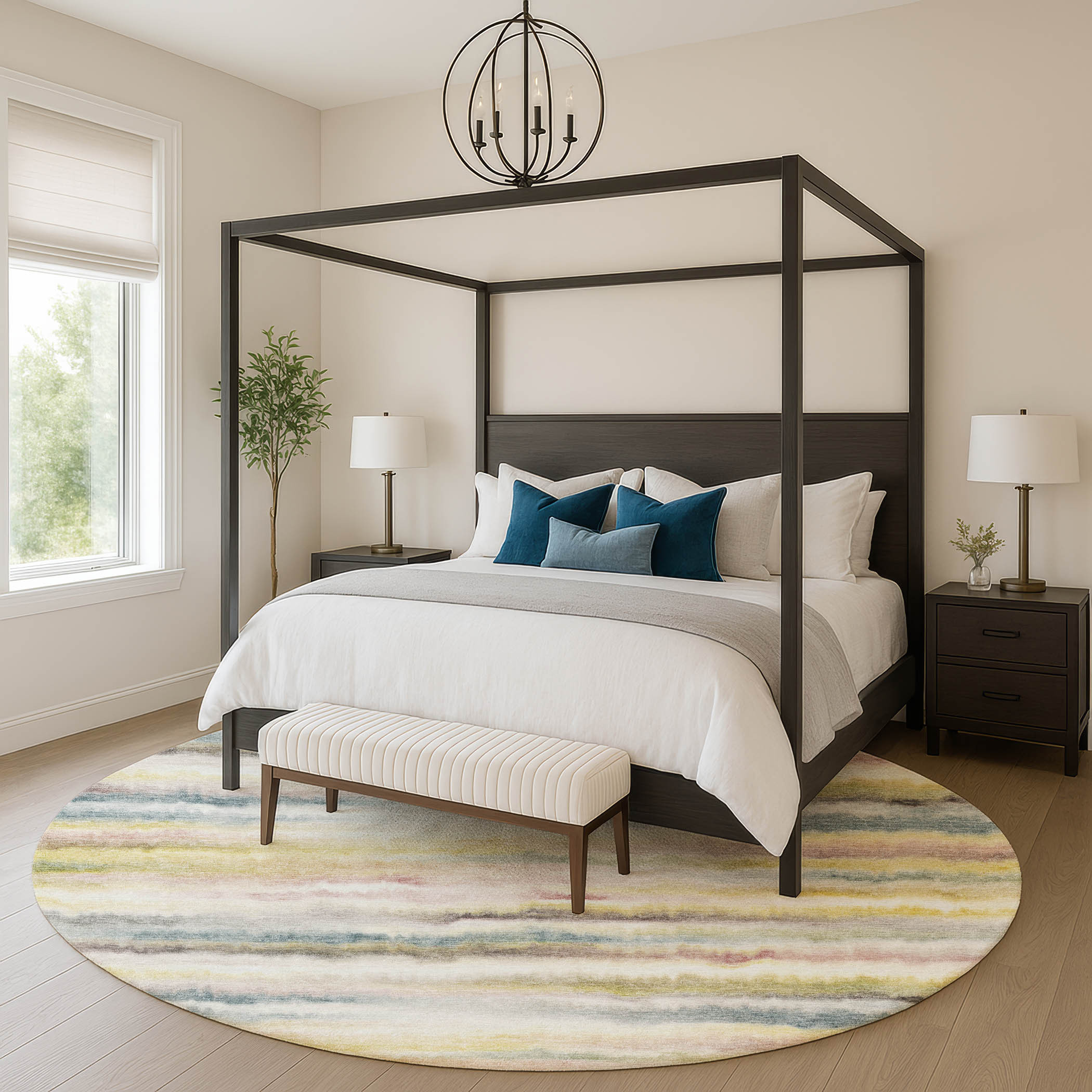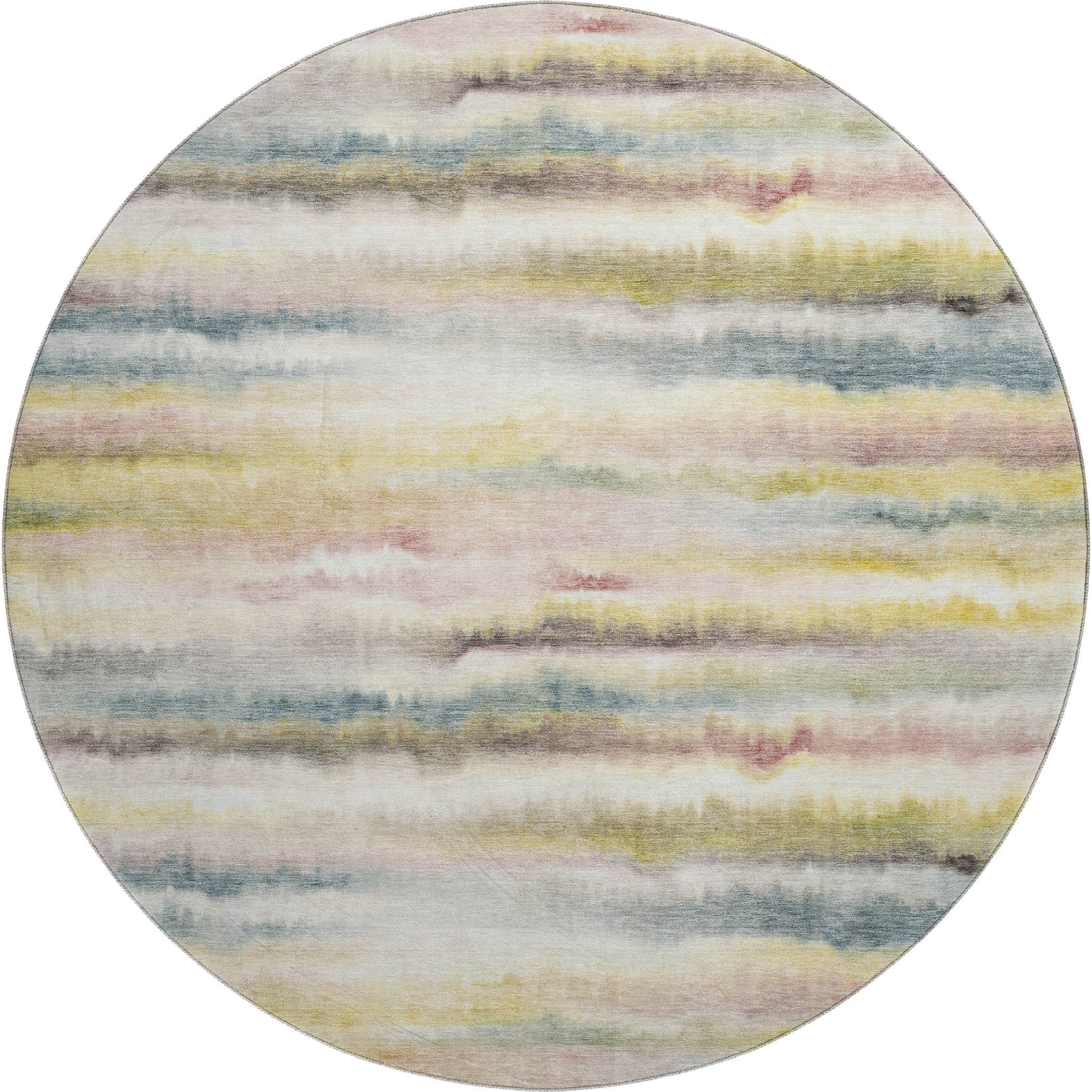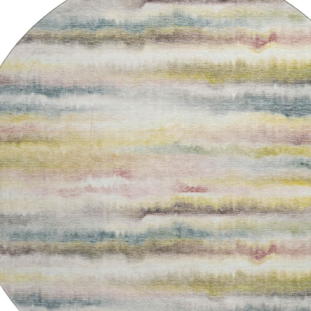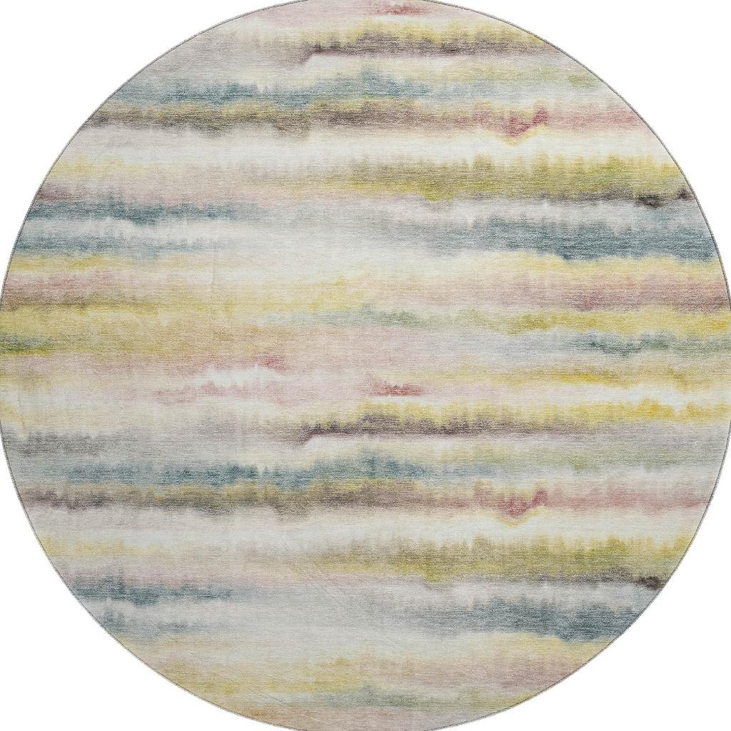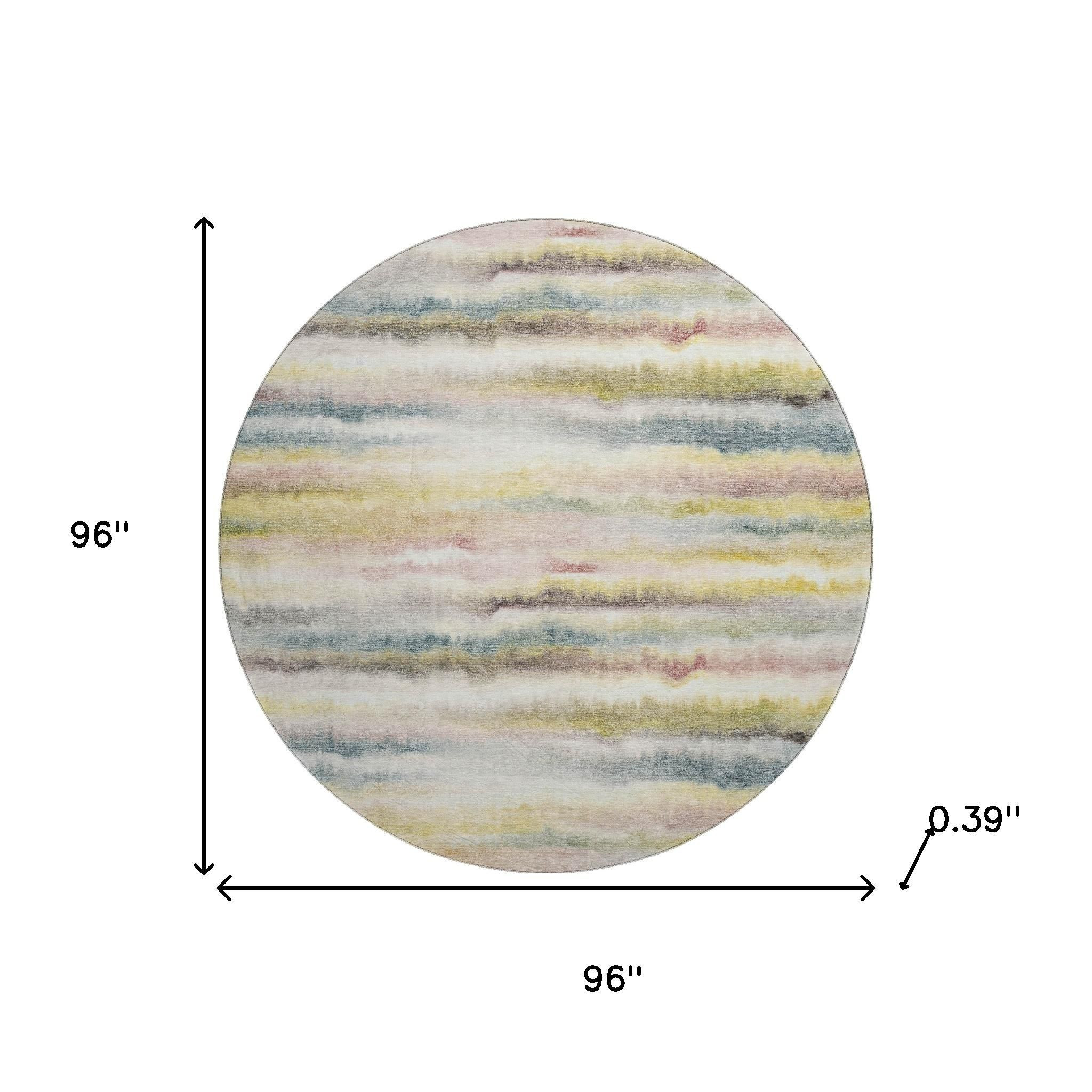Add some artistry to your room with this 8-foot gold and ivory striped washable round rug with uv protection. Ideal for spaces with kids and pets, this rug is stain resistant to help repel dirt and spilled liquids. Built to last, this rug crafted from polyester fibers is known for its durability and long lasting appeal. Rugs are a great way to showcase your style, hide imperfections, warm your home and reduce noise. This larger sized, transitional styled rug is ready to create a focal point or statement piece in your room. 96.00-inch h x 96.00-inch w x 0.39-inch d.