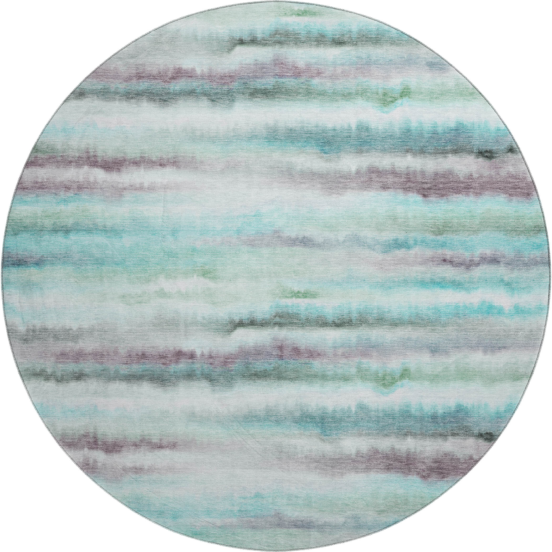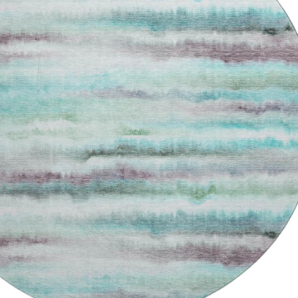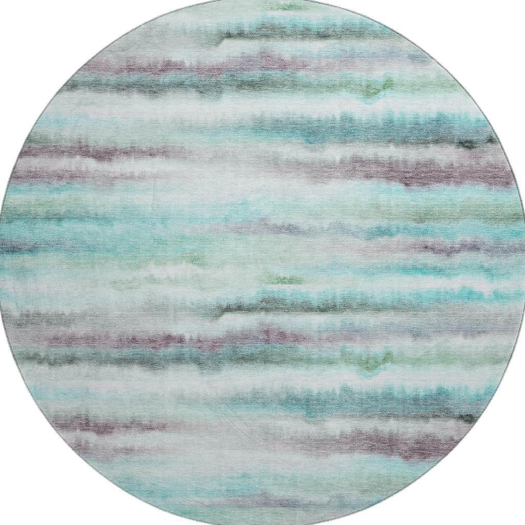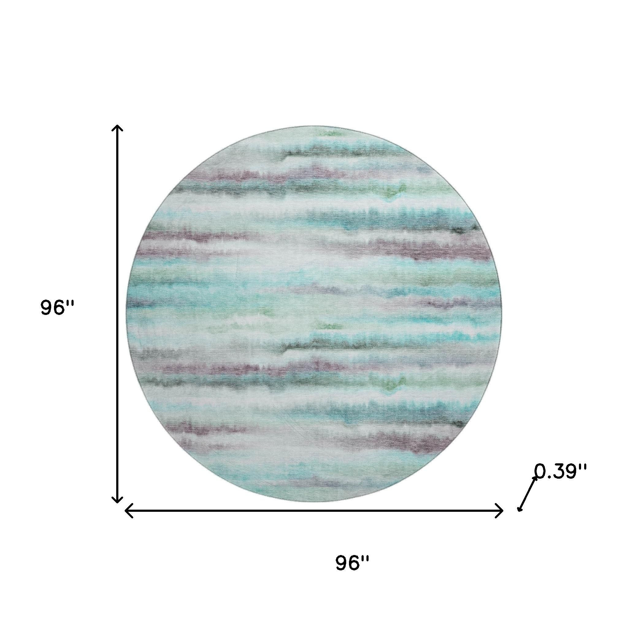 Set an inviting tone in your space with this 8-foot teal and ivory striped washable round rug with uv protection. Ideal for spaces with kids and pets, this rug is stain resistant to help repel dirt and spilled liquids. Built to last, this rug crafted from polyester fibers is known for its durability and long lasting appeal. Rugs are a great way to showcase your style, hide imperfections, warm your home and reduce noise. This larger sized, transitional styled rug is ready to create a focal point or statement piece in your room. 96.00-inch h x 96.00-inch w x 0.39-inch d.