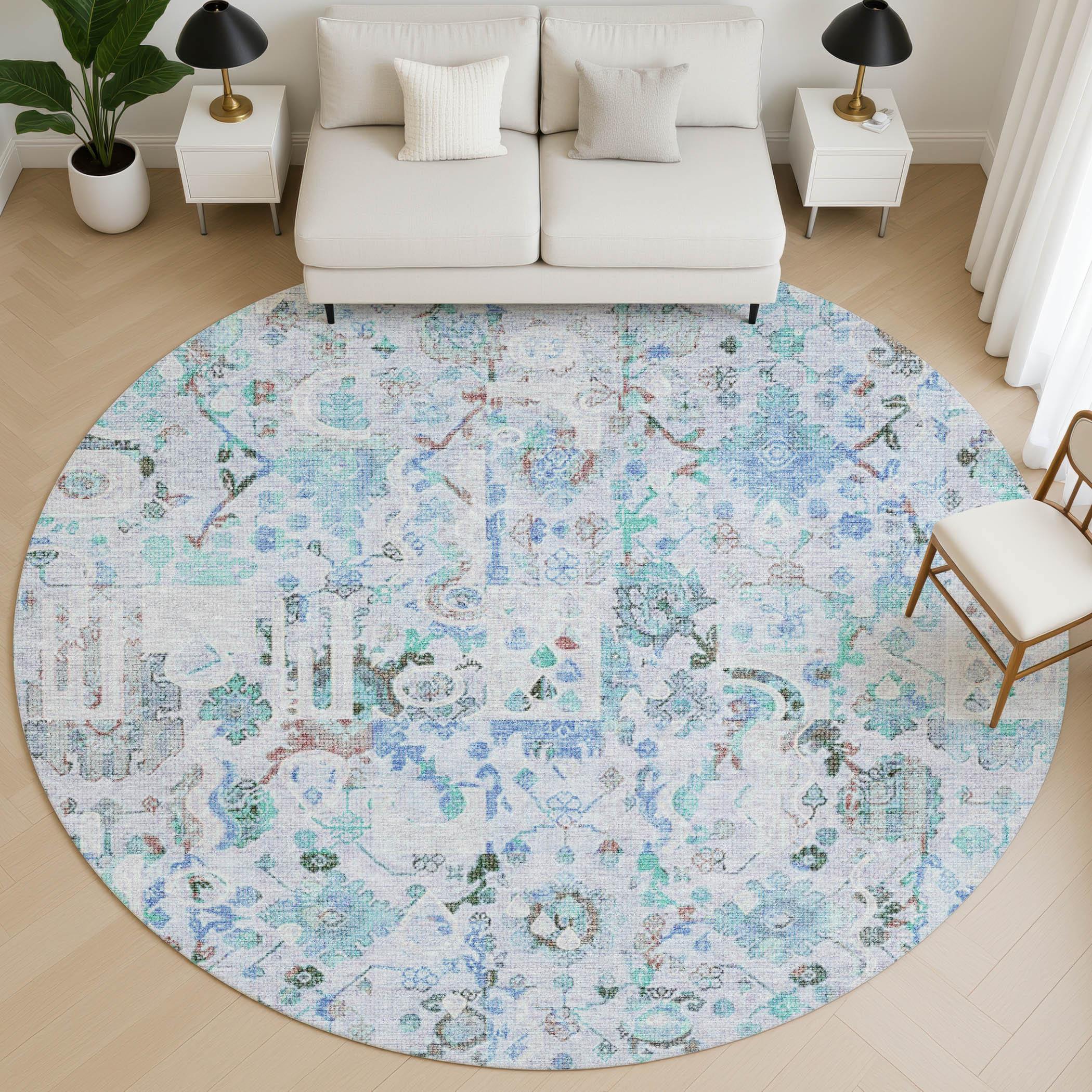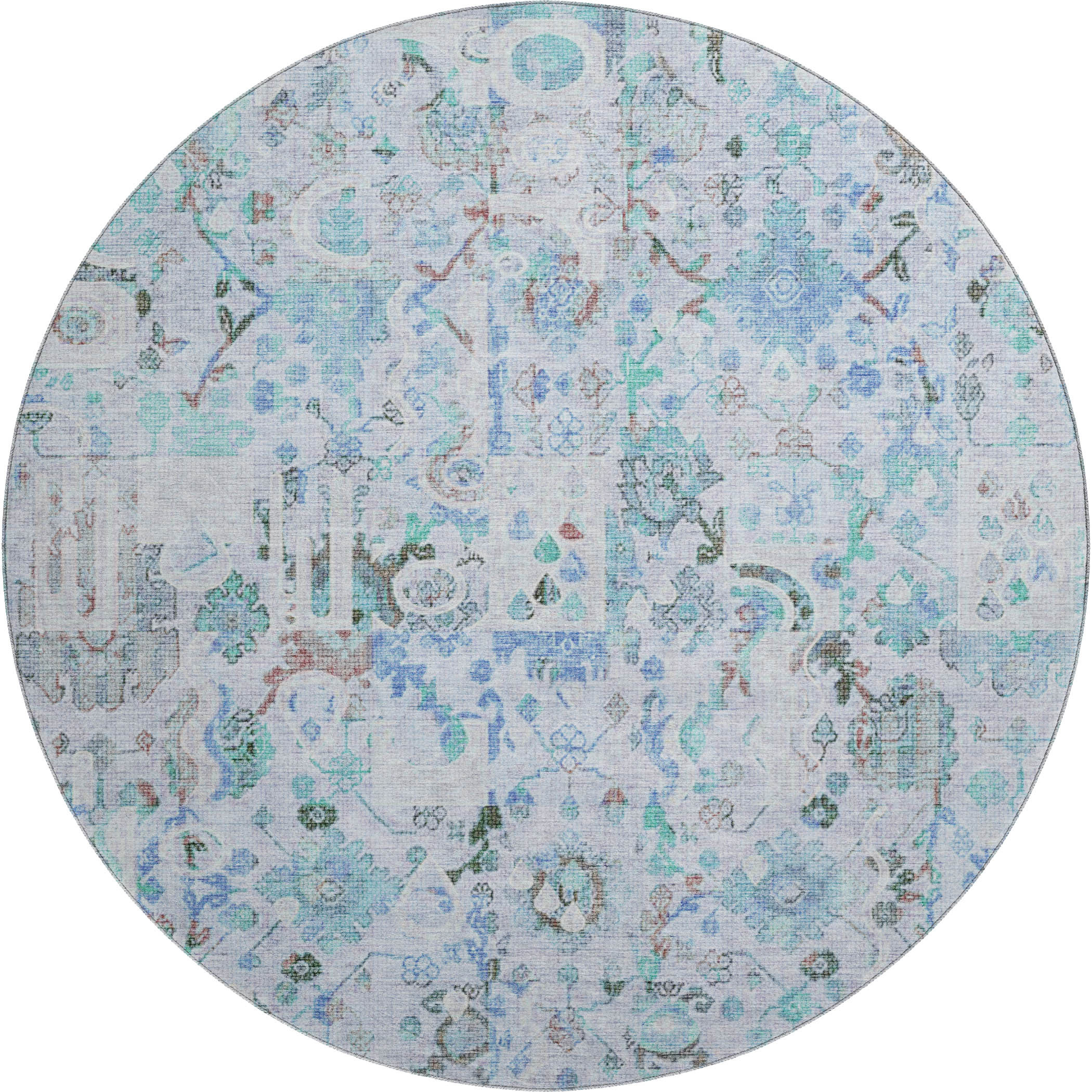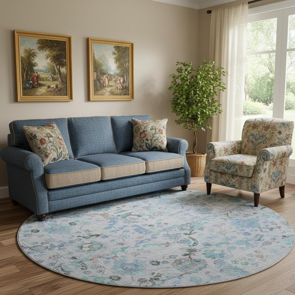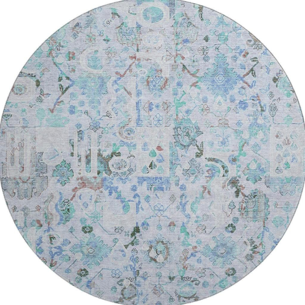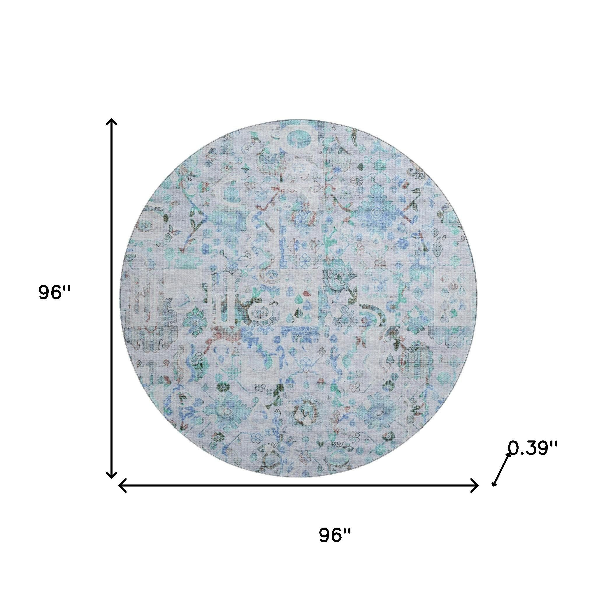Add great coloration and comfortable texture to your space with this 8-foot blue and ivory patchwork washable round rug with uv protection. Ideal for spaces with kids and pets, this rug is stain resistant to help repel dirt and spilled liquids. Built to last, this rug crafted from polyester fibers is known for its durability and long lasting appeal. Rugs are a great way to showcase your style, hide imperfections, warm your home and reduce noise. This larger sized, traditional styled rug is ready to create a focal point or statement piece in your room. 96.00-inch h x 96.00-inch w x 0.39-inch d.