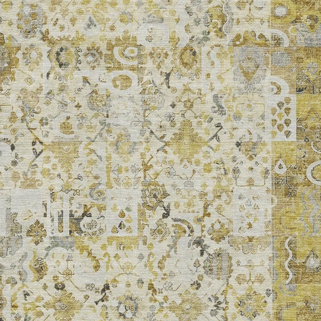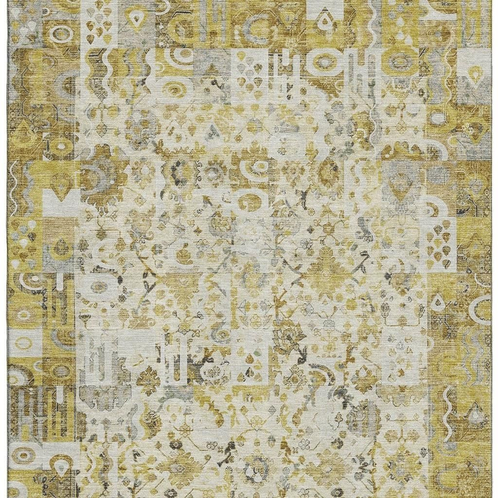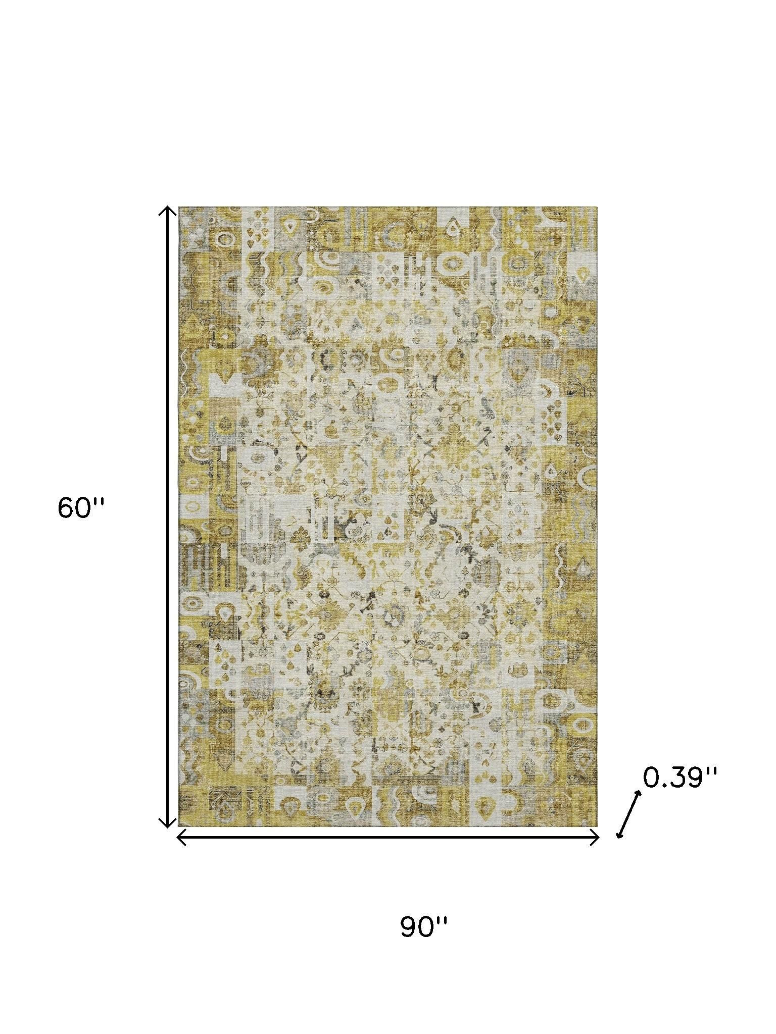 Add some artistry to your room with this 5-foot x 8-foot gold and ivory patchwork washable area rug with uv protection. Ideal for spaces with kids and pets, this rug is stain resistant to help repel dirt and spilled liquids. Built to last, this rug crafted from polyester fibers is known for its durability and long lasting appeal. Rugs are a great way to showcase your style, hide imperfections, warm your home and reduce noise. This larger sized, traditional styled rug is ready to create a focal point or statement piece in your room. 60.00-inch h x 90.00-inch w x 0.39-inch d.