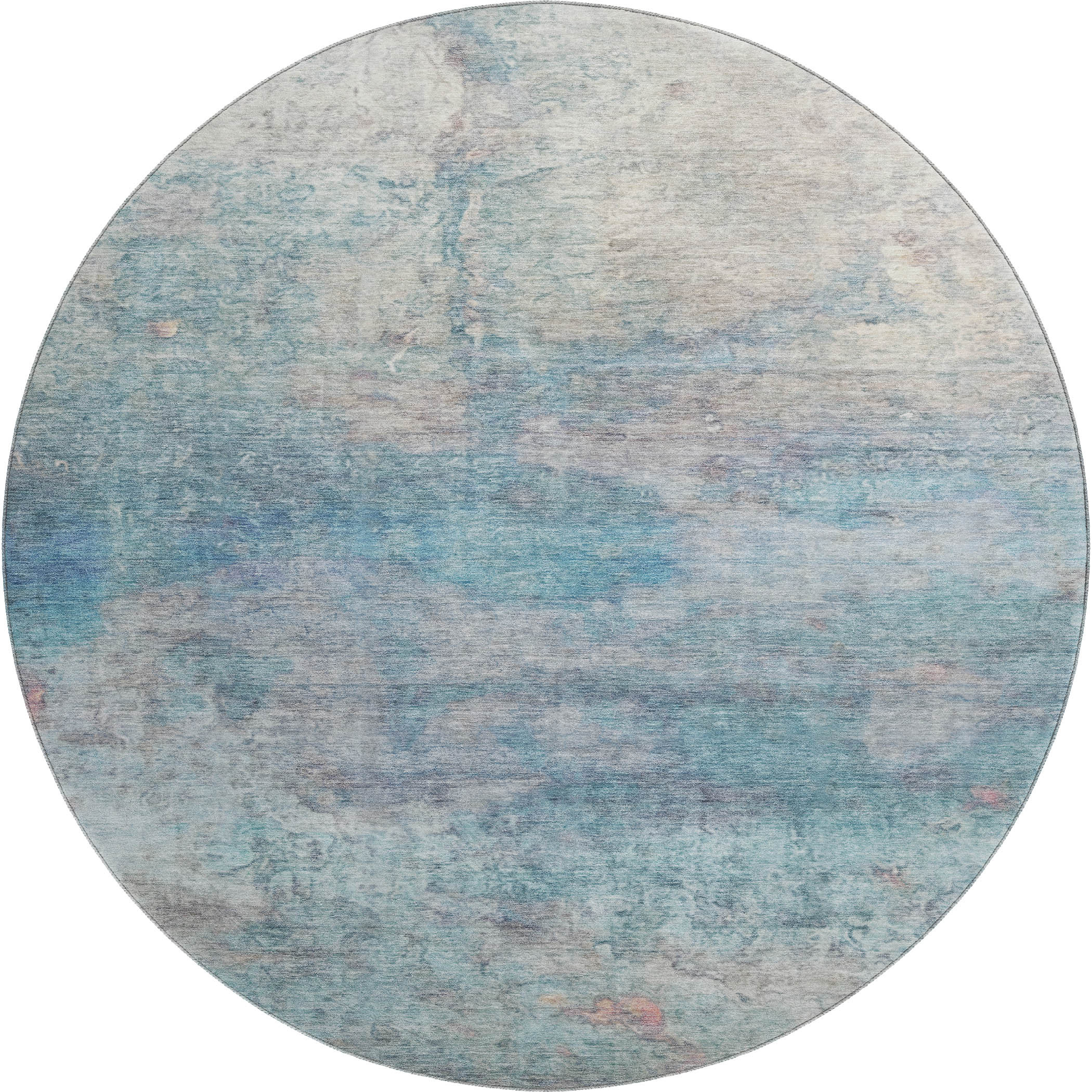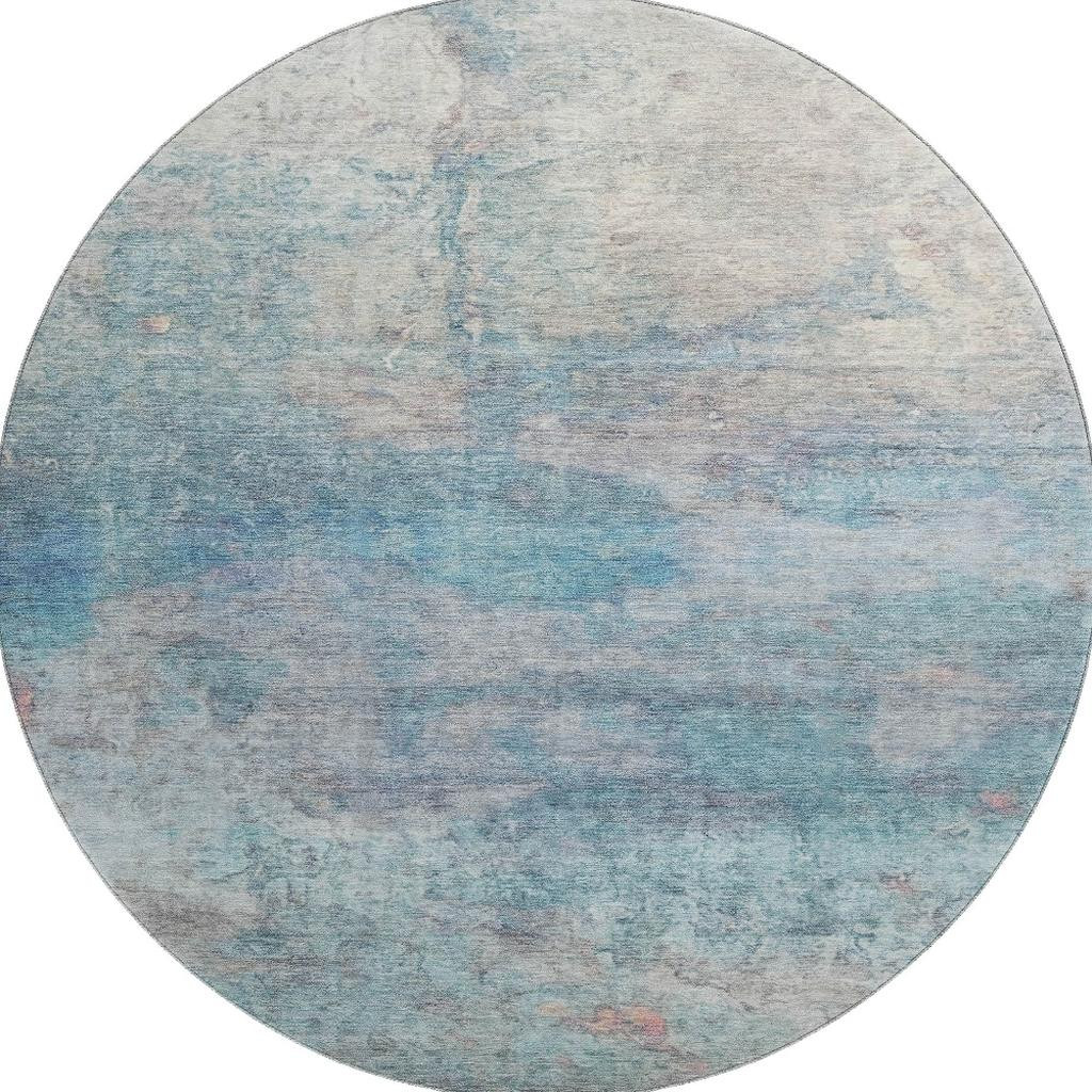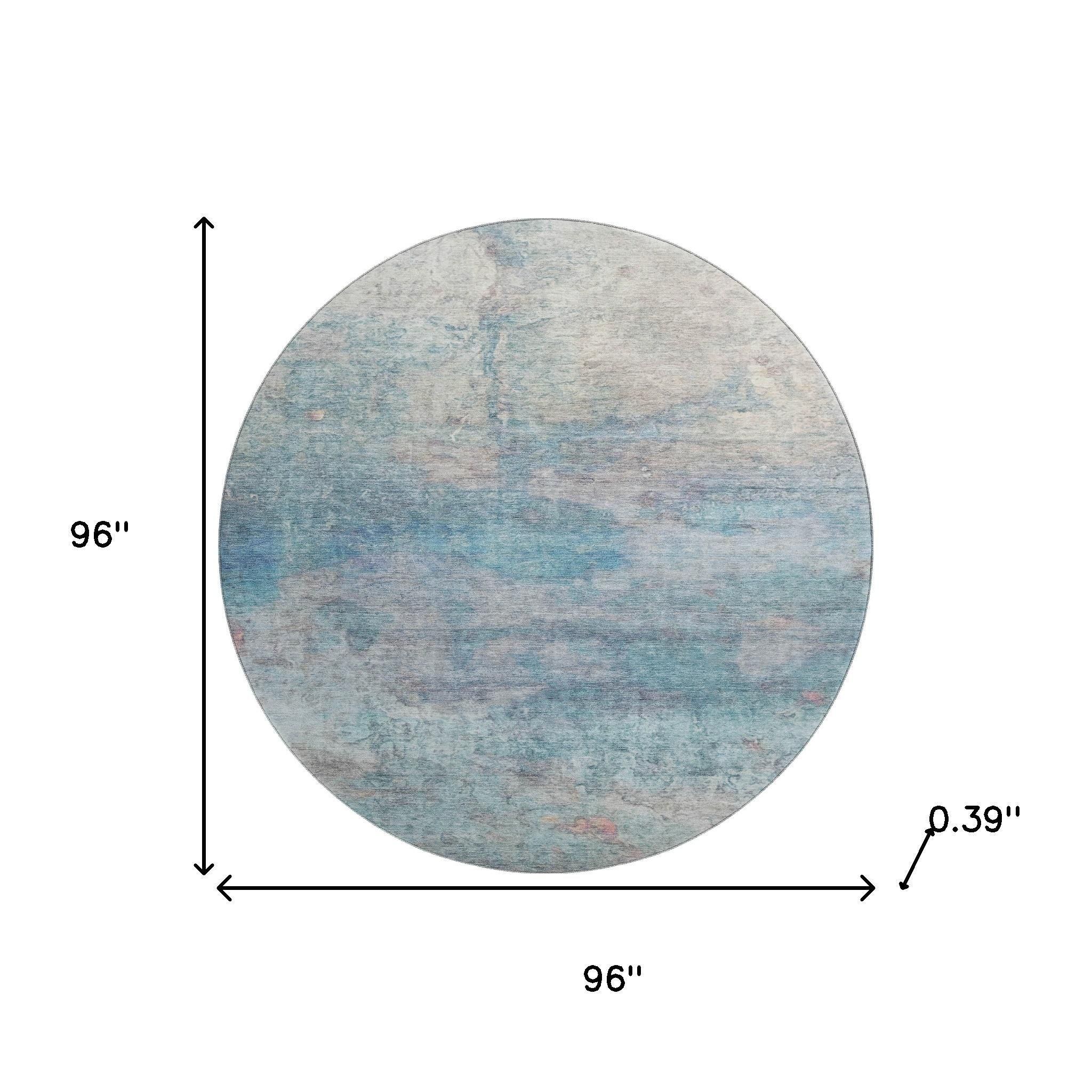 Add some artistry to your room with this 8-foot aqua and beige abstract washable round rug with uv protection. Ideal for spaces with kids and pets, this rug is stain resistant to help repel dirt and spilled liquids. Built to last, this rug crafted from polyester fibers is known for its durability and long lasting appeal. Rugs are a great way to showcase your style, hide imperfections, warm your home and reduce noise. This larger sized, transitional styled rug is ready to create a focal point or statement piece in your room. 96.00-inch h x 96.00-inch w x 0.39-inch d.
