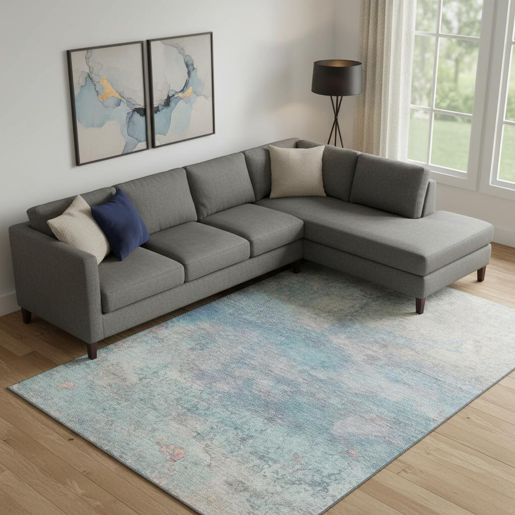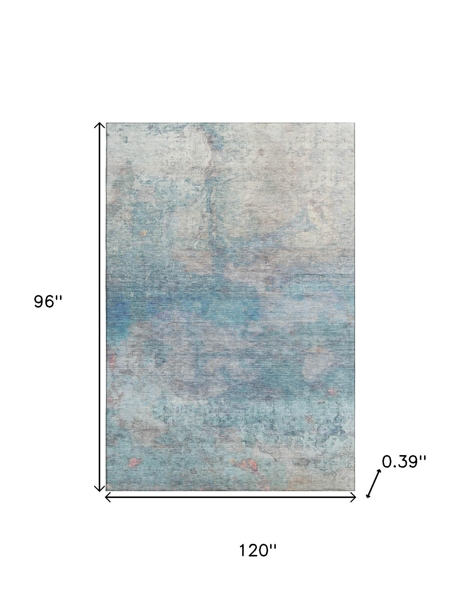 This 8-foot x 10-foot aqua and beige abstract washable area rug with uv protection, is a great way to add warmth to a room. Ideal for spaces with kids and pets, this rug is stain resistant to help repel dirt and spilled liquids. Built to last, this rug crafted from polyester fibers is known for its durability and long lasting appeal. Rugs are a great way to showcase your style, hide imperfections, warm your home and reduce noise. This larger sized, transitional styled rug is ready to create a focal point or statement piece in your room. 96.00-inch h x 120.00-inch w x 0.39-inch d.