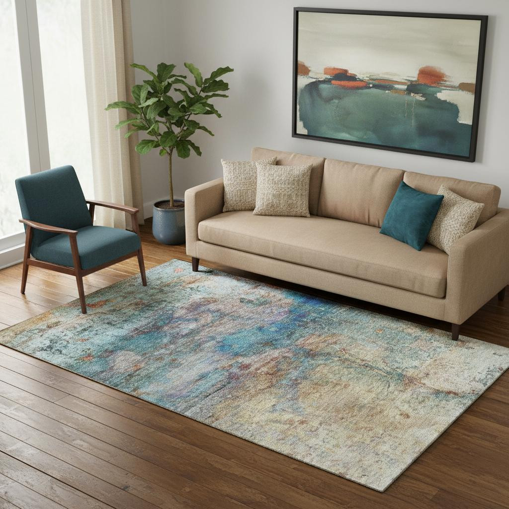 This 5-foot x 8-foot teal and beige abstract washable area rug with uv protection, is a great way to add warmth to a room. Ideal for spaces with kids and pets, this rug is stain resistant to help repel dirt and spilled liquids. Built to last, this rug crafted from polyester fibers is known for its durability and long lasting appeal. Rugs are a great way to showcase your style, hide imperfections, warm your home and reduce noise. This larger sized, transitional styled rug is ready to create a focal point or statement piece in your room. 60.00-inch h x 90.00-inch w x 0.39-inch d.