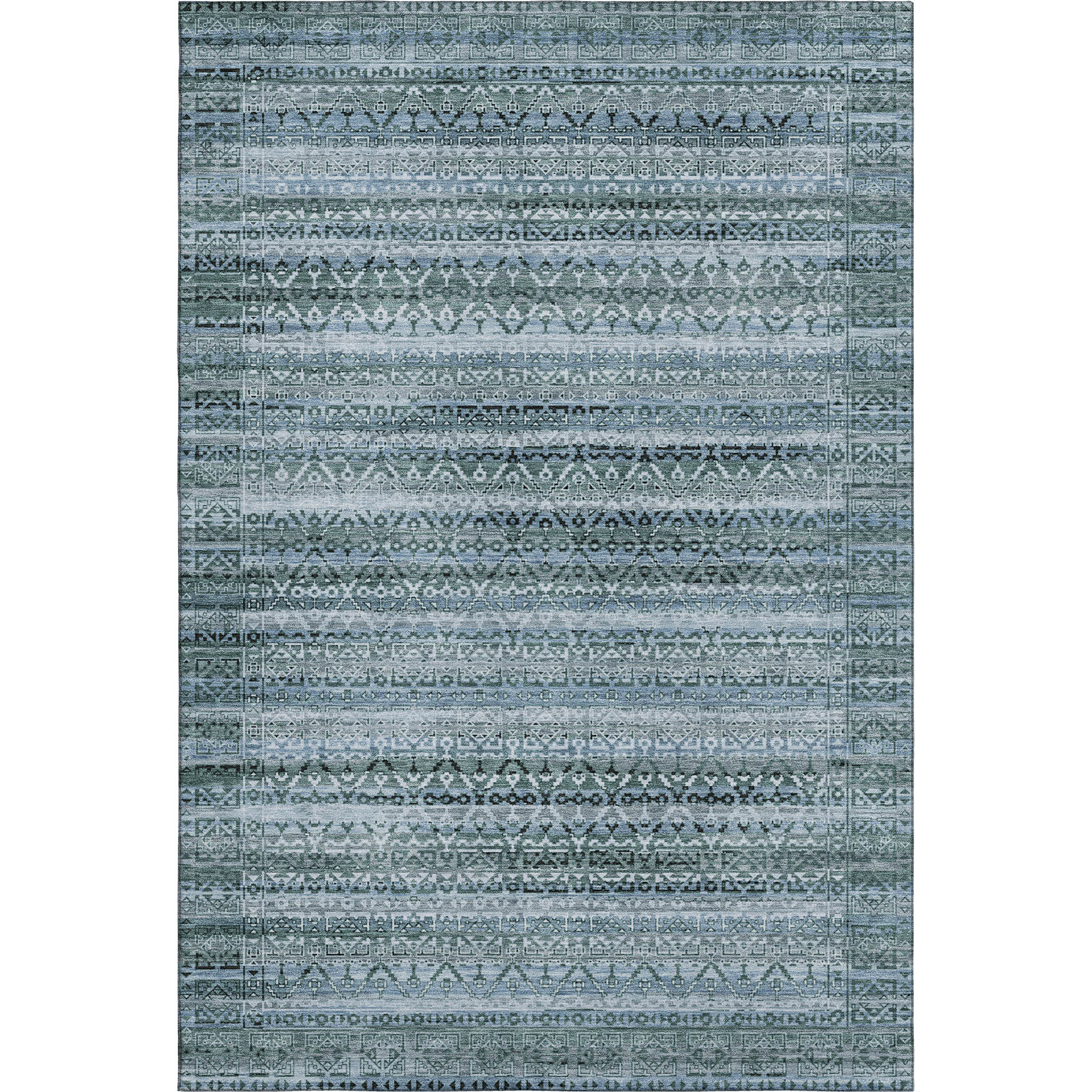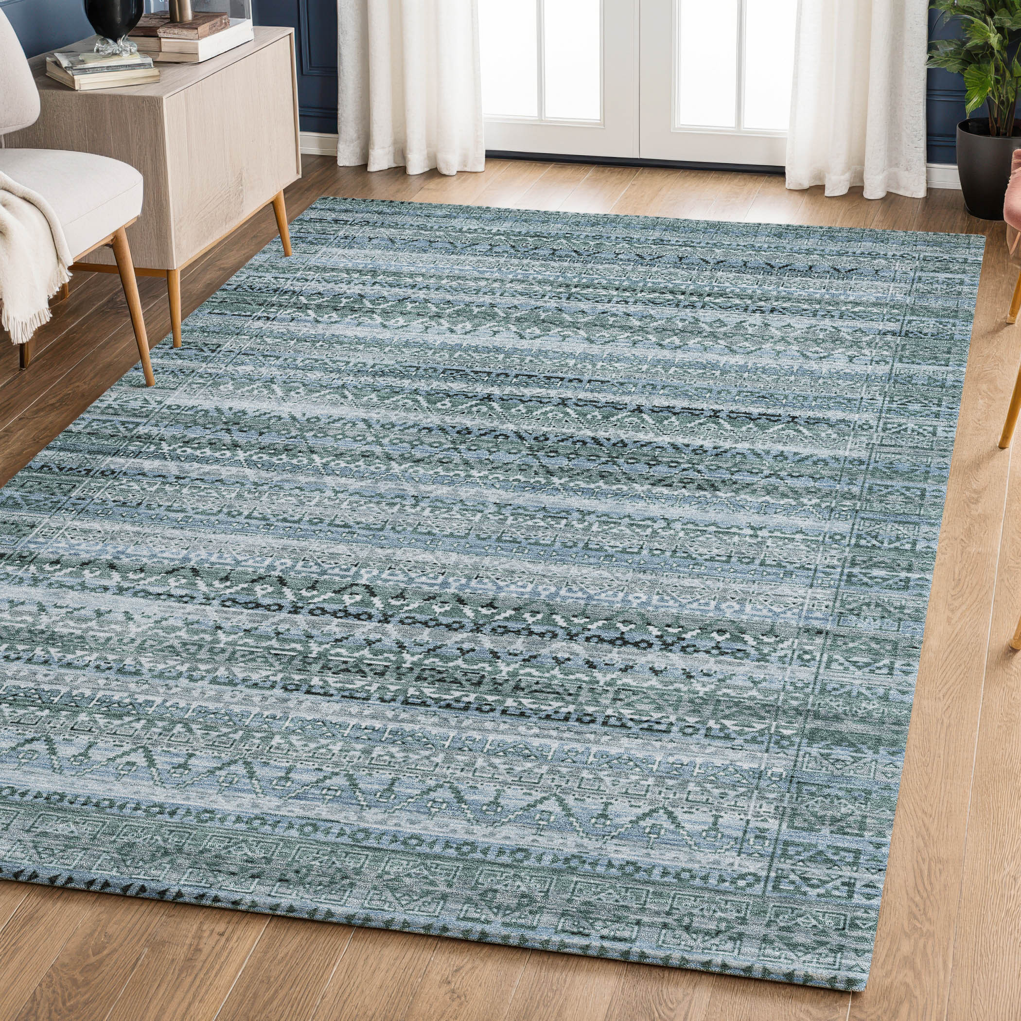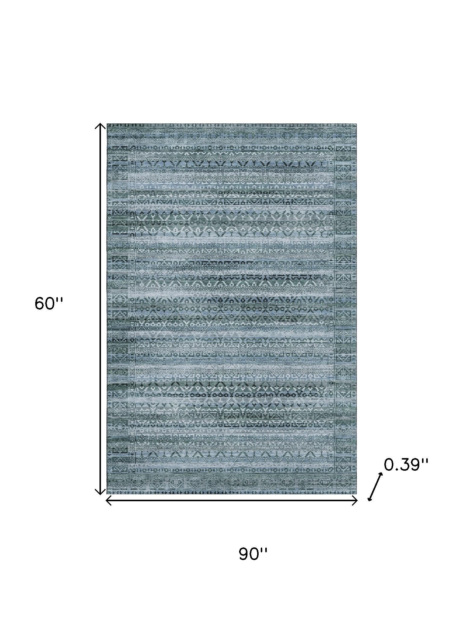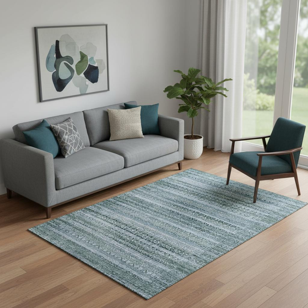 This 5-foot x 8-foot sage and blue striped washable area rug with uv protection, is a great way to add warmth to a room. Ideal for spaces with kids and pets, this rug is stain resistant to help repel dirt and spilled liquids. Built to last, this rug crafted from polyester fibers is known for its durability and long lasting appeal. Rugs are a great way to showcase your style, hide imperfections, warm your home and reduce noise. This larger sized, transitional styled rug is ready to create a focal point or statement piece in your room. 60.00-inch h x 90.00-inch w x 0.39-inch d.