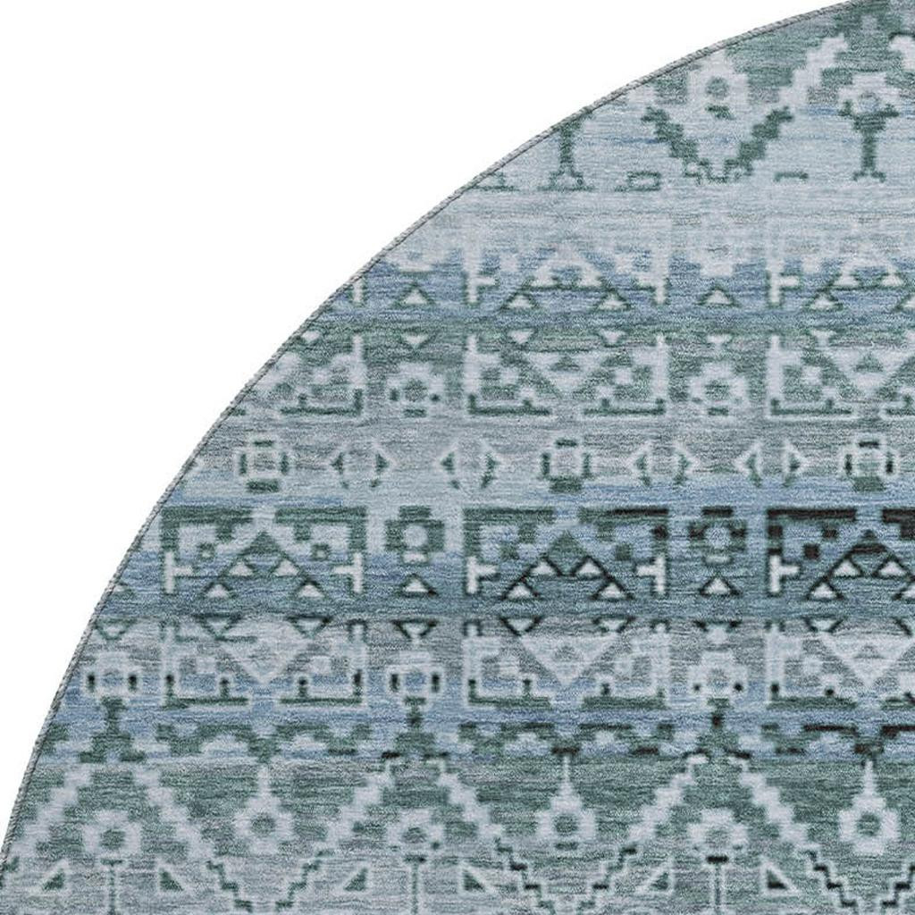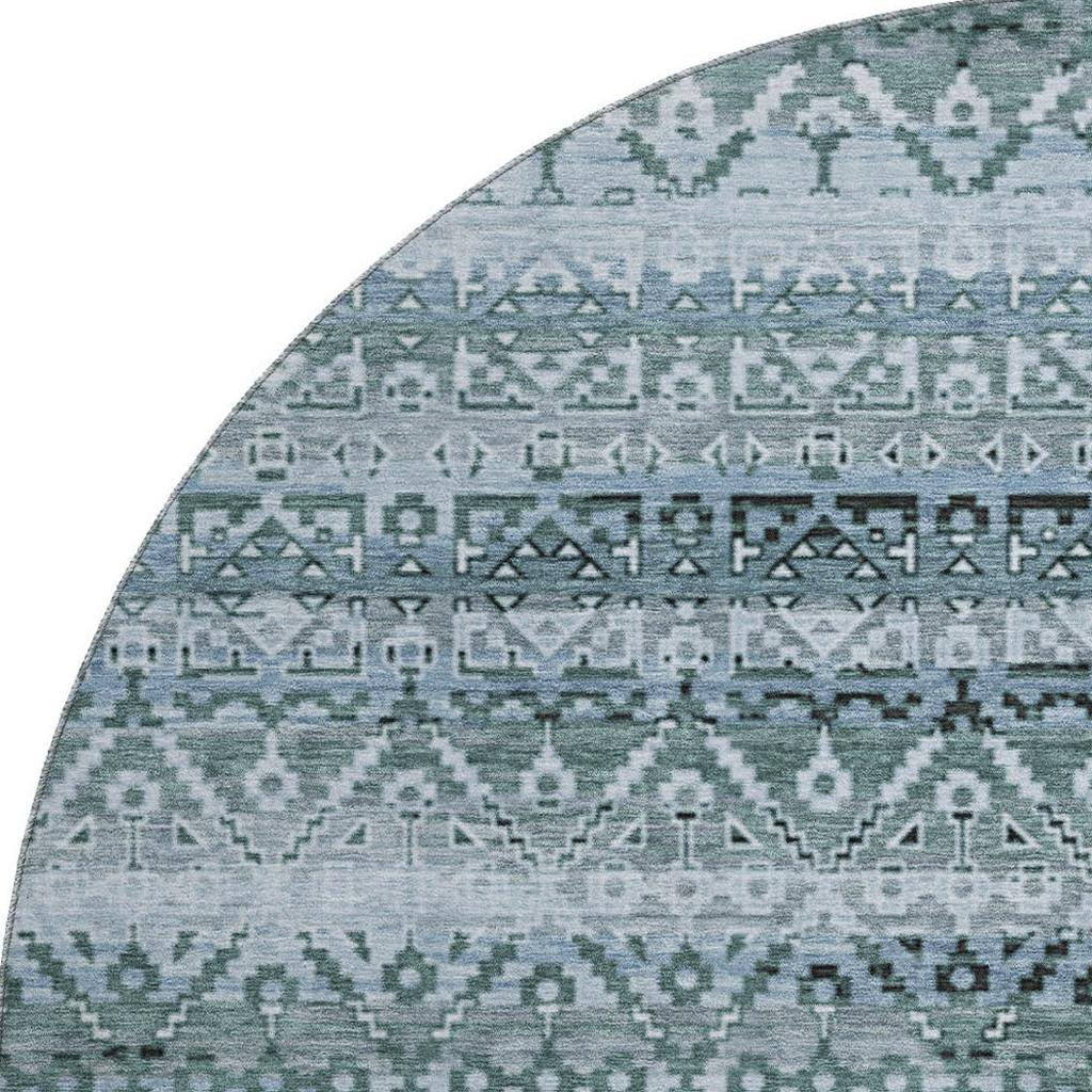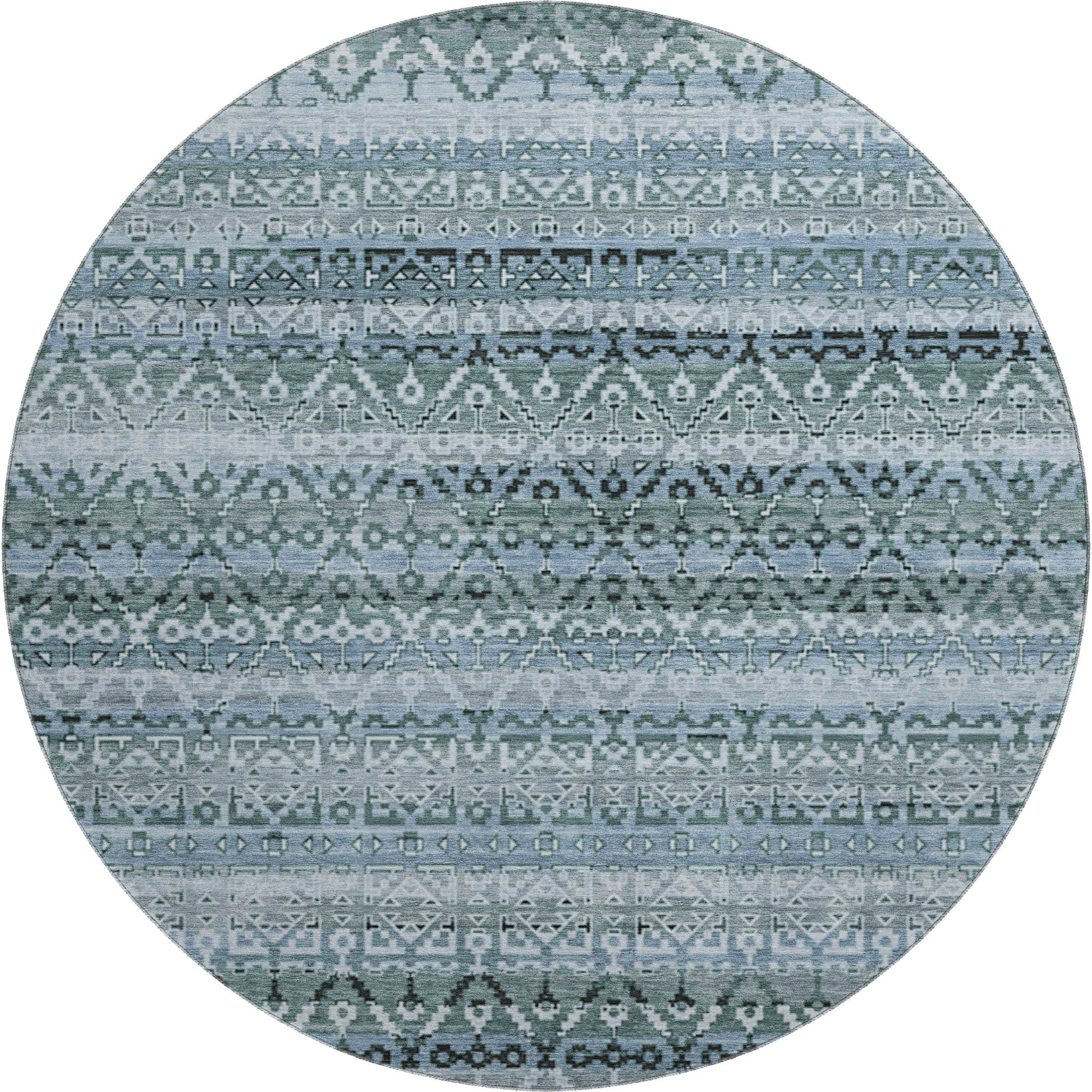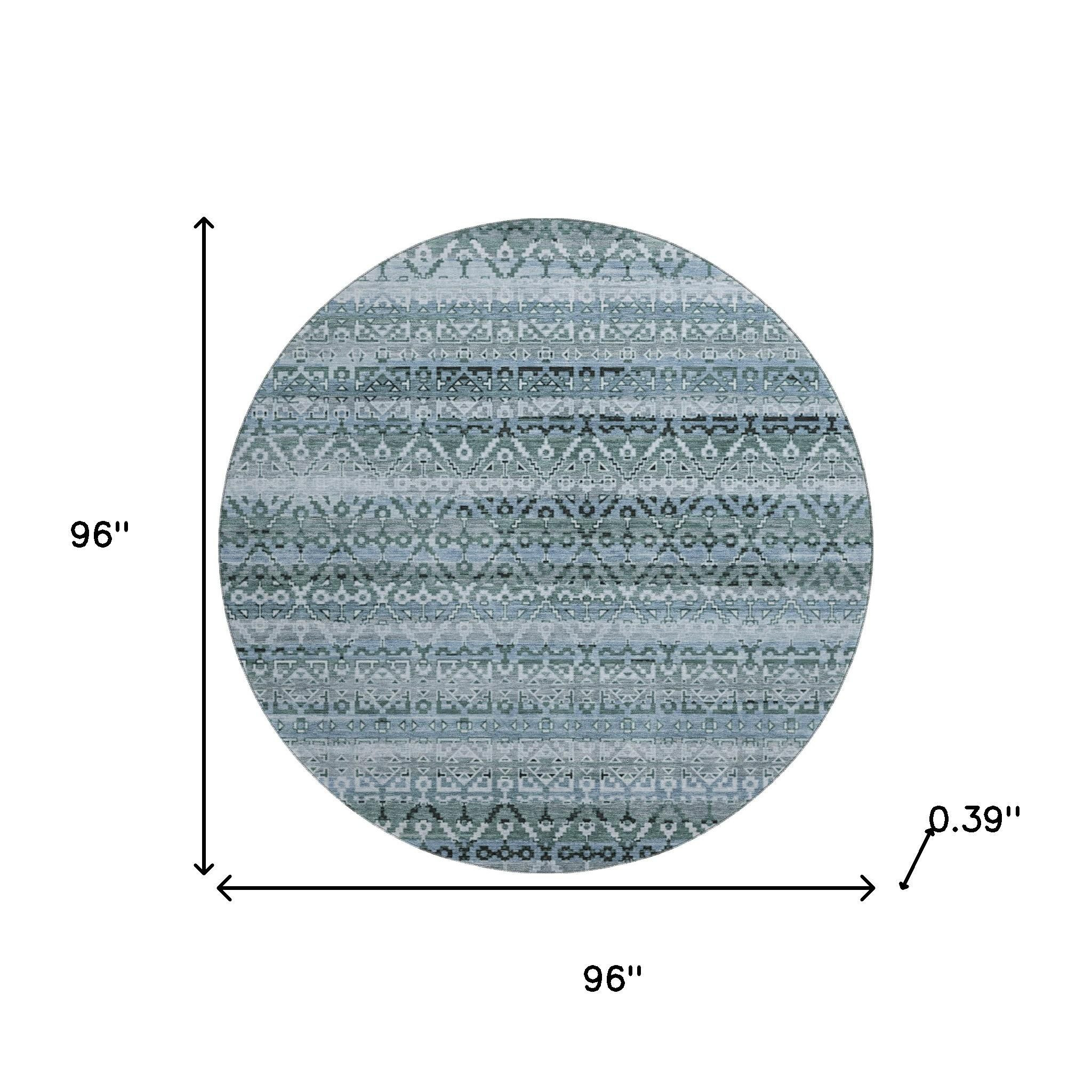 Add some artistry to your room with this 8-foot sage and blue striped washable round rug with uv protection. Ideal for spaces with kids and pets, this rug is stain resistant to help repel dirt and spilled liquids. Built to last, this rug crafted from polyester fibers is known for its durability and long lasting appeal. Rugs are a great way to showcase your style, hide imperfections, warm your home and reduce noise. This larger sized, transitional styled rug is ready to create a focal point or statement piece in your room. 96.00-inch h x 96.00-inch w x 0.39-inch d.