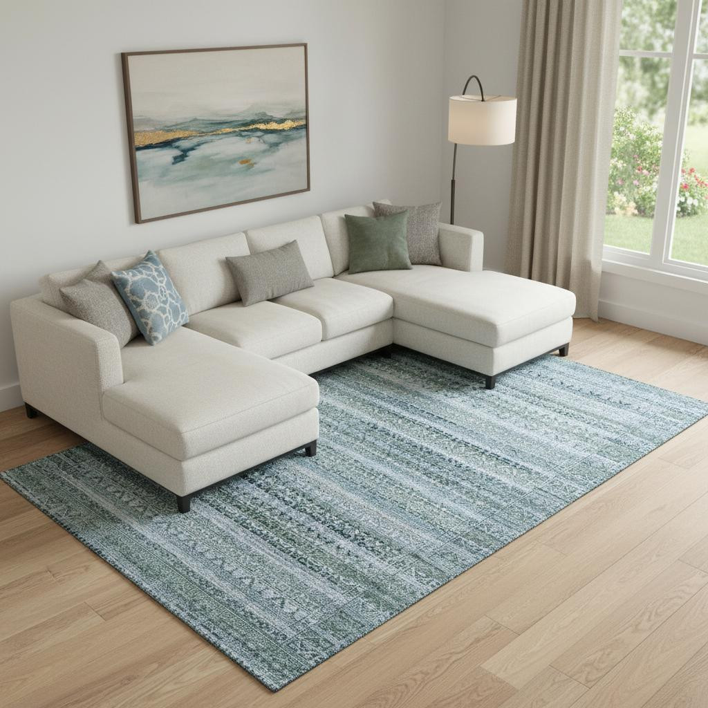 This 8-foot x 10-foot sage and blue striped washable area rug with uv protection, is a great way to add warmth to a room. Ideal for spaces with kids and pets, this rug is stain resistant to help repel dirt and spilled liquids. Built to last, this rug crafted from polyester fibers is known for its durability and long lasting appeal. Rugs are a great way to showcase your style, hide imperfections, warm your home and reduce noise. This larger sized, transitional styled rug is ready to create a focal point or statement piece in your room. 96.00-inch h x 120.00-inch w x 0.39-inch d.