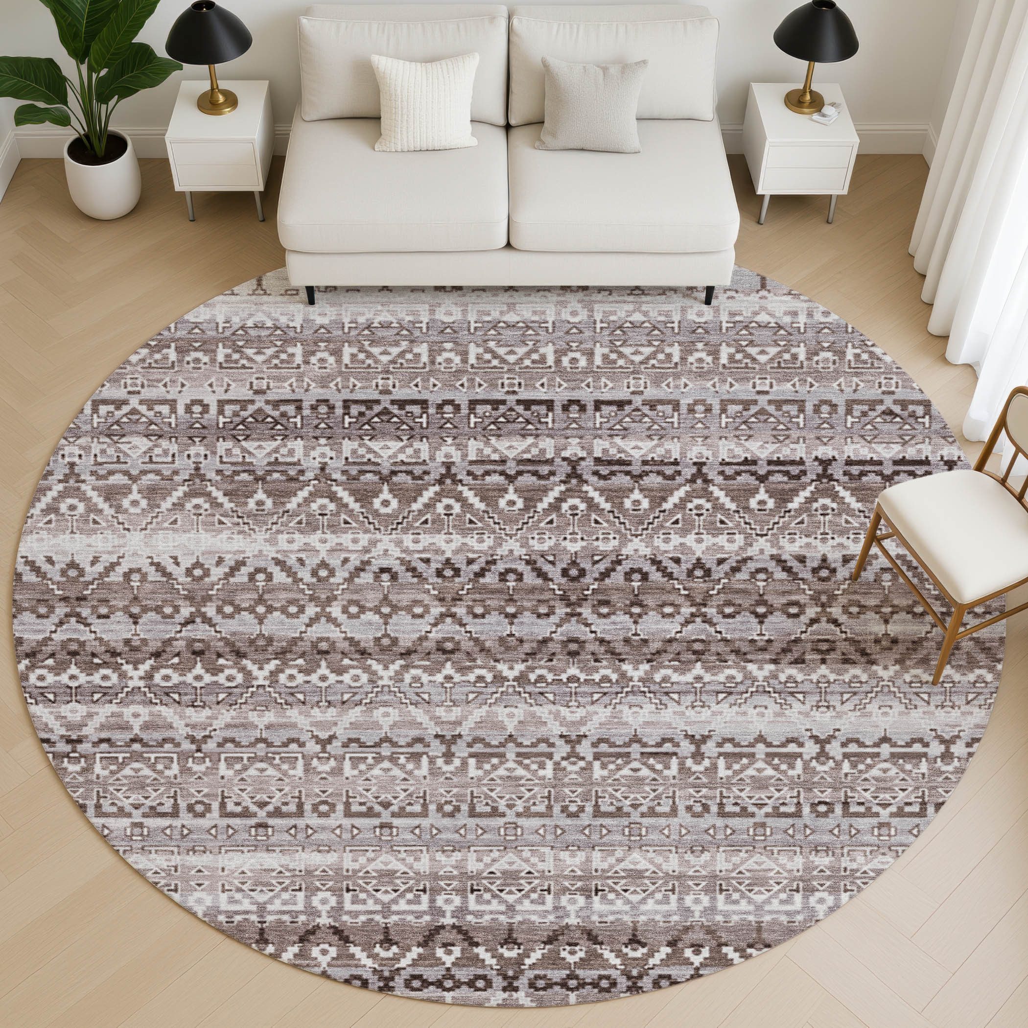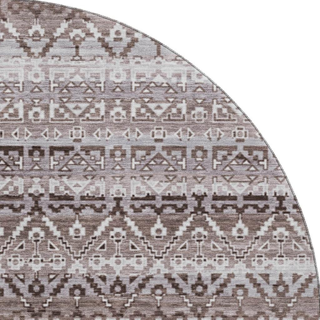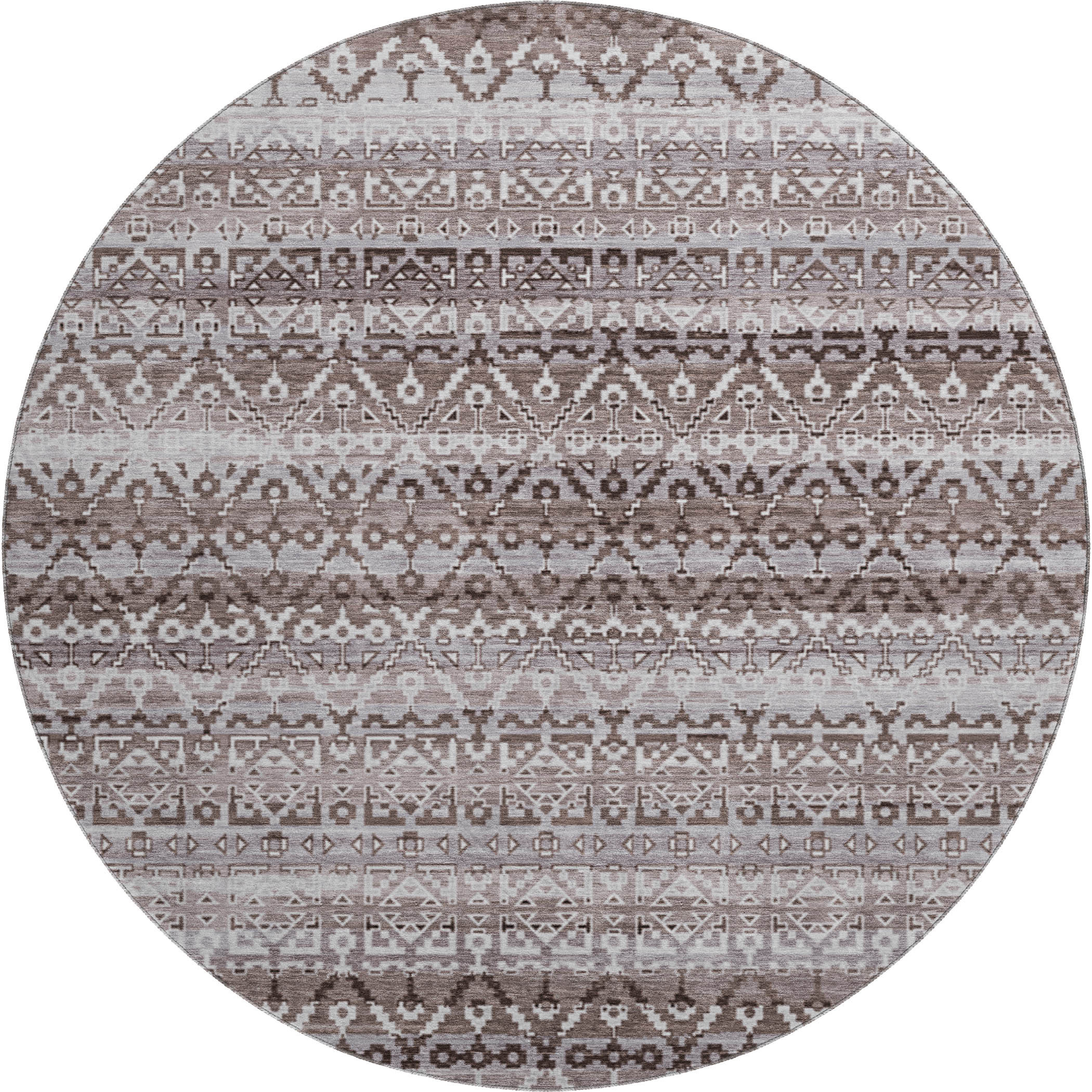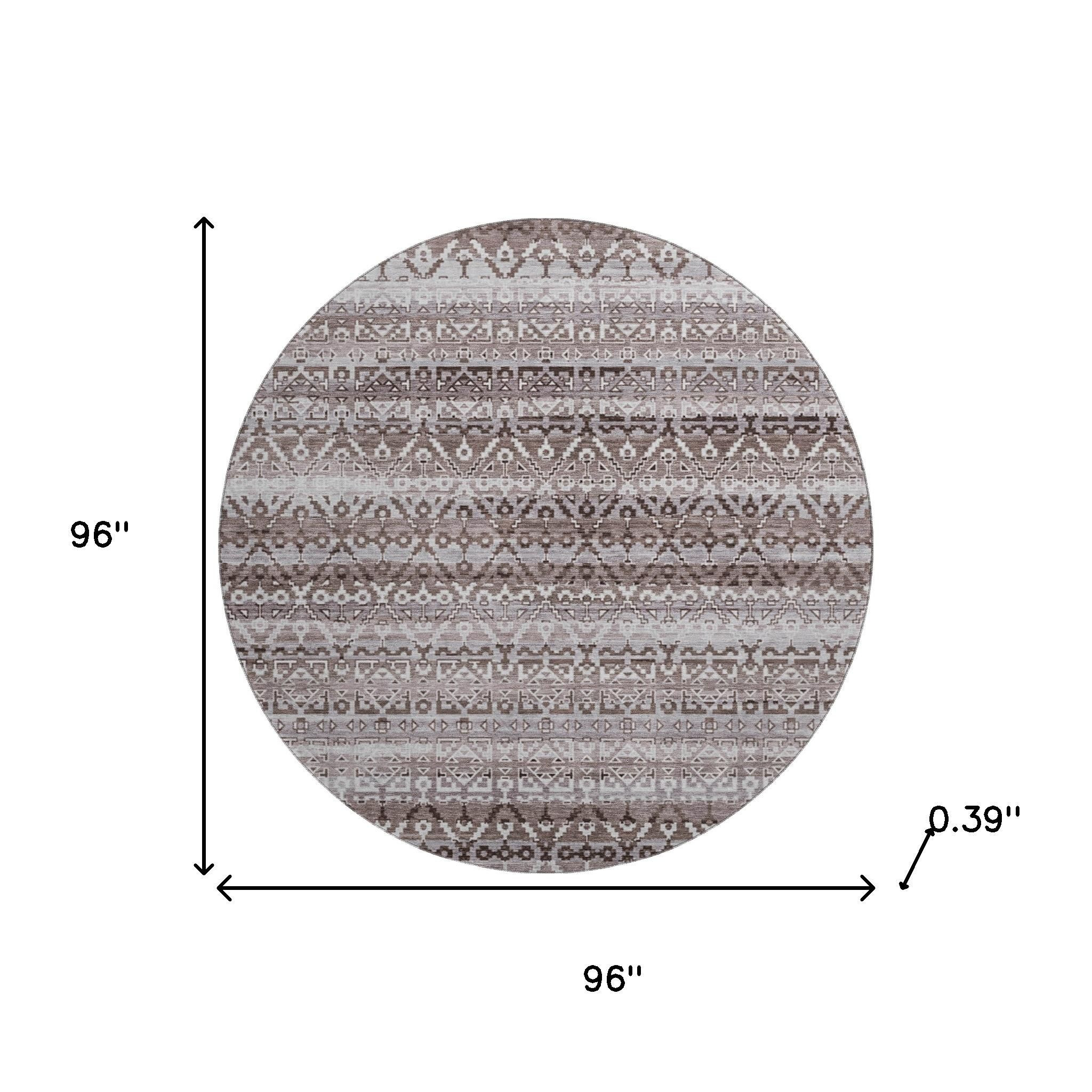Add some artistry to your room with this 8-foot brown and beige striped washable round rug with uv protection. Ideal for spaces with kids and pets, this rug is stain resistant to help repel dirt and spilled liquids. Built to last, this rug crafted from polyester fibers is known for its durability and long lasting appeal. Rugs are a great way to showcase your style, hide imperfections, warm your home and reduce noise. This larger sized, transitional styled rug is ready to create a focal point or statement piece in your room. 96.00-inch h x 96.00-inch w x 0.39-inch d.