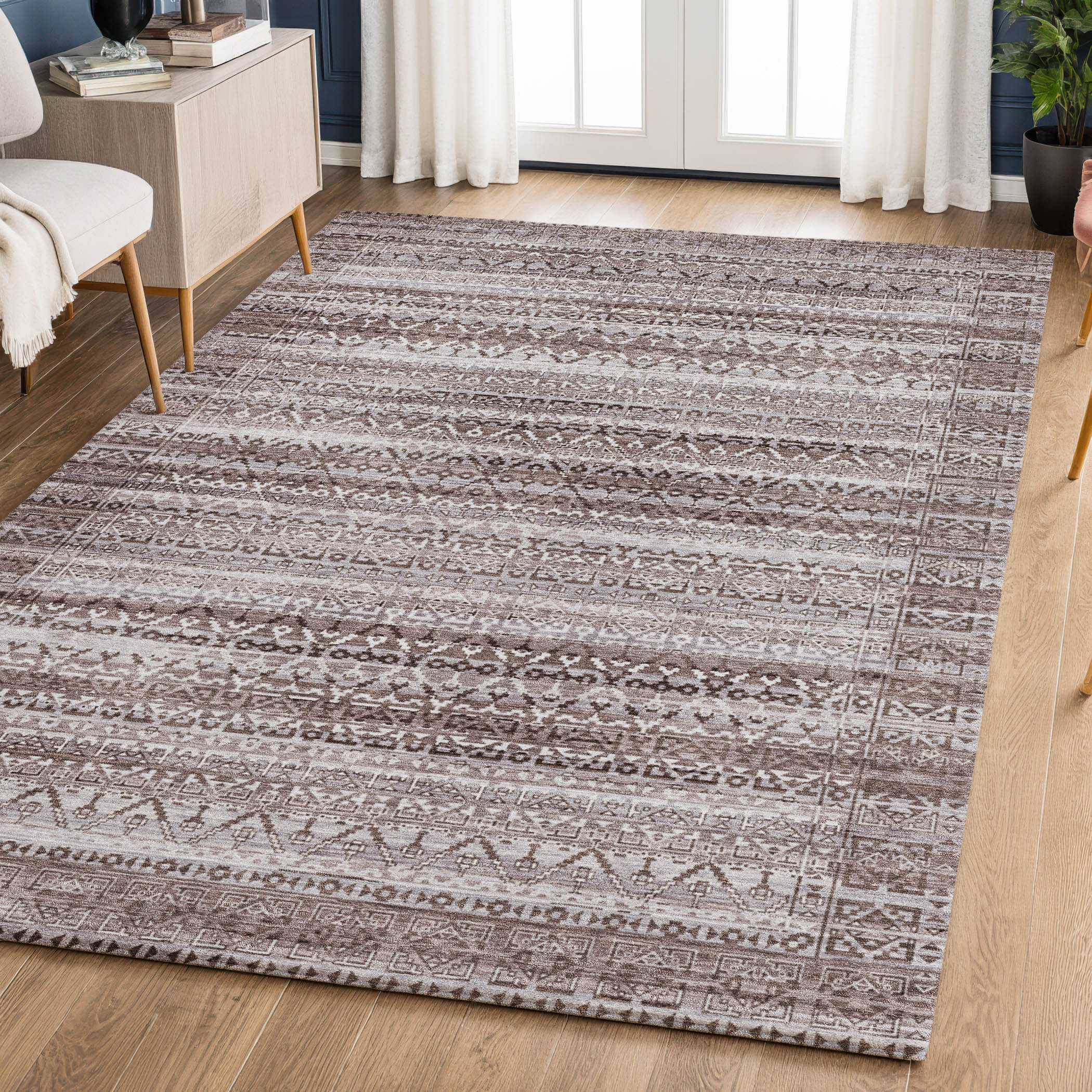 Set an inviting tone in your space with this 10-foot x 14-foot brown and beige striped washable area rug with uv protection. Ideal for spaces with kids and pets, this rug is stain resistant to help repel dirt and spilled liquids. Built to last, this rug crafted from polyester fibers is known for its durability and long lasting appeal. Rugs are a great way to showcase your style, hide imperfections, warm your home and reduce noise. This larger sized, transitional styled rug is ready to create a focal point or statement piece in your room. 120.00-inch h x 168.00-inch w x 0.39-inch d.
