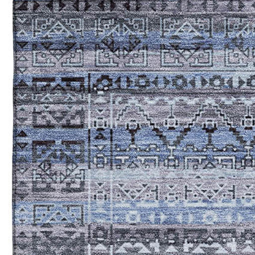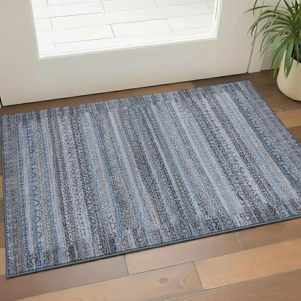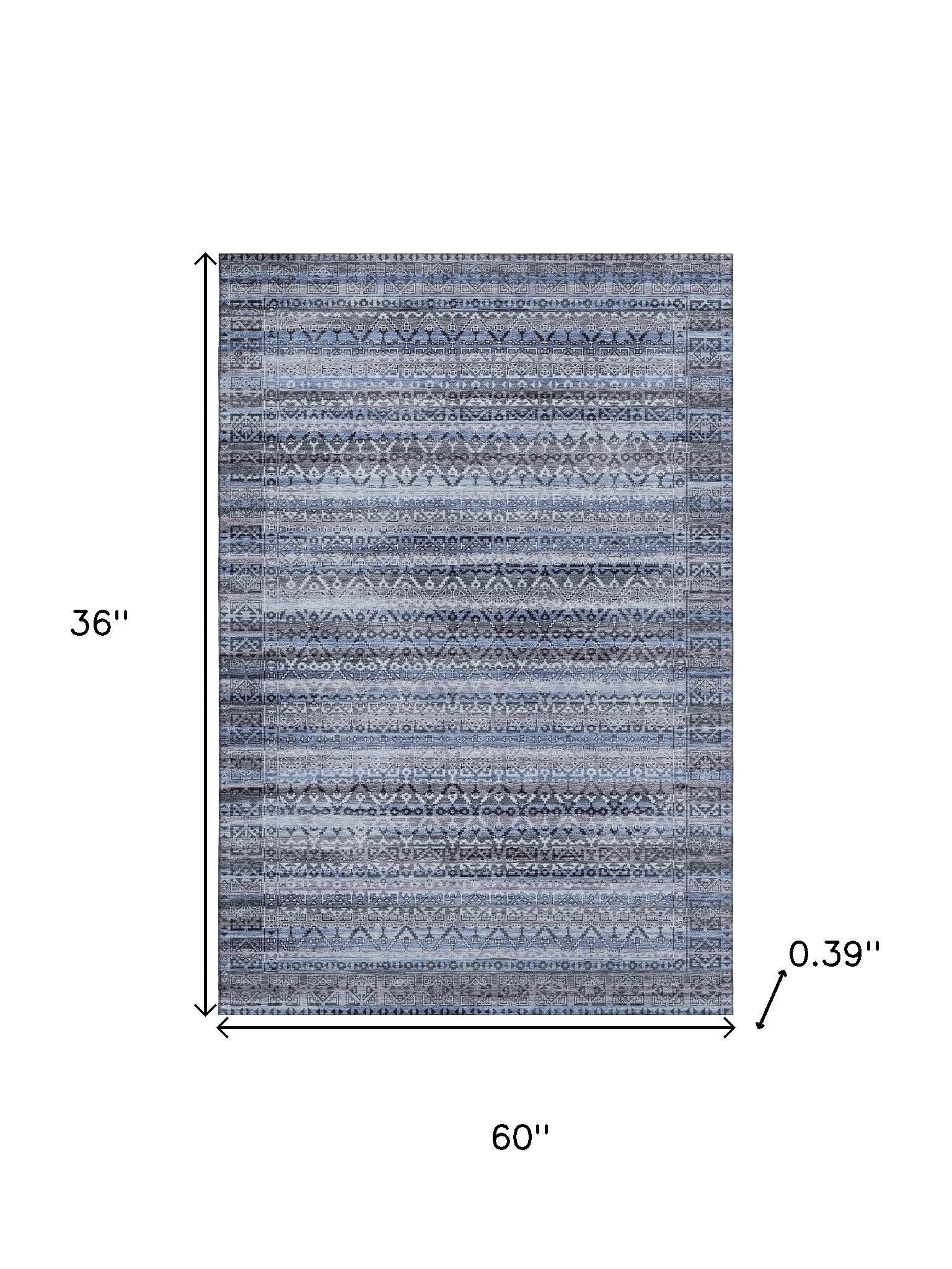 Add some artistry to your room with this 3-foot x 5-foot blue and charcoal striped washable area rug with uv protection. Ideal for spaces with kids and pets, this rug is stain resistant to help repel dirt and spilled liquids. Built to last, this rug crafted from polyester fibers is known for its durability and long lasting appeal. Rugs are a great way to showcase your style, hide imperfections, warm your home and reduce noise. This smaller sized, transitional styled rug is just what you need for your walkway, bedside, in front of door, cabinet, refrigerator, or chair. 36.00-inch h x 60.00-inch w x 0.39-inch d.