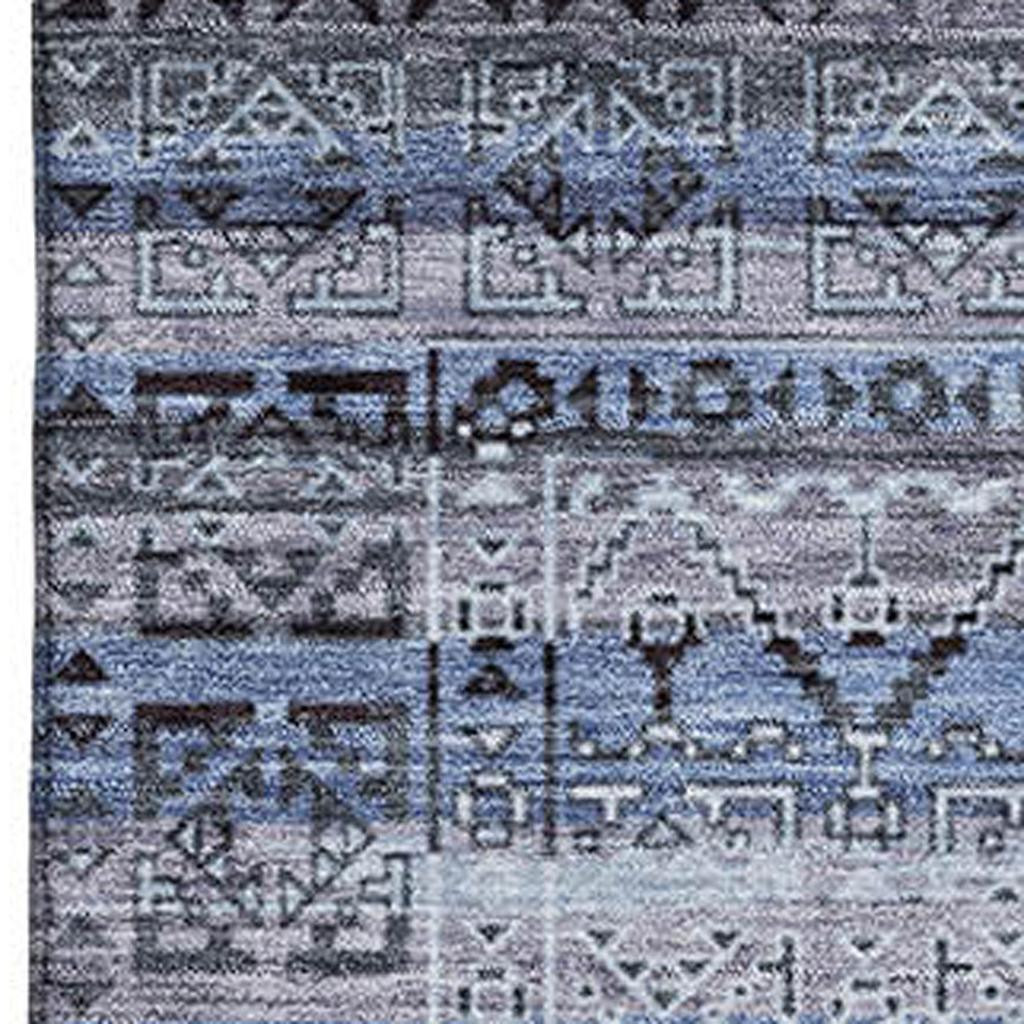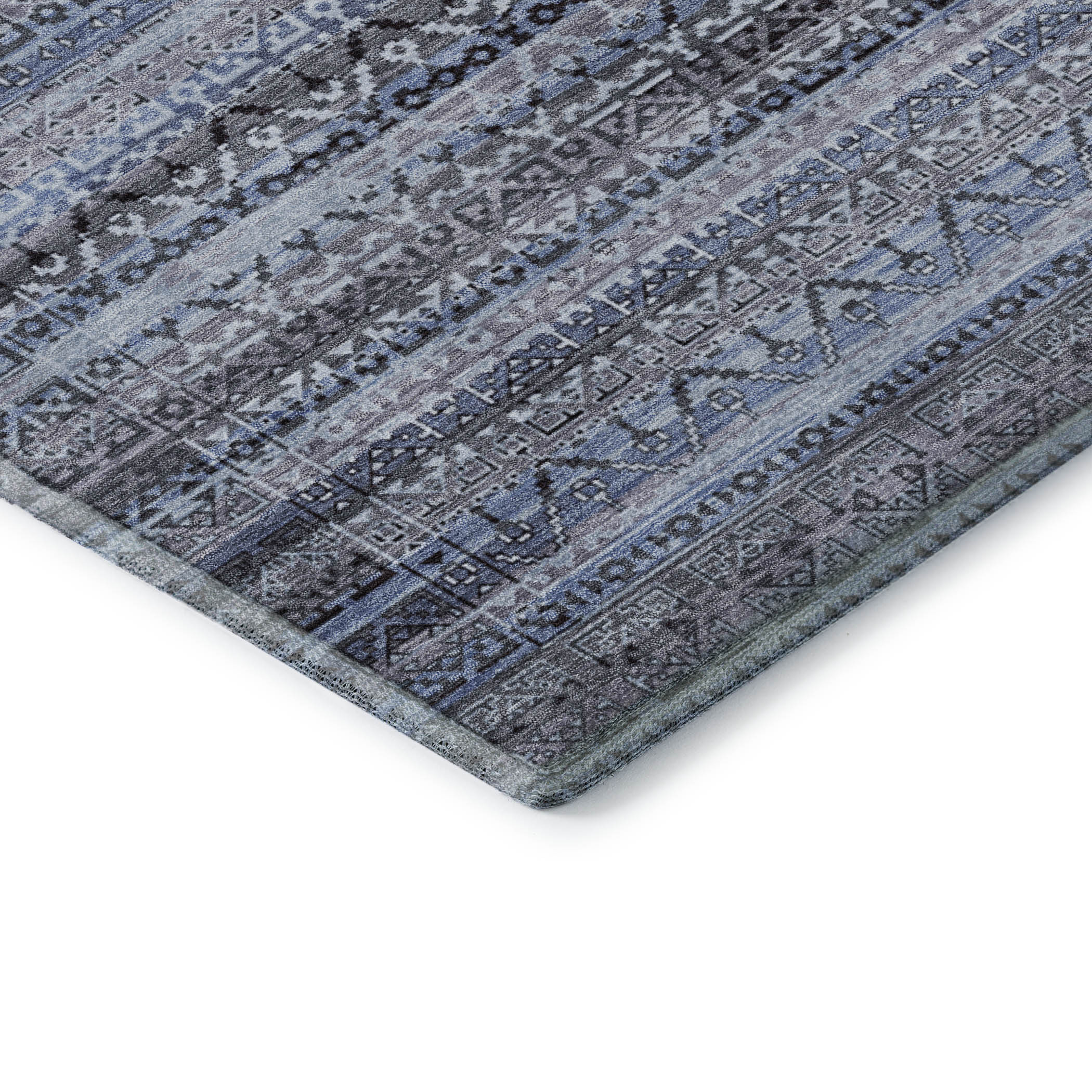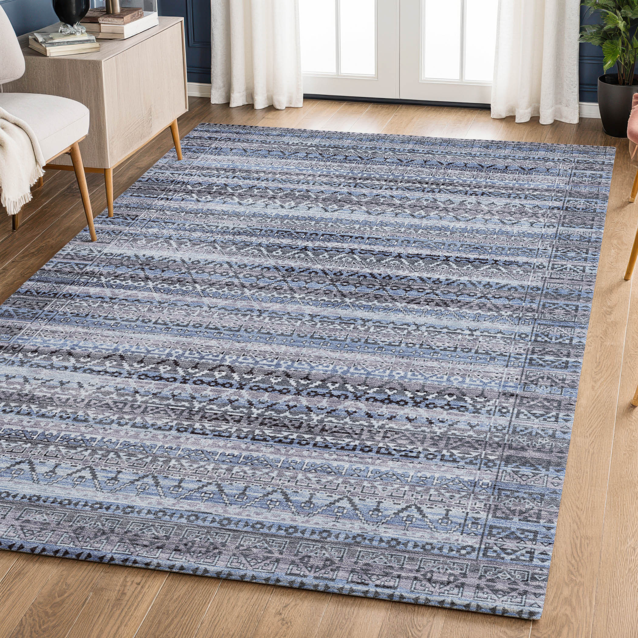Add some artistry to your room with this 5-foot x 8-foot blue and charcoal striped washable area rug with uv protection. Ideal for spaces with kids and pets, this rug is stain resistant to help repel dirt and spilled liquids. Built to last, this rug crafted from polyester fibers is known for its durability and long lasting appeal. Rugs are a great way to showcase your style, hide imperfections, warm your home and reduce noise. This larger sized, transitional styled rug is ready to create a focal point or statement piece in your room. 60.00-inch h x 90.00-inch w x 0.39-inch d.