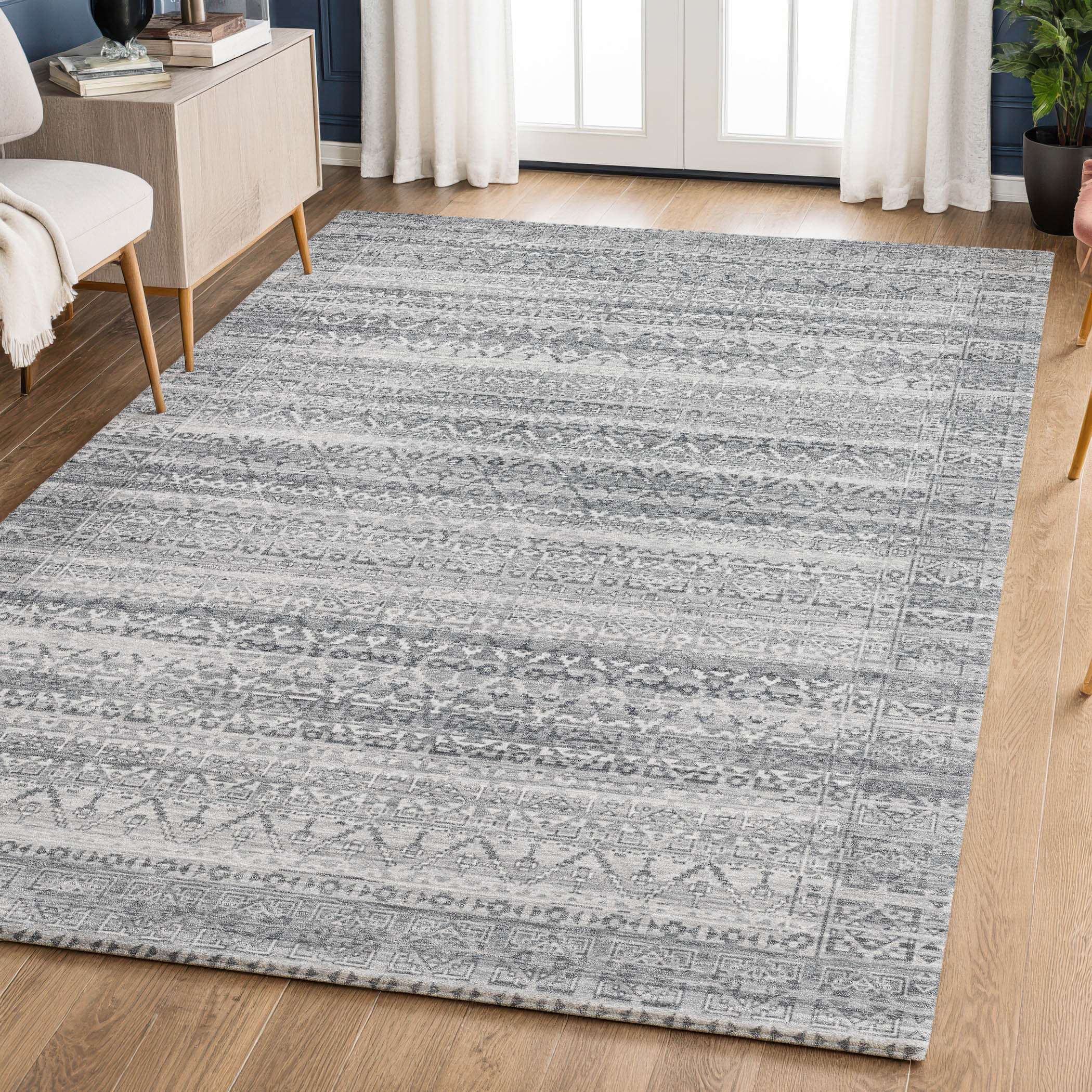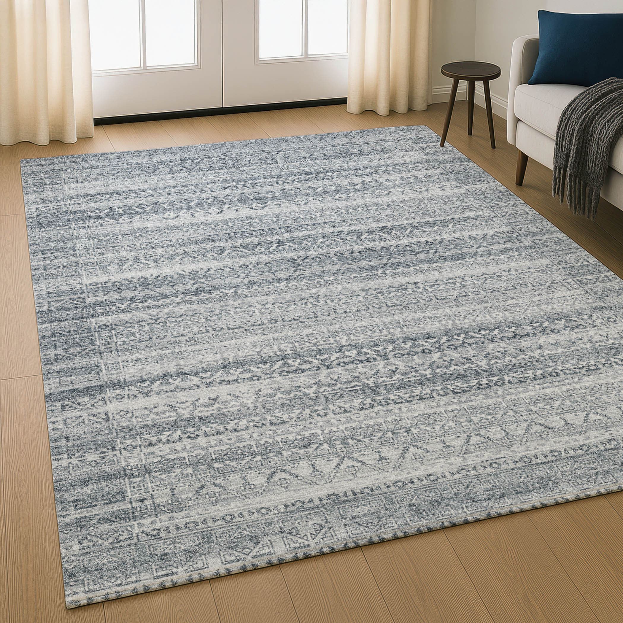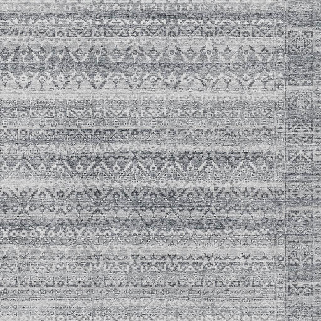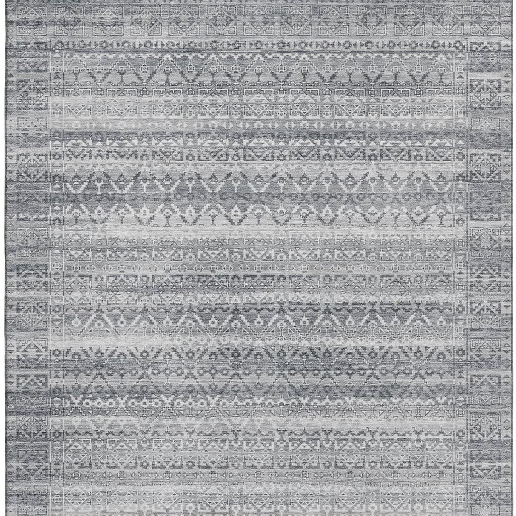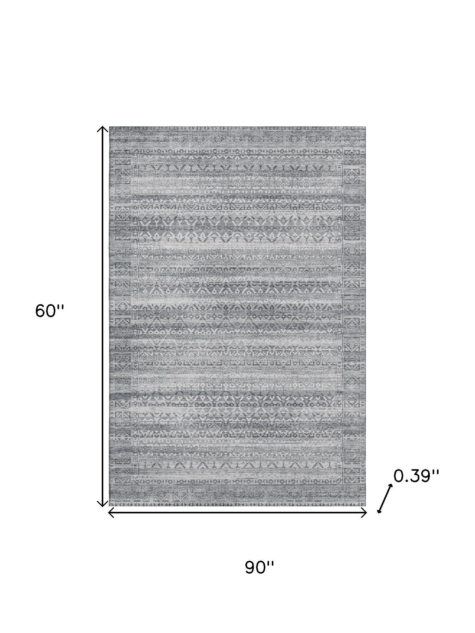 Add some artistry to your room with this 5-foot x 8-foot gray and silver striped washable area rug with uv protection. Ideal for spaces with kids and pets, this rug is stain resistant to help repel dirt and spilled liquids. Built to last, this rug crafted from polyester fibers is known for its durability and long lasting appeal. Rugs are a great way to showcase your style, hide imperfections, warm your home and reduce noise. This larger sized, transitional styled rug is ready to create a focal point or statement piece in your room. 60.00-inch h x 90.00-inch w x 0.39-inch d.