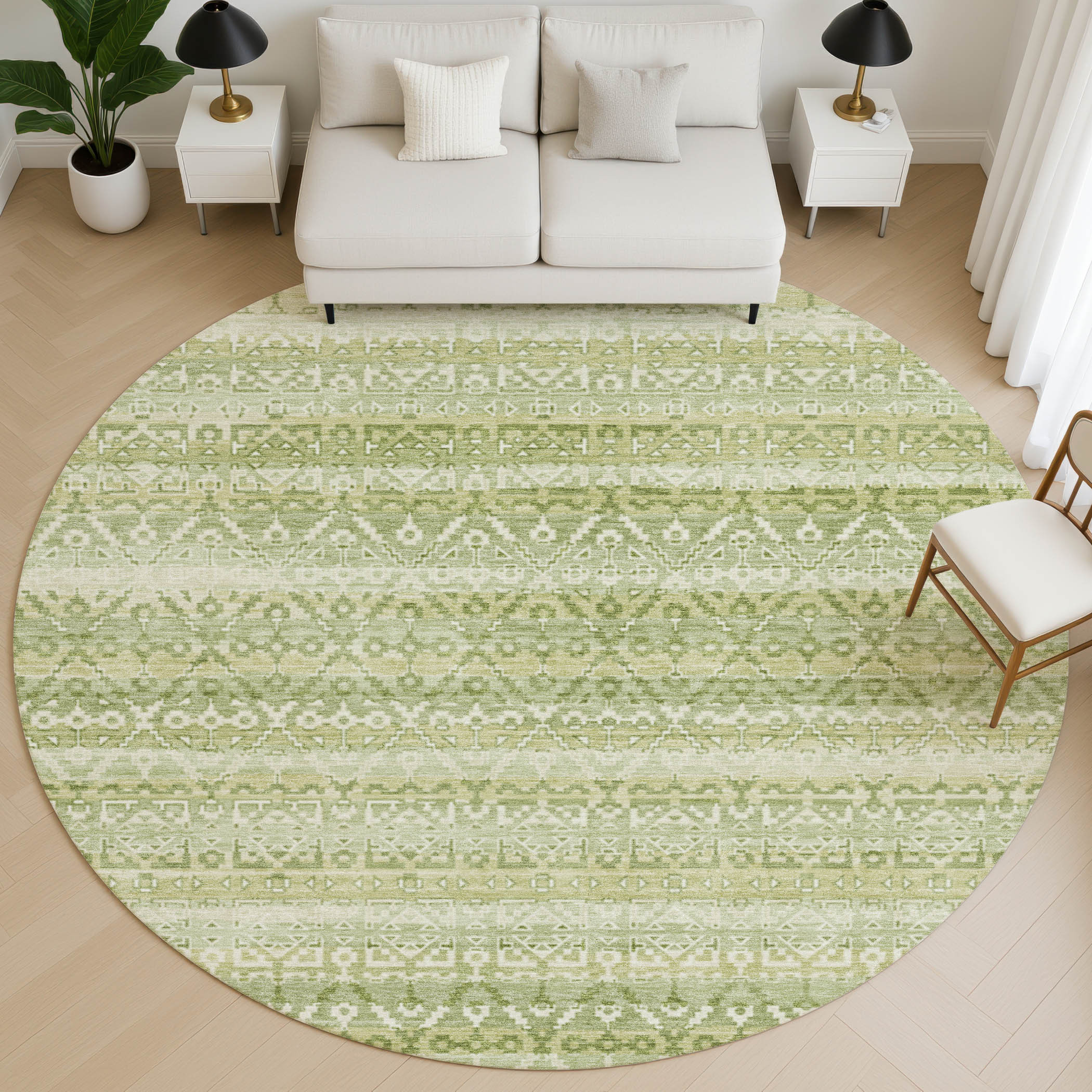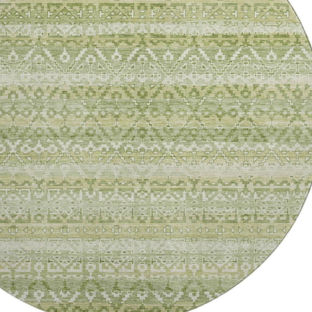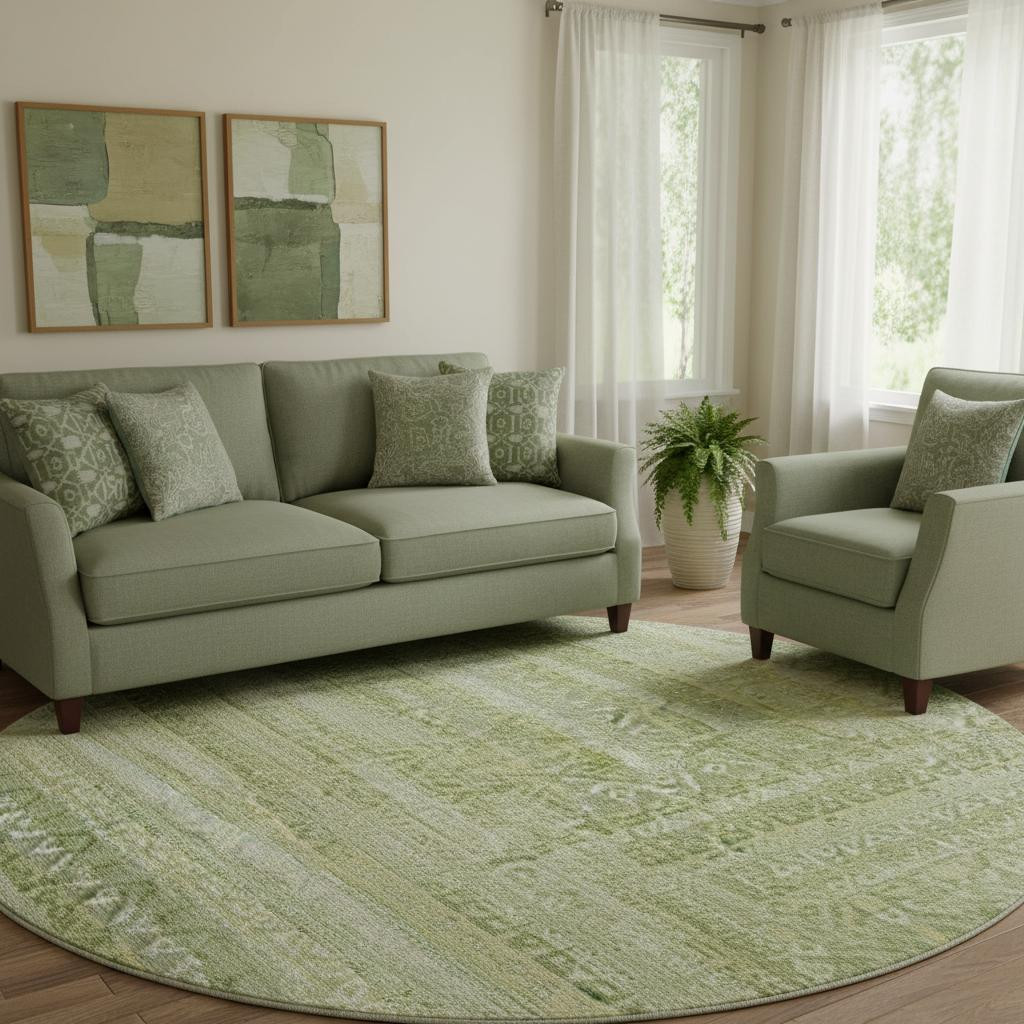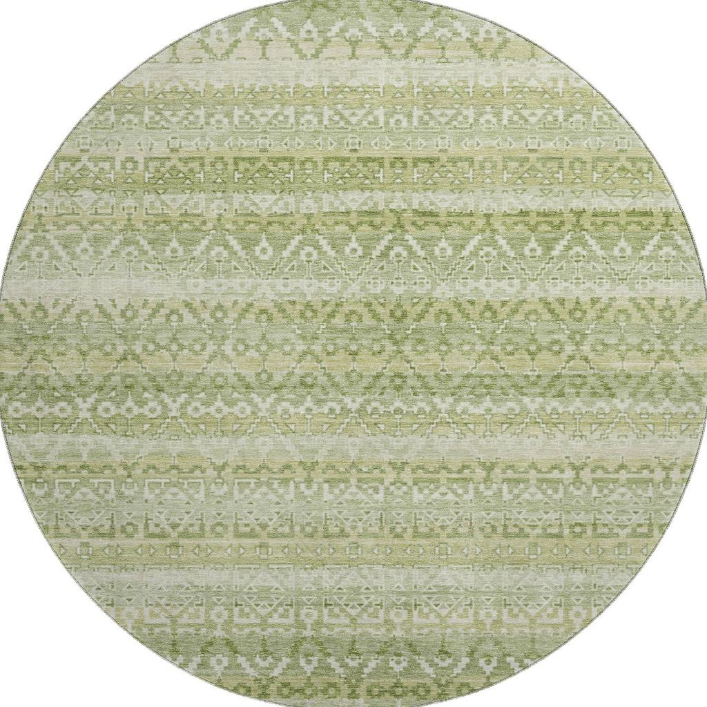 Add some artistry to your room with this 8-foot sage and beige striped washable round rug with uv protection. Ideal for spaces with kids and pets, this rug is stain resistant to help repel dirt and spilled liquids. Built to last, this rug crafted from polyester fibers is known for its durability and long lasting appeal. Rugs are a great way to showcase your style, hide imperfections, warm your home and reduce noise. This larger sized, transitional styled rug is ready to create a focal point or statement piece in your room. 96.00-inch h x 96.00-inch w x 0.39-inch d.