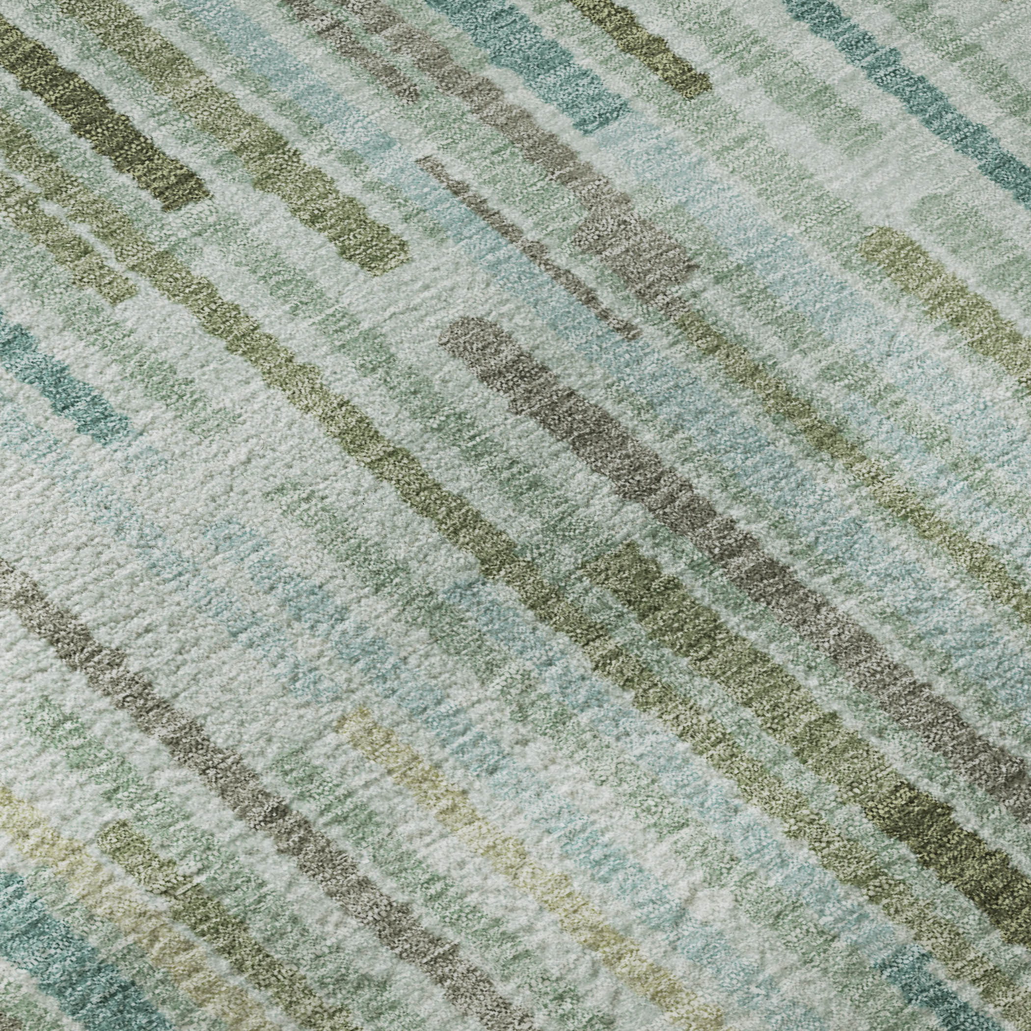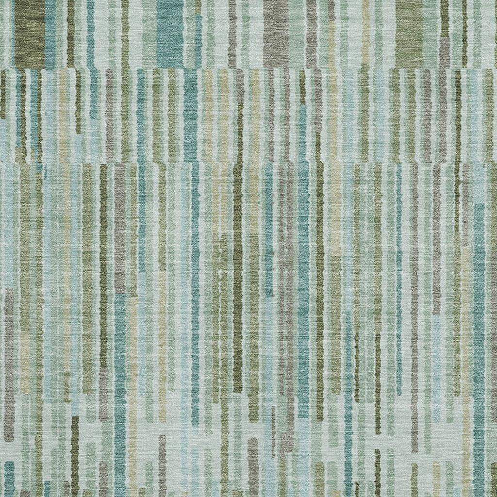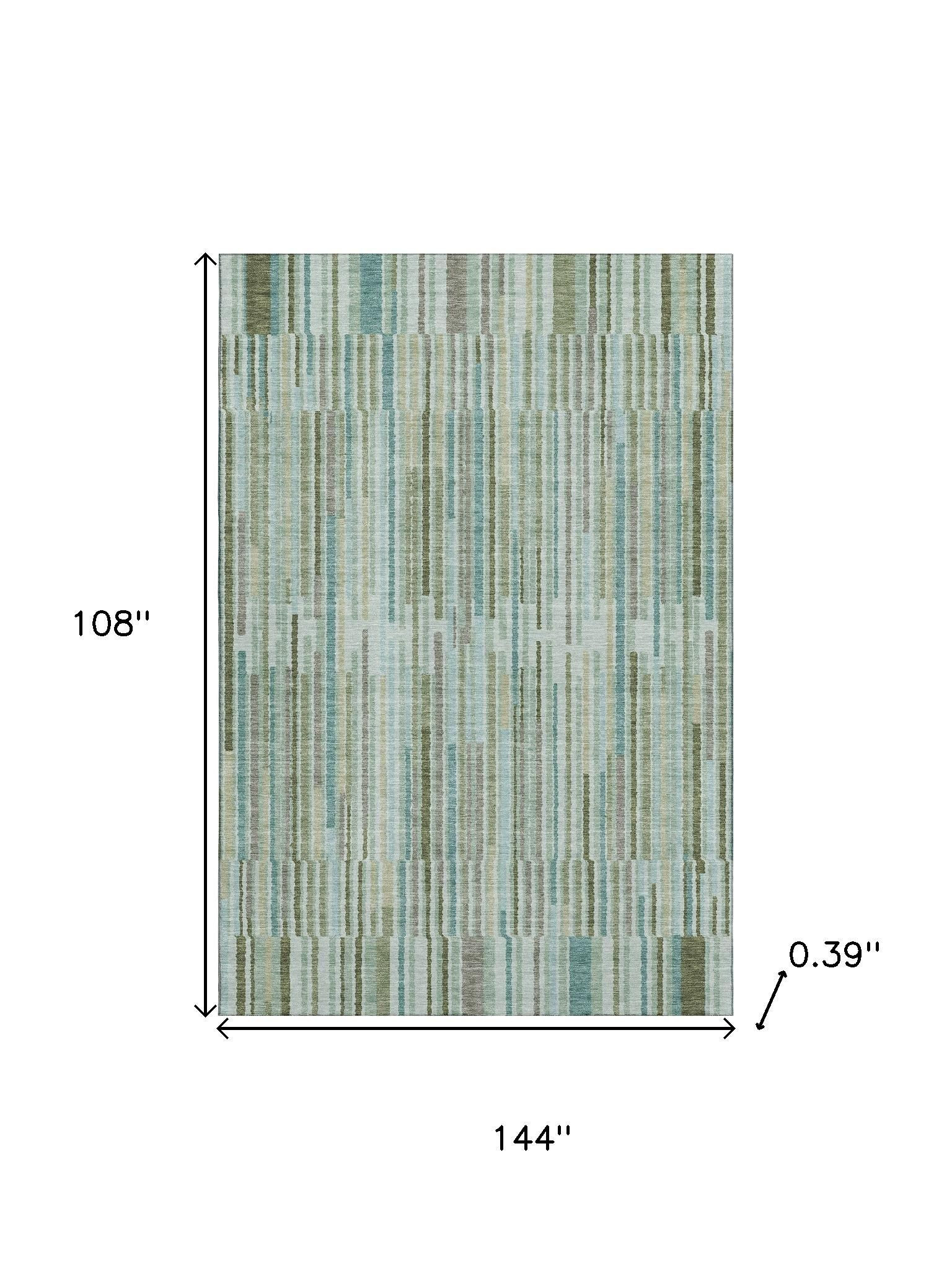 This 9-foot x 12-foot sage and teal striped washable area rug with uv protection, is a great way to add warmth to a room. Ideal for spaces with kids and pets, this rug is stain resistant to help repel dirt and spilled liquids. Built to last, this rug crafted from polyester fibers is known for its durability and long lasting appeal. Rugs are a great way to showcase your style, hide imperfections, warm your home and reduce noise. This larger sized, transitional styled rug is ready to create a focal point or statement piece in your room. 108.00-inch h x 144.00-inch w x 0.39-inch d.