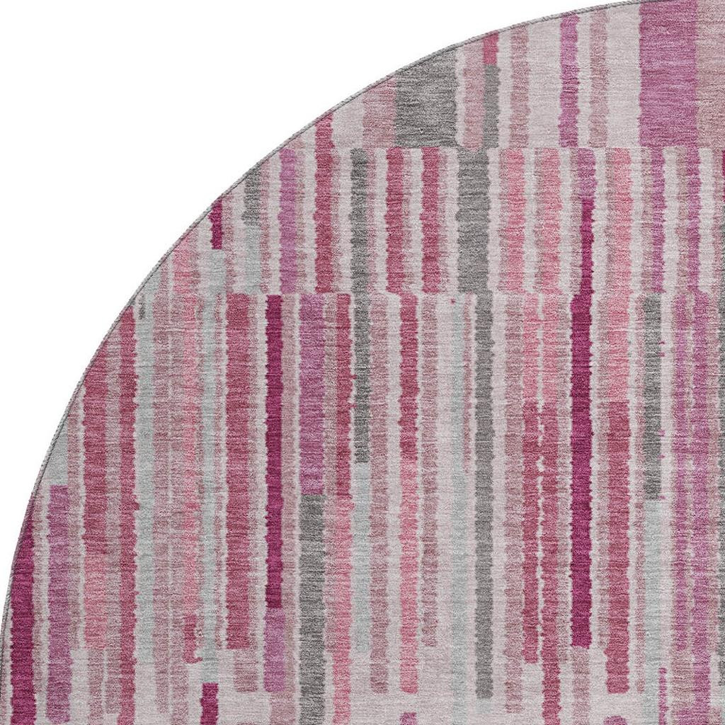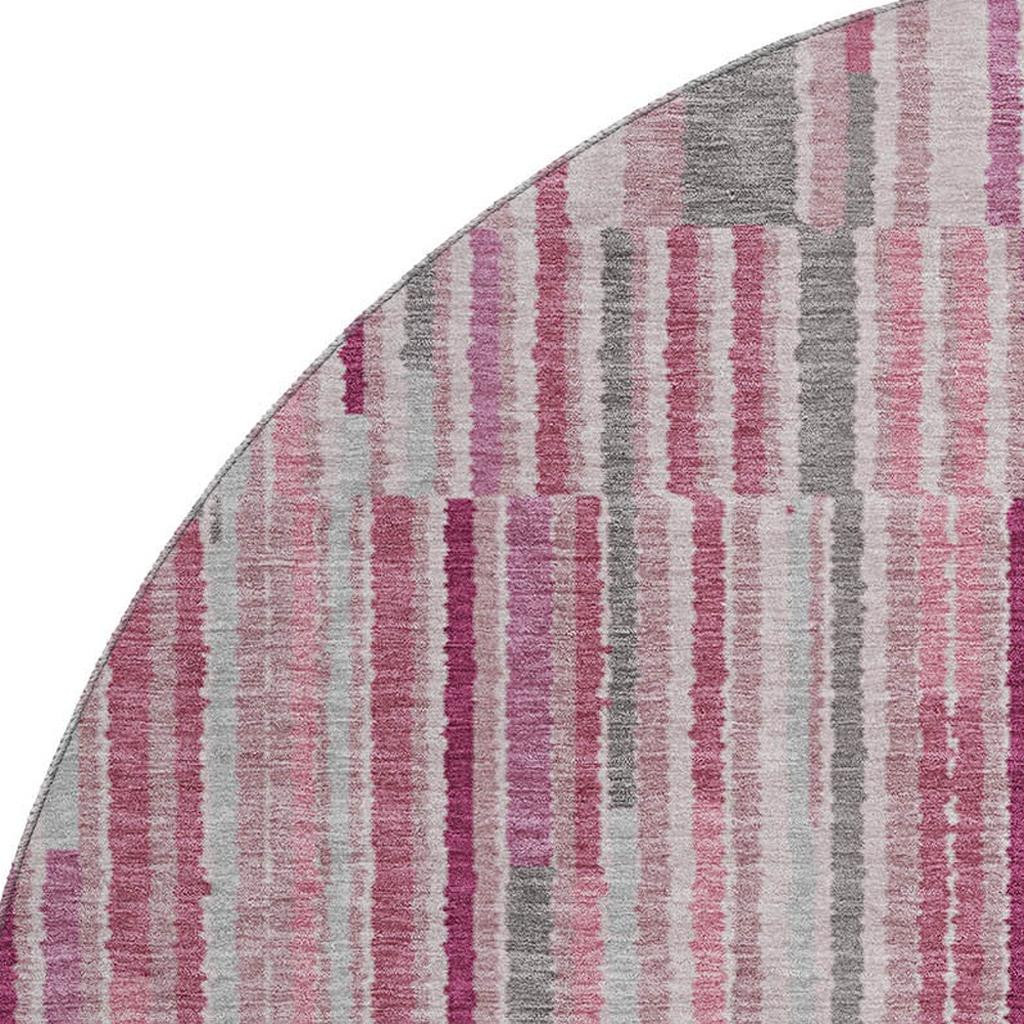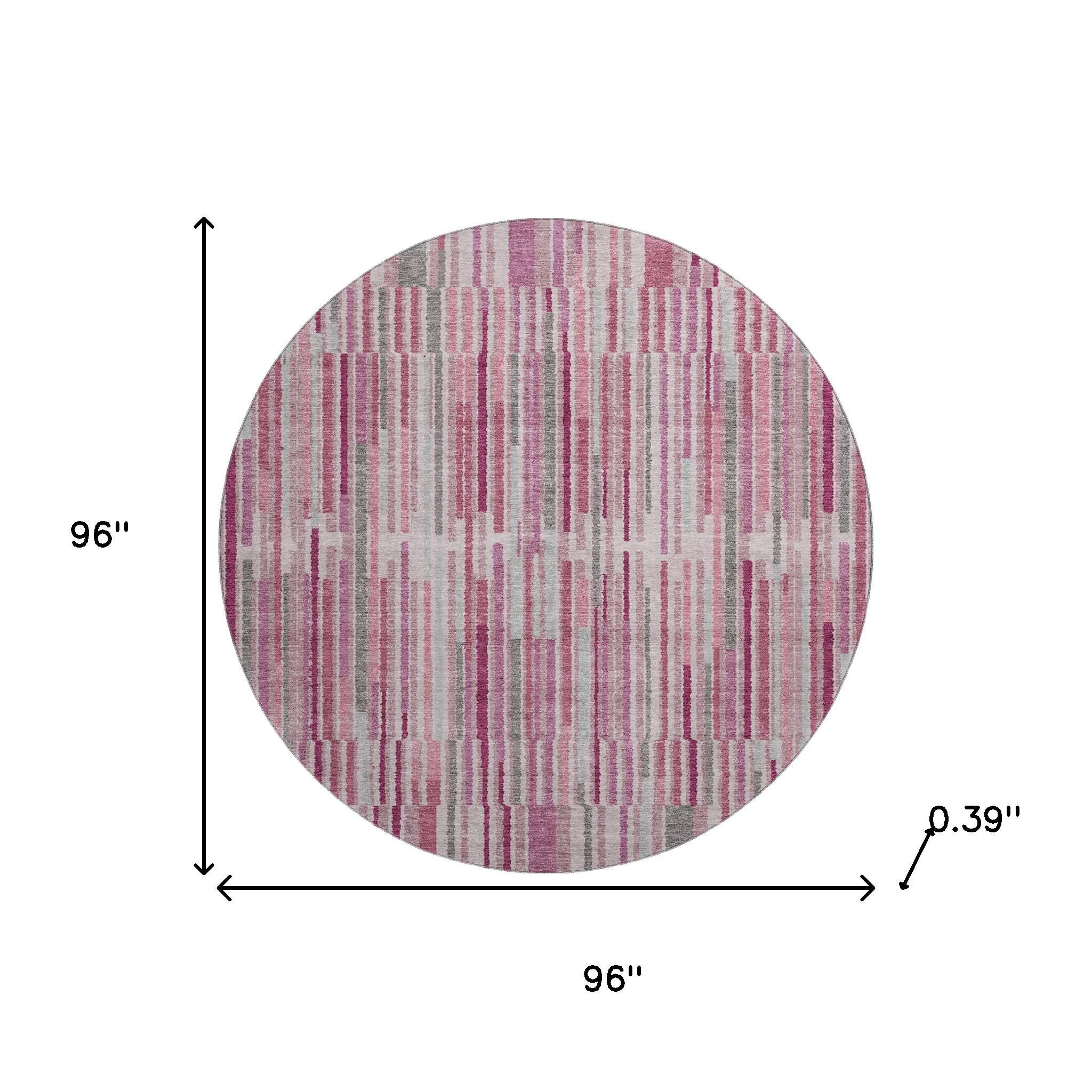 Add some artistry to your room with this 8-foot blush and silver striped washable round rug with uv protection. Ideal for spaces with kids and pets, this rug is stain resistant to help repel dirt and spilled liquids. Built to last, this rug crafted from polyester fibers is known for its durability and long lasting appeal. Rugs are a great way to showcase your style, hide imperfections, warm your home and reduce noise. This larger sized, transitional styled rug is ready to create a focal point or statement piece in your room. 96.00-inch h x 96.00-inch w x 0.39-inch d.