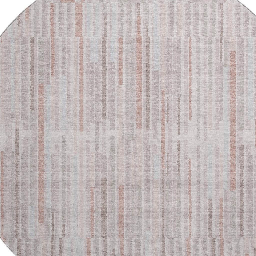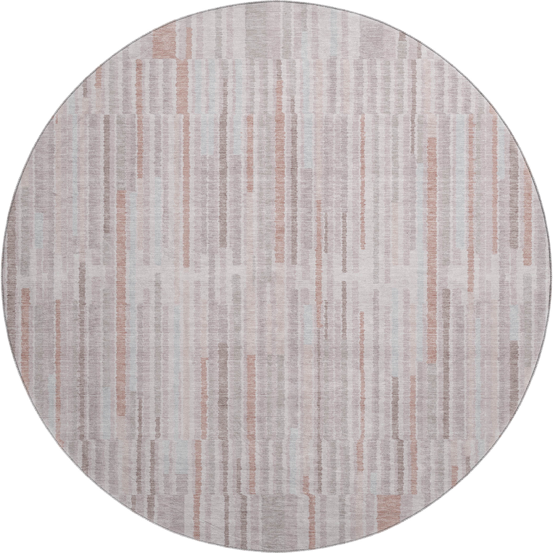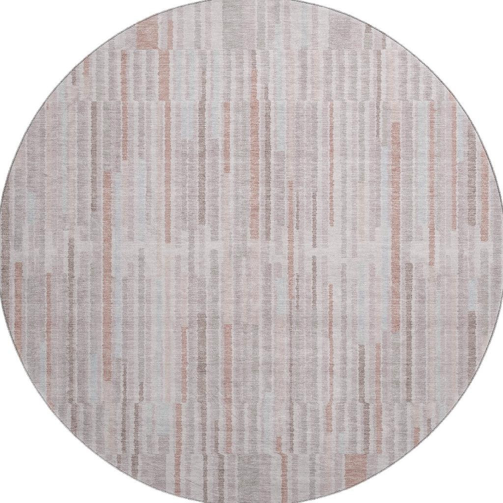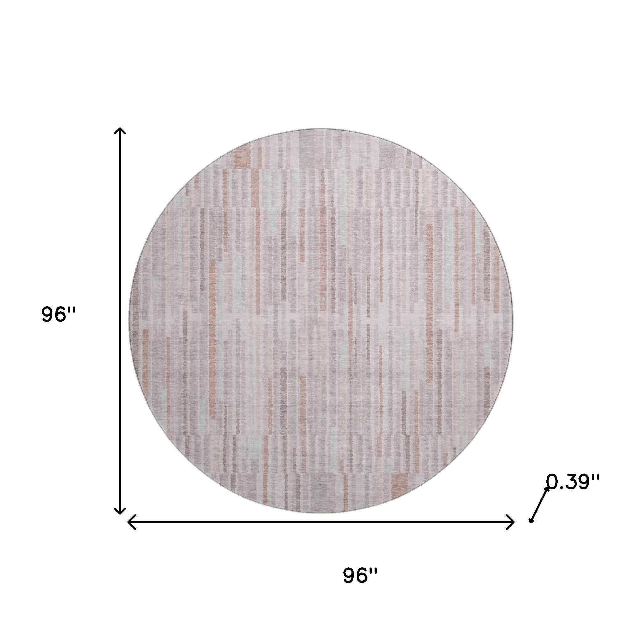 Add some artistry to your room with this 8-foot coral and beige striped washable round rug with uv protection. Ideal for spaces with kids and pets, this rug is stain resistant to help repel dirt and spilled liquids. Built to last, this rug crafted from polyester fibers is known for its durability and long lasting appeal. Rugs are a great way to showcase your style, hide imperfections, warm your home and reduce noise. This larger sized, transitional styled rug is ready to create a focal point or statement piece in your room. 96.00-inch h x 96.00-inch w x 0.39-inch d.