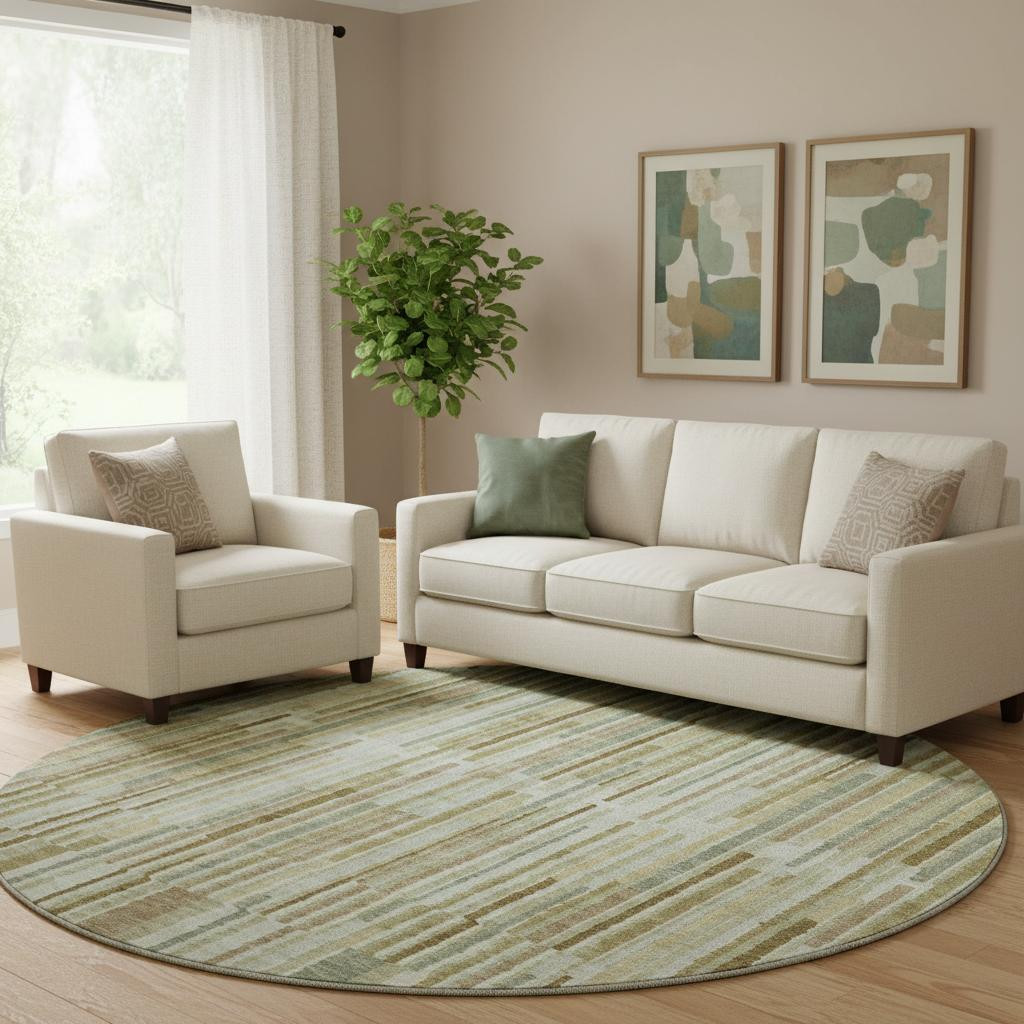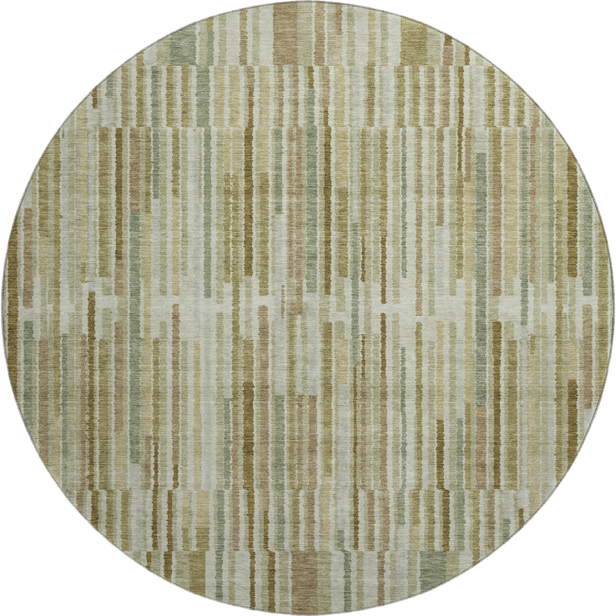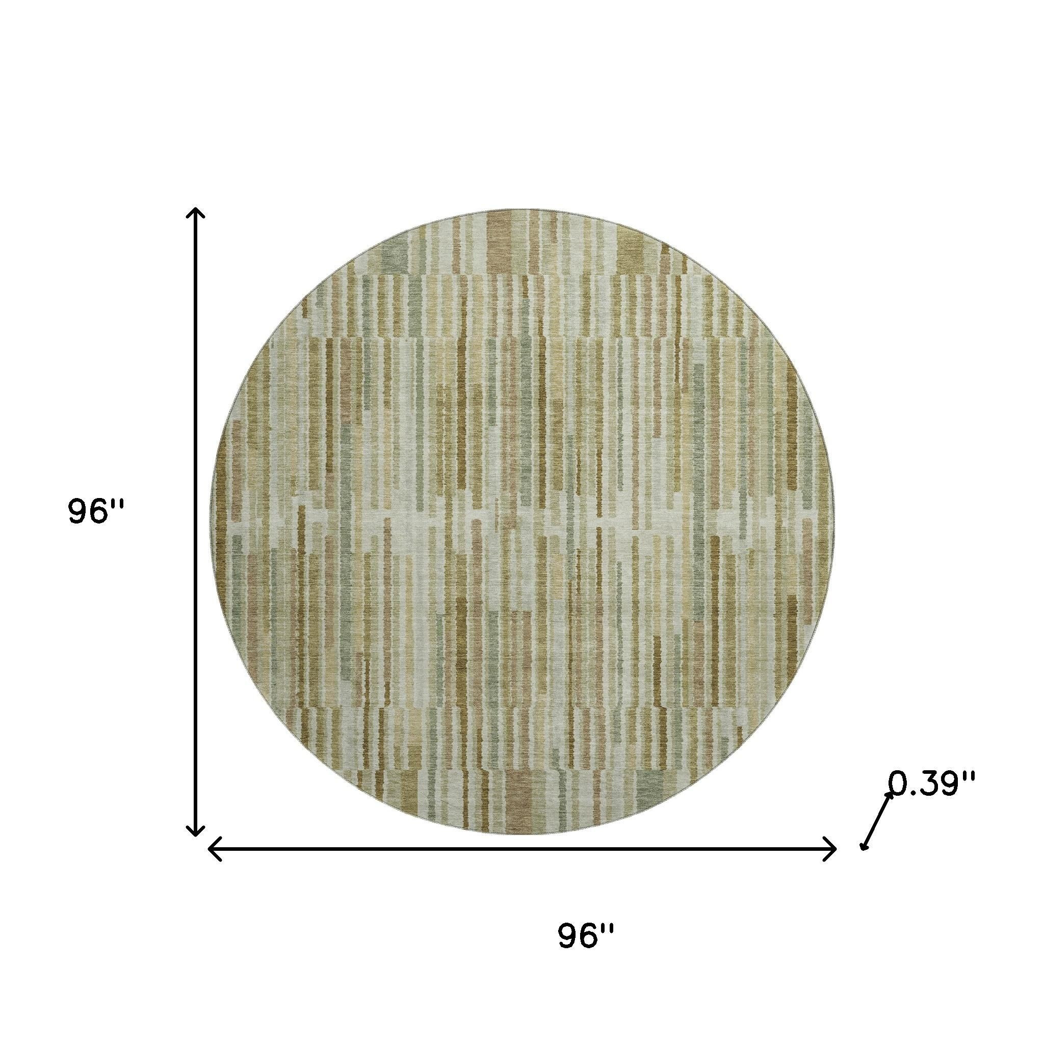 This 8-foot khaki and beige striped washable round rug with uv protection, is a great way to add warmth to a room. Ideal for spaces with kids and pets, this rug is stain resistant to help repel dirt and spilled liquids. Built to last, this rug crafted from polyester fibers is known for its durability and long lasting appeal. Rugs are a great way to showcase your style, hide imperfections, warm your home and reduce noise. This larger sized, transitional styled rug is ready to create a focal point or statement piece in your room. 96.00-inch h x 96.00-inch w x 0.39-inch d.