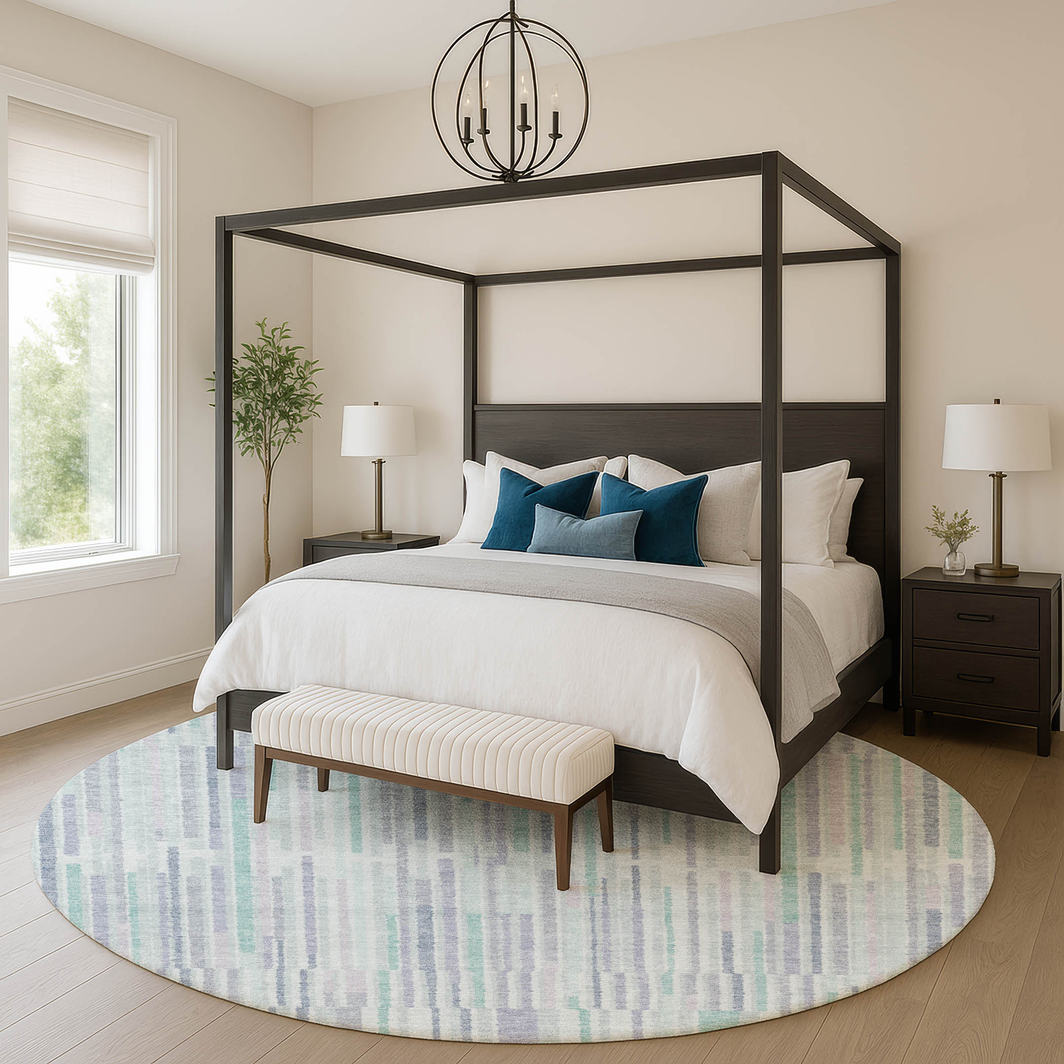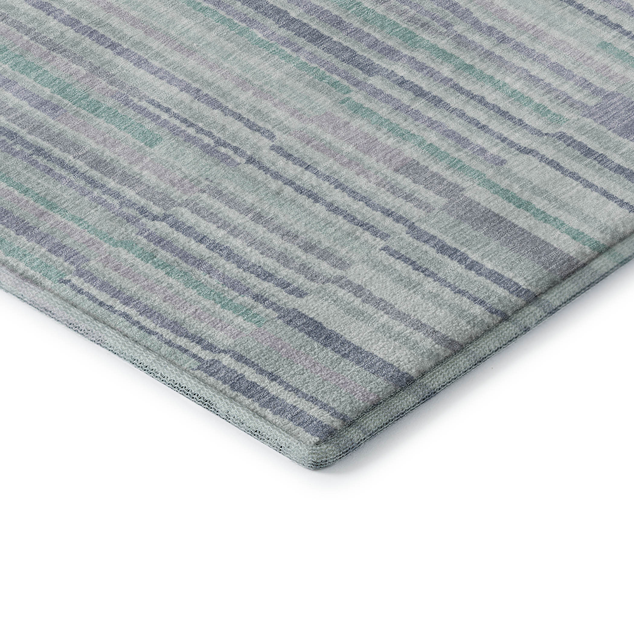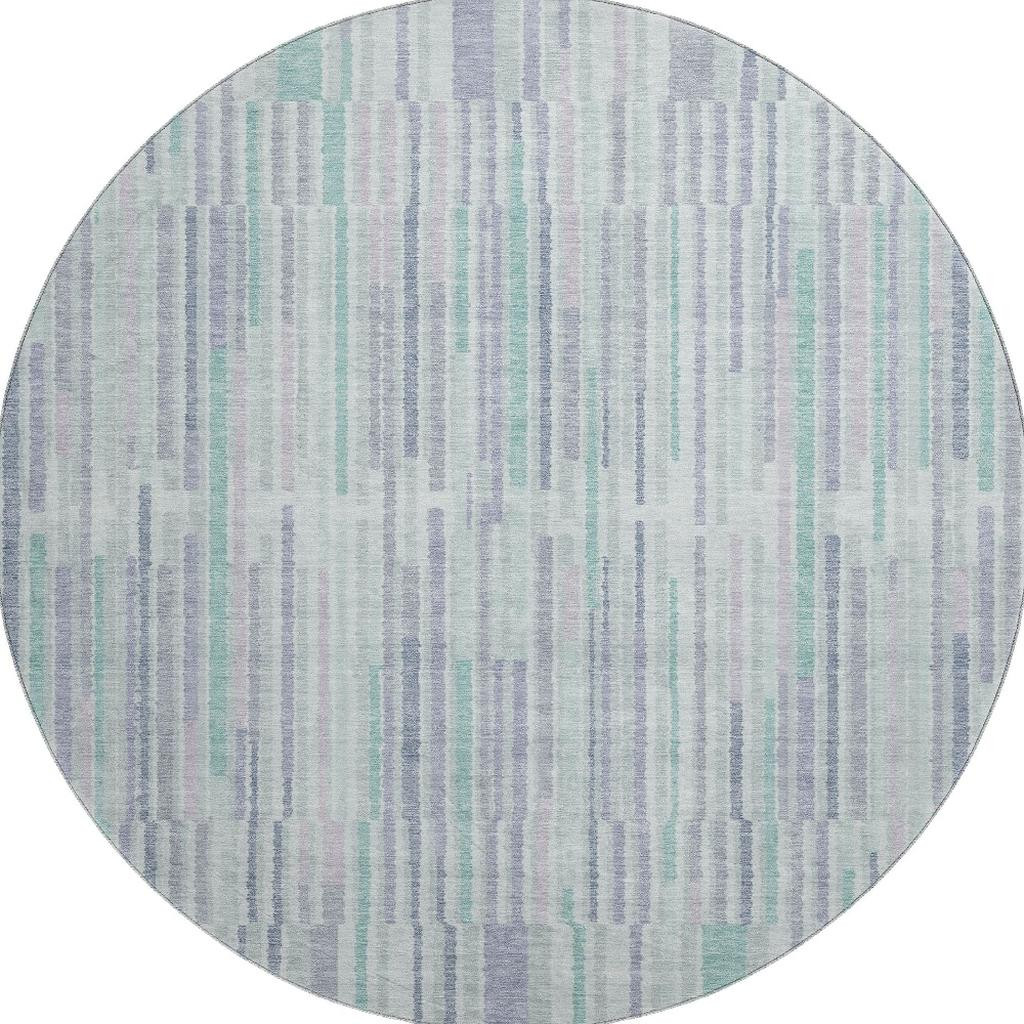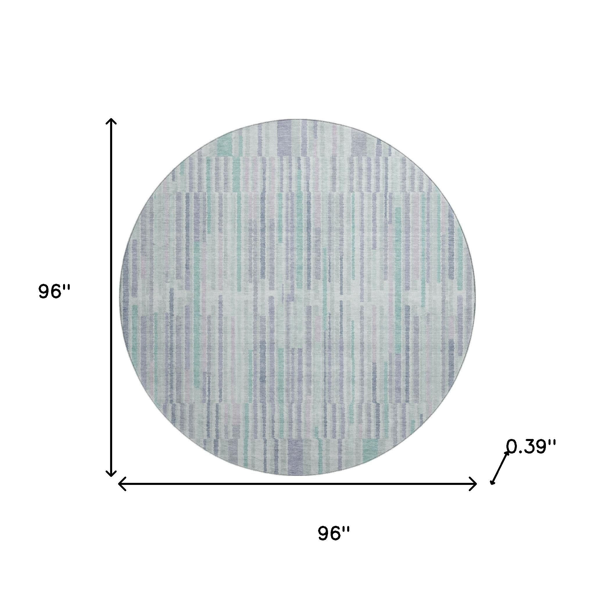 Set an inviting tone in your space with this 8-foot mint green and denim blue striped washable round rug with uv protection. Ideal for spaces with kids and pets, this rug is stain resistant to help repel dirt and spilled liquids. Built to last, this rug crafted from polyester fibers is known for its durability and long lasting appeal. Rugs are a great way to showcase your style, hide imperfections, warm your home and reduce noise. This larger sized, transitional styled rug is ready to create a focal point or statement piece in your room. 96.00-inch h x 96.00-inch w x 0.39-inch d.