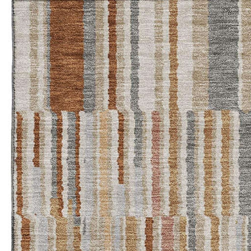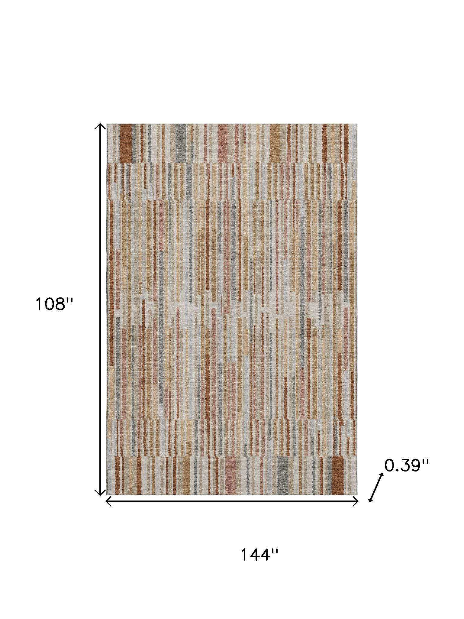 Add great coloration and comfortable texture to your space with this 9-foot x 12-foot rust and gray striped washable area rug with uv protection. Ideal for spaces with kids and pets, this rug is stain resistant to help repel dirt and spilled liquids. Built to last, this rug crafted from polyester fibers is known for its durability and long lasting appeal. Rugs are a great way to showcase your style, hide imperfections, warm your home and reduce noise. This larger sized, transitional styled rug is ready to create a focal point or statement piece in your room. 108.00-inch h x 144.00-inch w x 0.39-inch d.