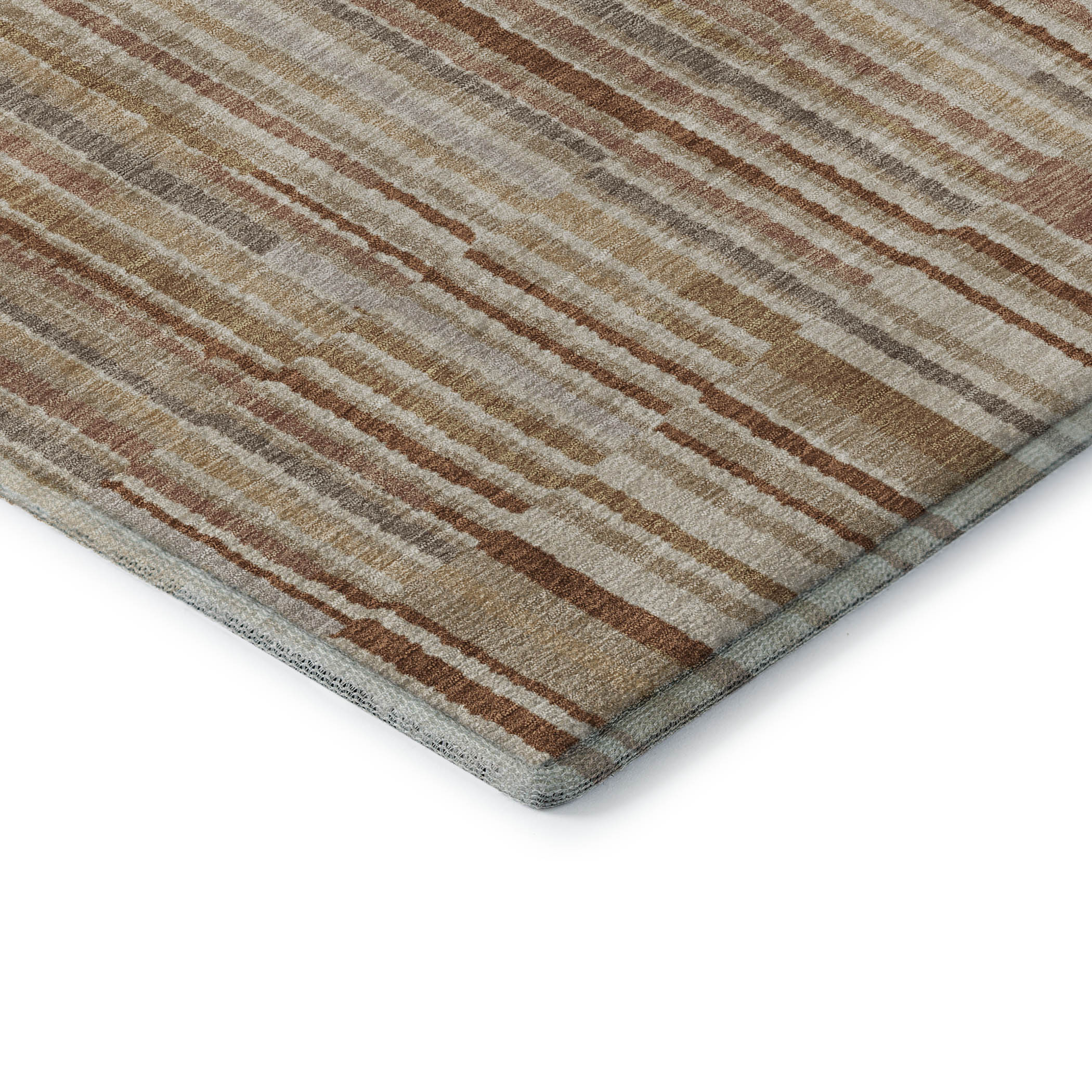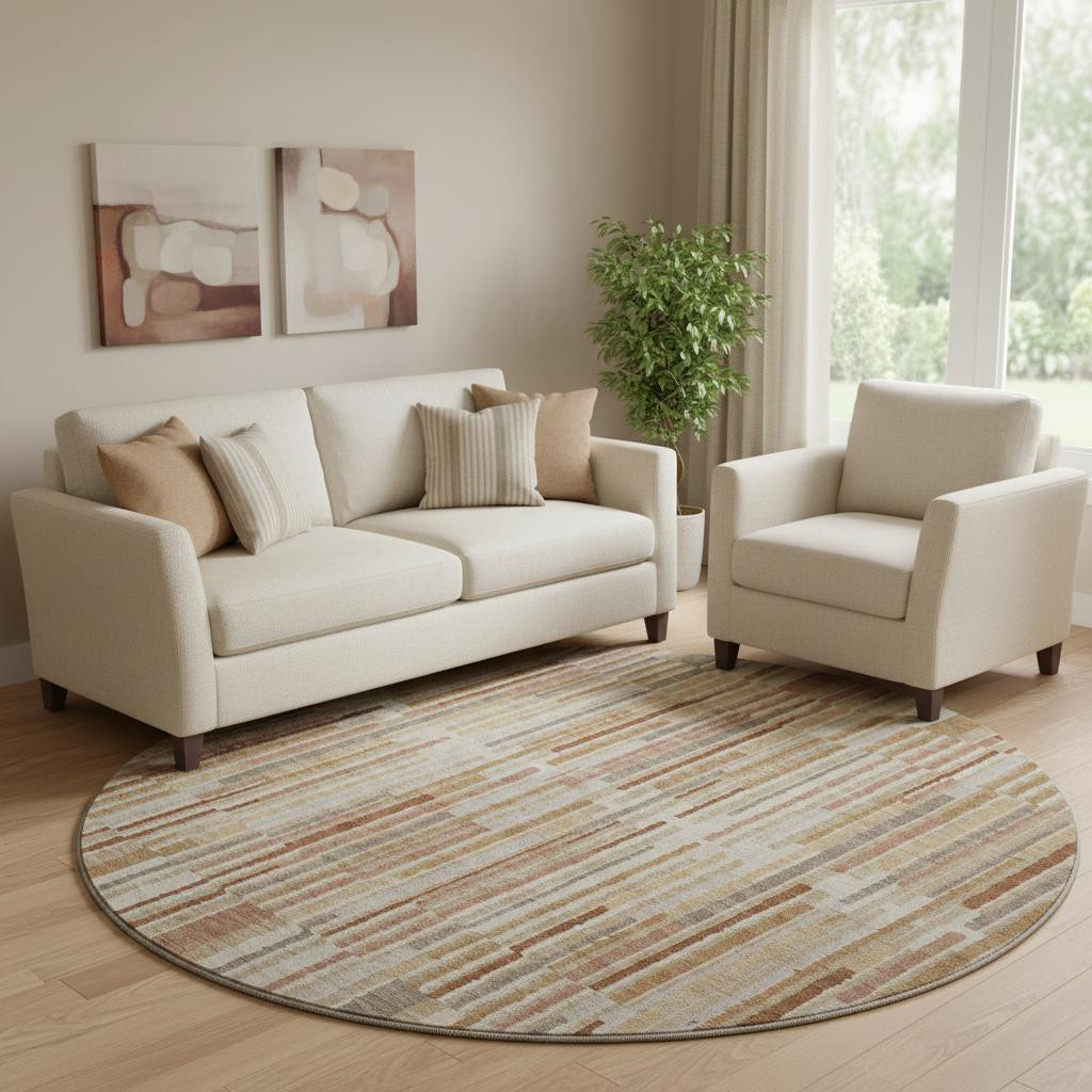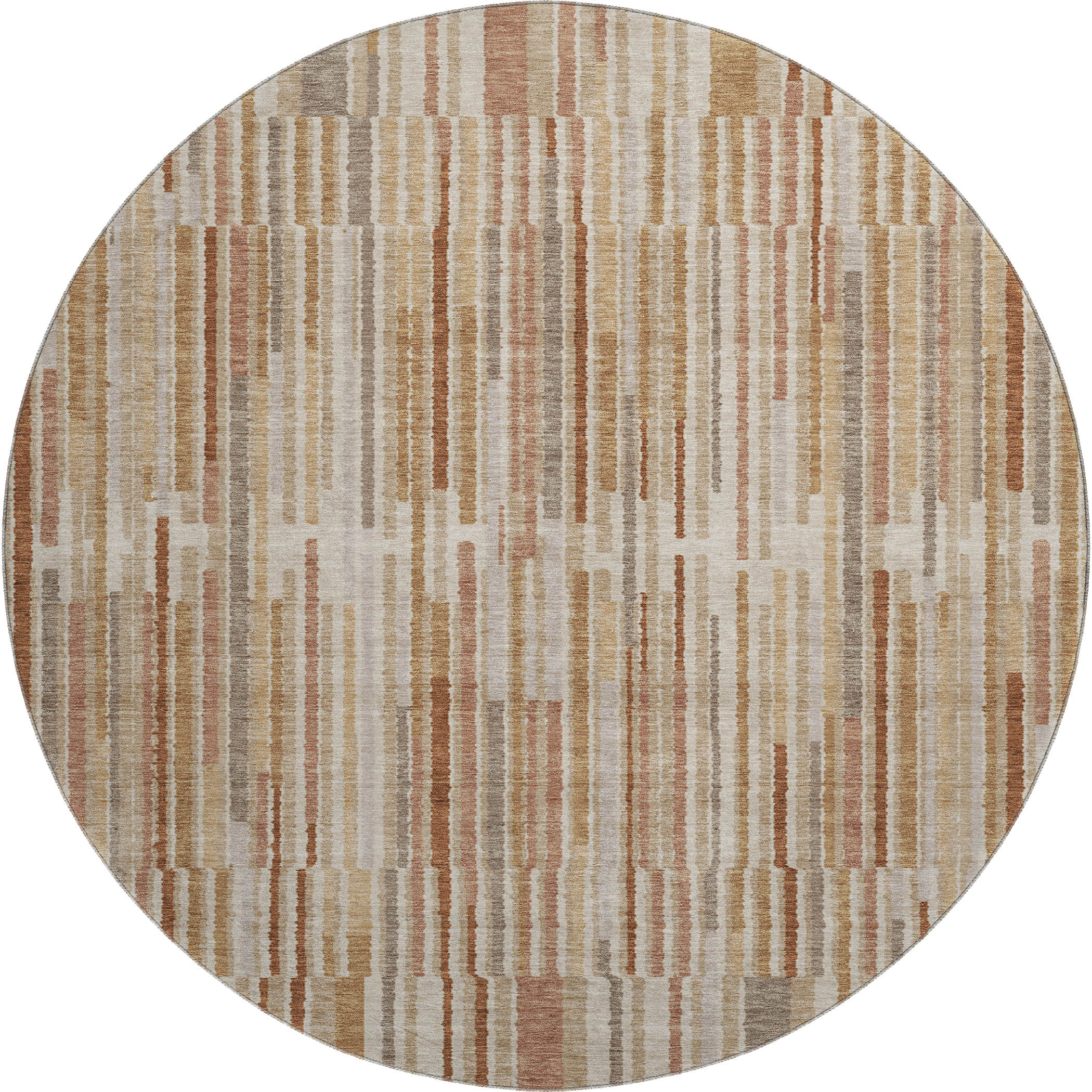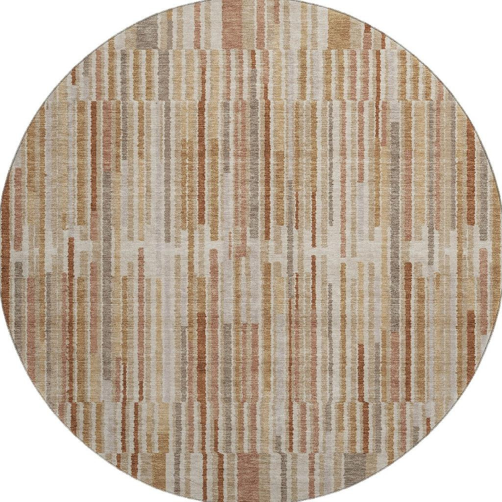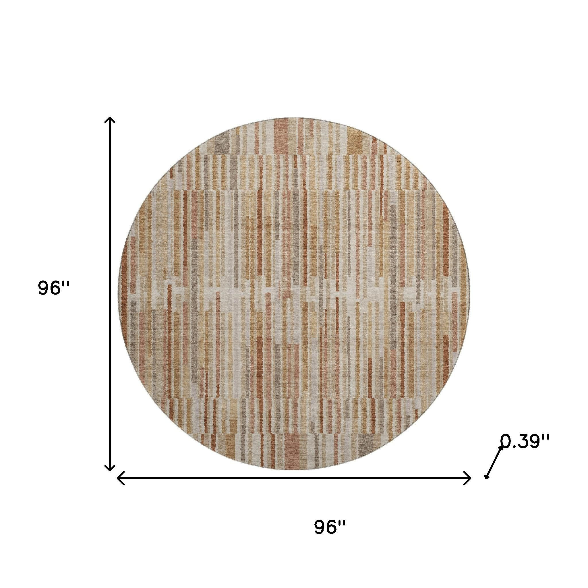 Set an inviting tone in your space with this 8-foot terra cotta and beige striped washable round rug with uv protection. Ideal for spaces with kids and pets, this rug is stain resistant to help repel dirt and spilled liquids. Built to last, this rug crafted from polyester fibers is known for its durability and long lasting appeal. Rugs are a great way to showcase your style, hide imperfections, warm your home and reduce noise. This larger sized, transitional styled rug is ready to create a focal point or statement piece in your room. 96.00-inch h x 96.00-inch w x 0.39-inch d.
