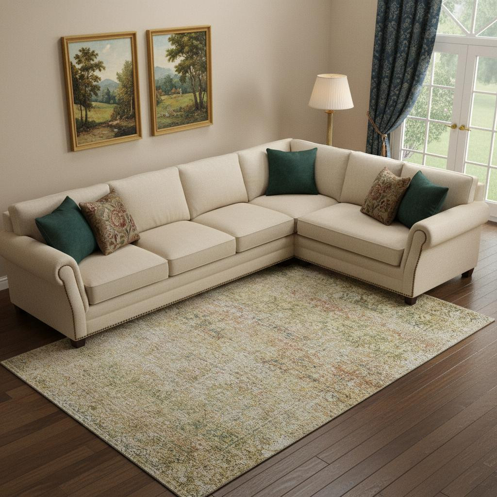 This 8-foot x 10-foot gold and beige abstract washable area rug with uv protection, is a great way to add warmth to a room. Ideal for spaces with kids and pets, this rug is stain resistant to help repel dirt and spilled liquids. Built to last, this rug crafted from polyester fibers is known for its durability and long lasting appeal. Rugs are a great way to showcase your style, hide imperfections, warm your home and reduce noise. This larger sized, traditional styled rug is ready to create a focal point or statement piece in your room. 96.00-inch h x 120.00-inch w x 0.39-inch d.