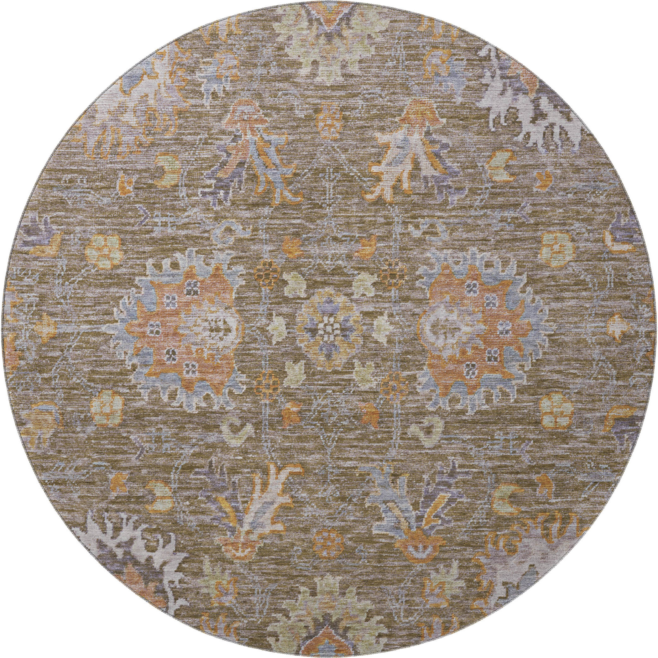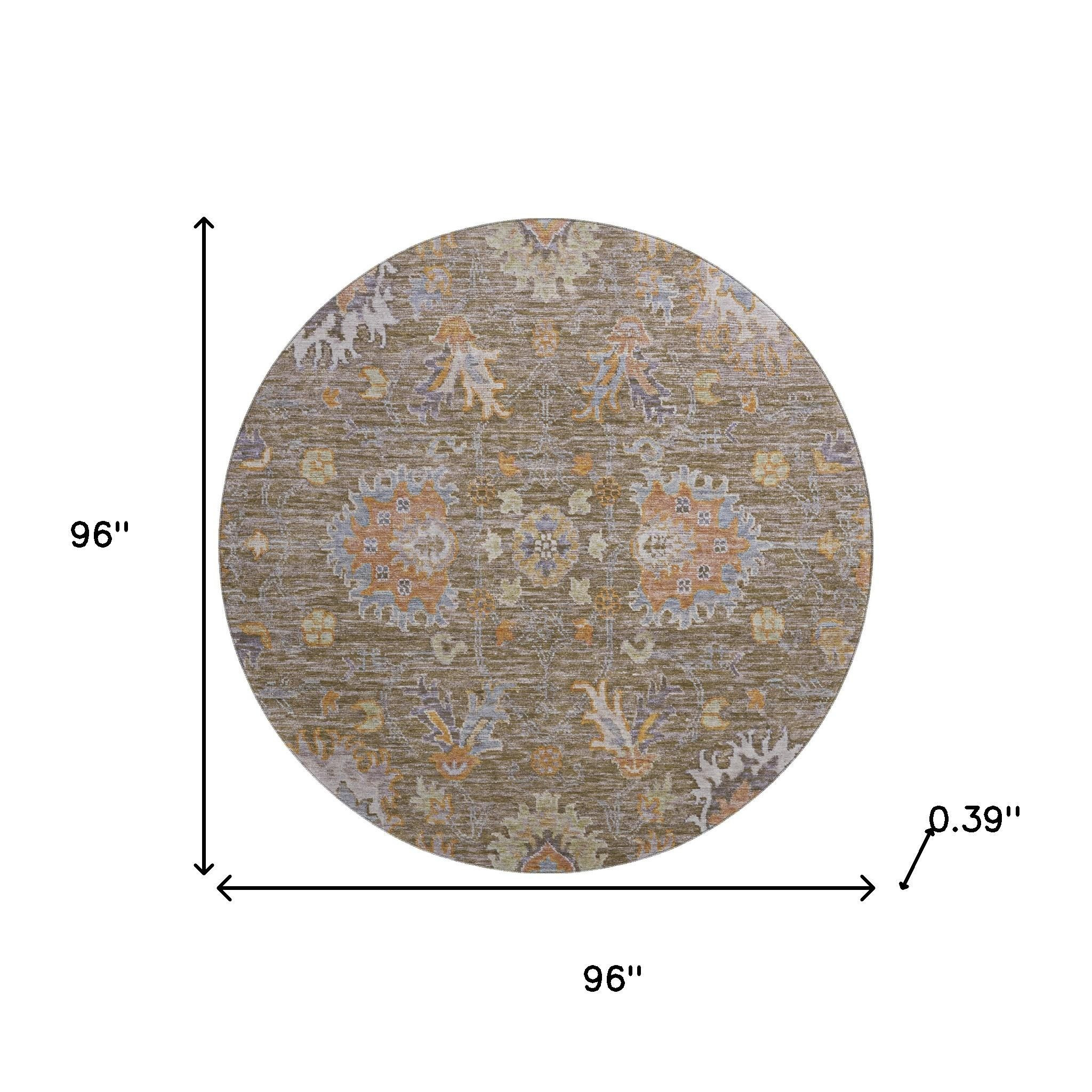 This 8-foot brown and lavender oriental washable round rug with uv protection, is a great way to add warmth to a room. Ideal for spaces with kids and pets, this rug is stain resistant to help repel dirt and spilled liquids. Built to last, this rug crafted from polyester fibers is known for its durability and long lasting appeal. Rugs are a great way to showcase your style, hide imperfections, warm your home and reduce noise. This larger sized, traditional styled rug is ready to create a focal point or statement piece in your room. 96.00-inch h x 96.00-inch w x 0.39-inch d.