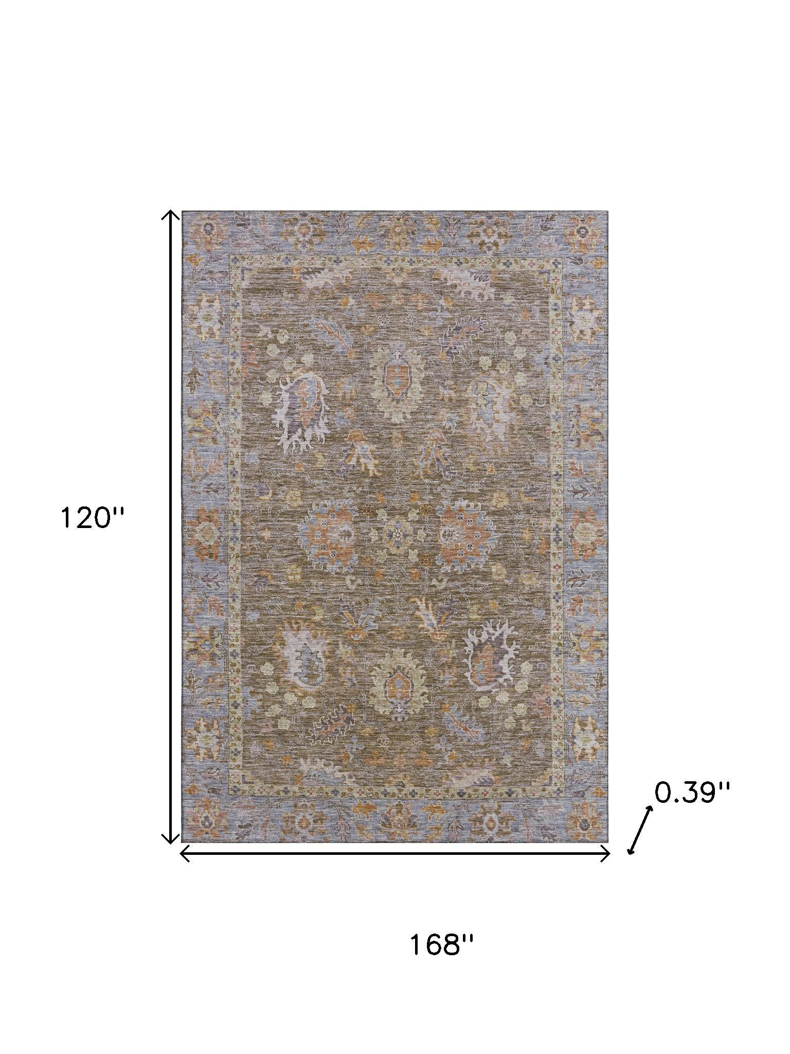 This 10-foot x 14-foot brown and lavender oriental washable area rug with uv protection, is a great way to add warmth to a room. Ideal for spaces with kids and pets, this rug is stain resistant to help repel dirt and spilled liquids. Built to last, this rug crafted from polyester fibers is known for its durability and long lasting appeal. Rugs are a great way to showcase your style, hide imperfections, warm your home and reduce noise. This larger sized, traditional styled rug is ready to create a focal point or statement piece in your room. 120.00-inch h x 168.00-inch w x 0.39-inch d.
