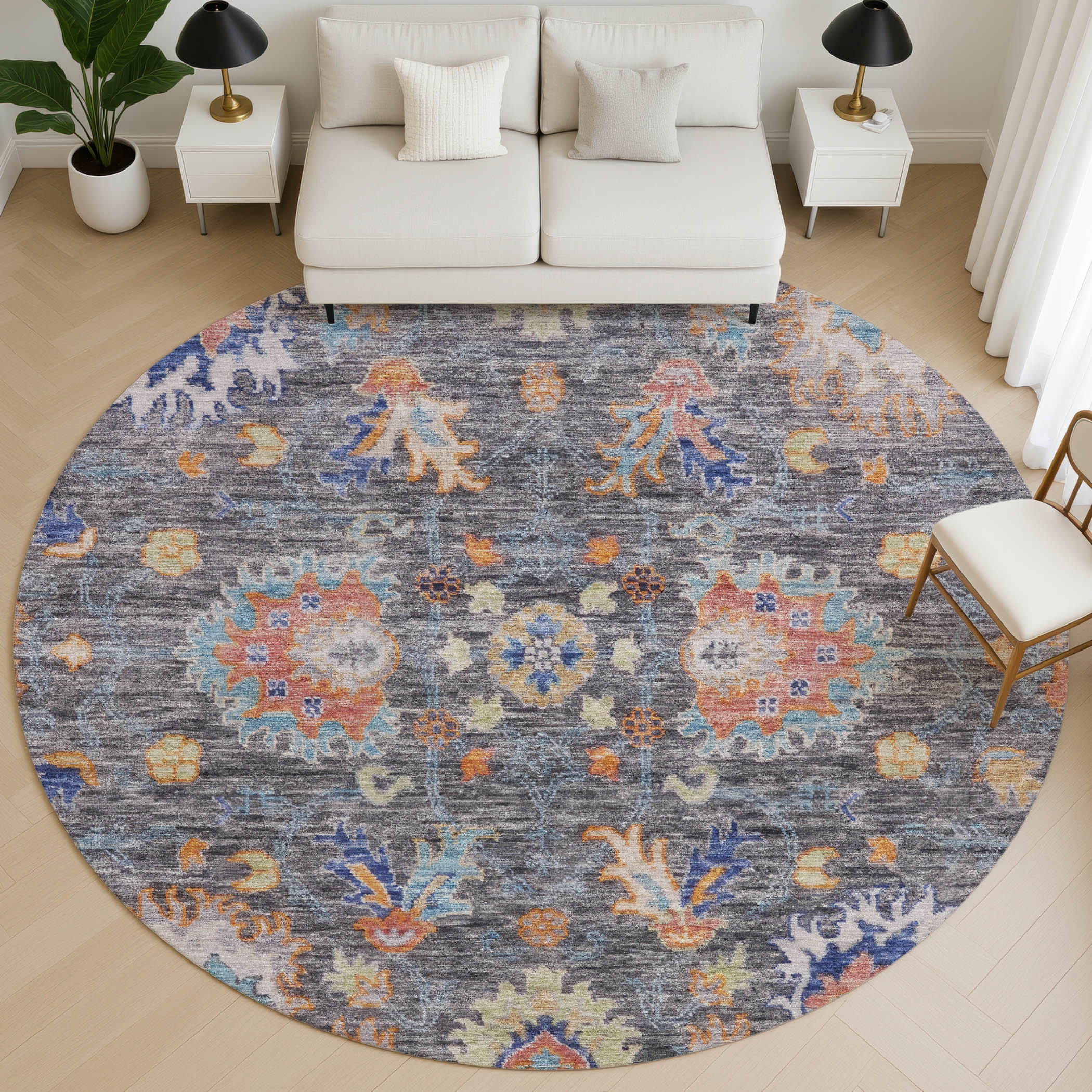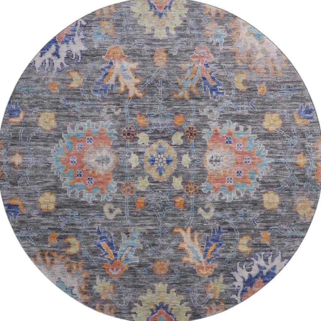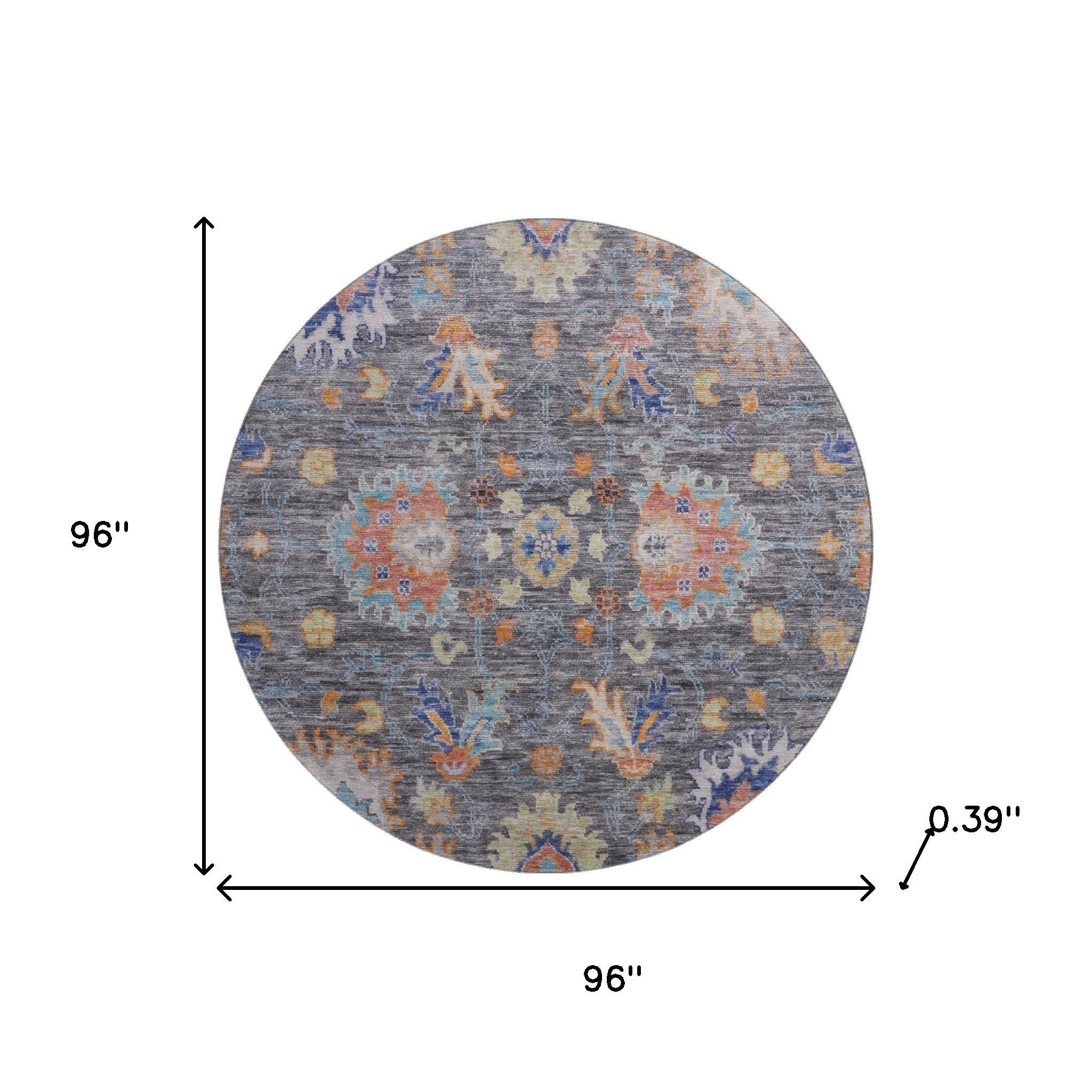 Add some artistry to your room with this 8-foot gray and copper oriental washable round rug with uv protection. Ideal for spaces with kids and pets, this rug is stain resistant to help repel dirt and spilled liquids. Built to last, this rug crafted from polyester fibers is known for its durability and long lasting appeal. Rugs are a great way to showcase your style, hide imperfections, warm your home and reduce noise. This larger sized, traditional styled rug is ready to create a focal point or statement piece in your room. 96.00-inch h x 96.00-inch w x 0.39-inch d.