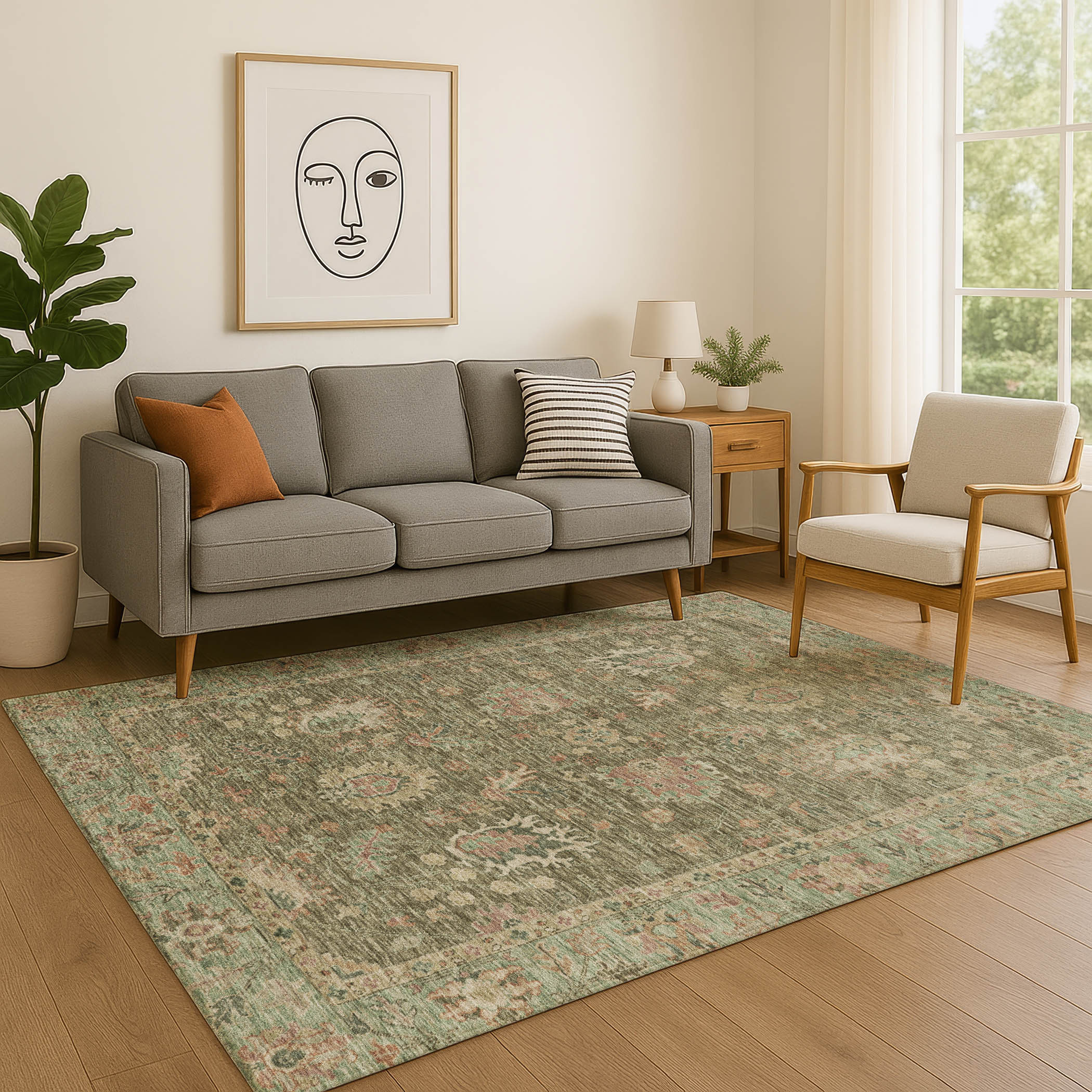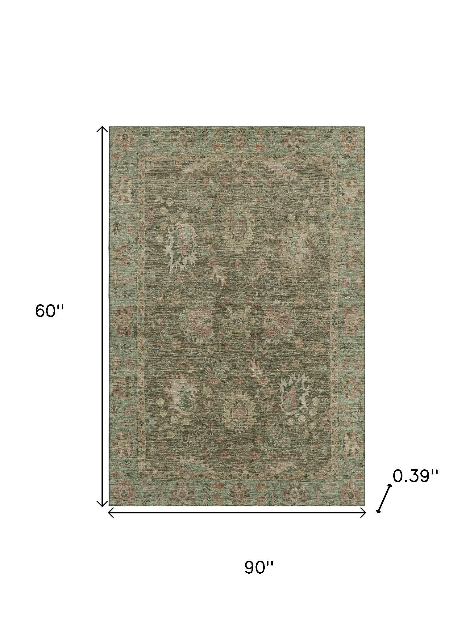 Add great coloration and comfortable texture to your space with this 5-foot x 8-foot olive green and beige oriental washable area rug with uv protection. Ideal for spaces with kids and pets, this rug is stain resistant to help repel dirt and spilled liquids. Built to last, this rug crafted from polyester fibers is known for its durability and long lasting appeal. Rugs are a great way to showcase your style, hide imperfections, warm your home and reduce noise. This larger sized, traditional styled rug is ready to create a focal point or statement piece in your room. 60.00-inch h x 90.00-inch w x 0.39-inch d.