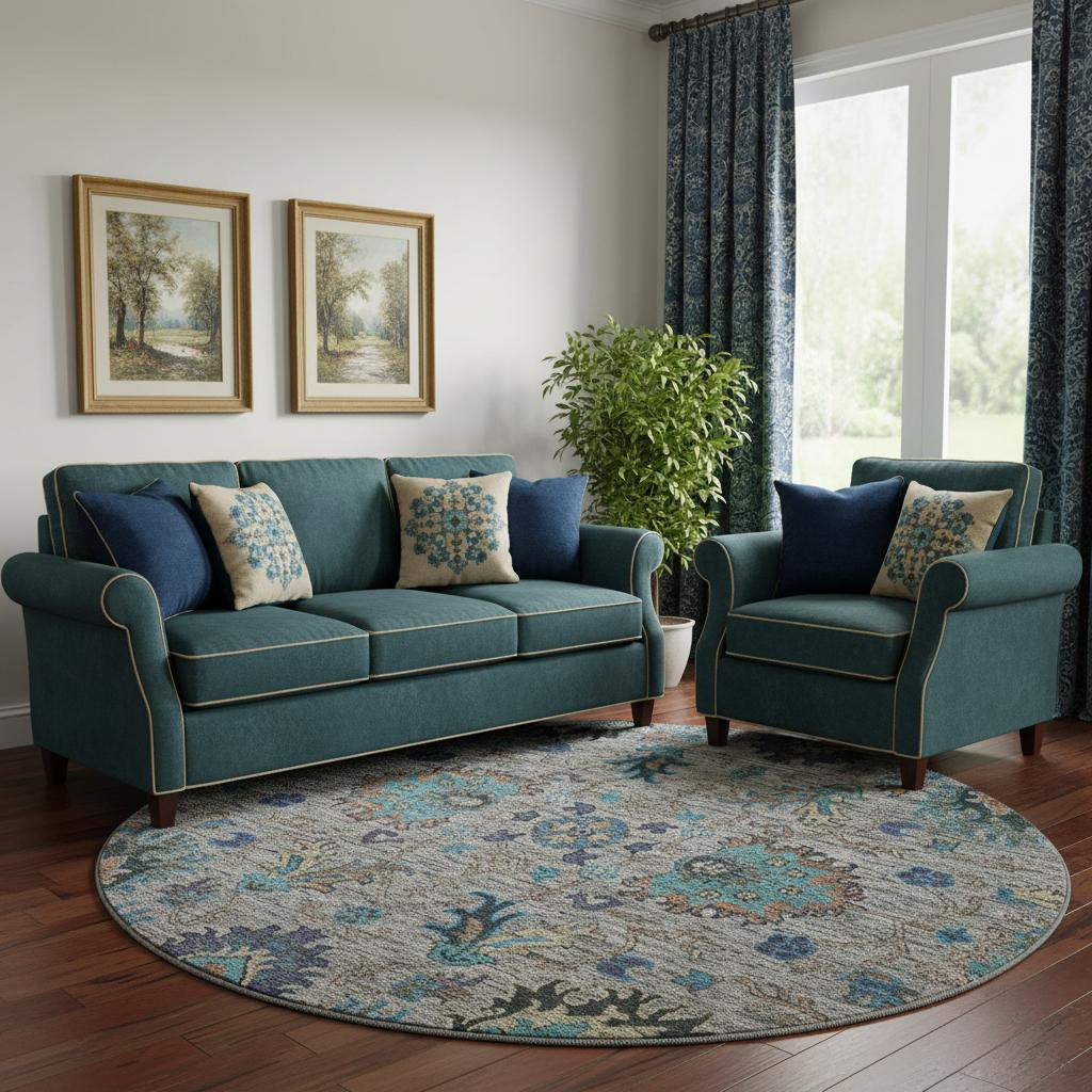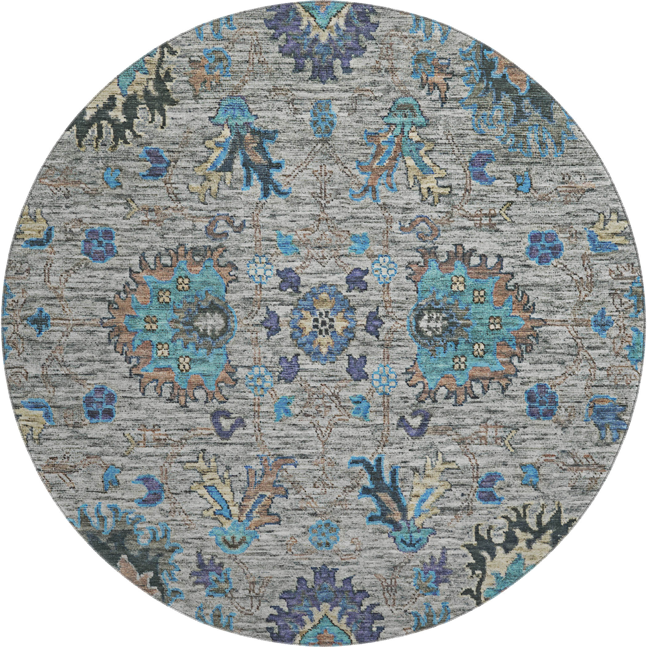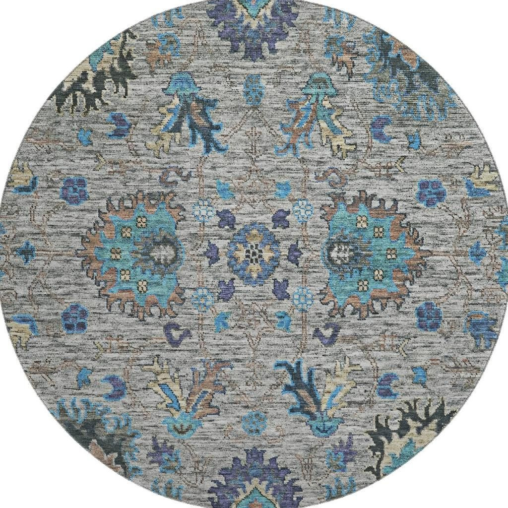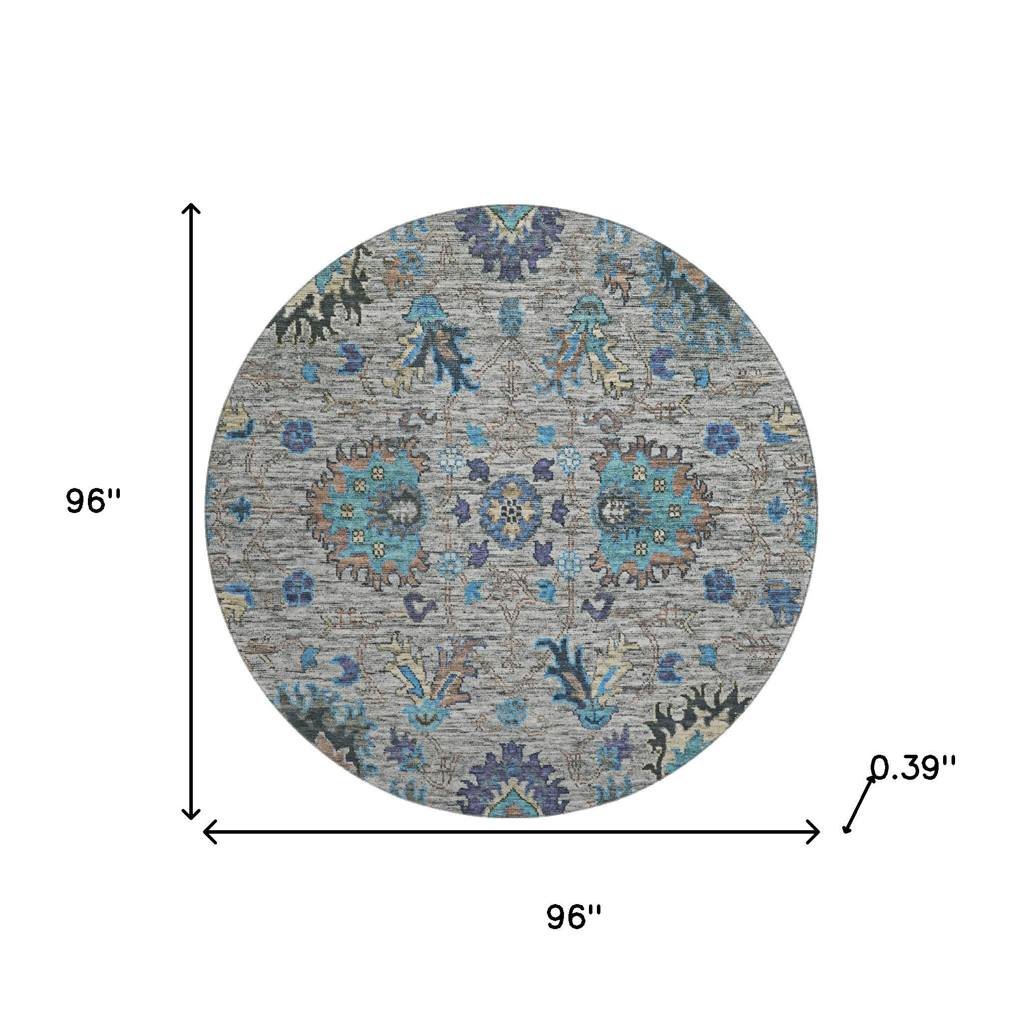 Add some artistry to your room with this 8-foot pewter and teal oriental washable round rug with uv protection. Ideal for spaces with kids and pets, this rug is stain resistant to help repel dirt and spilled liquids. Built to last, this rug crafted from polyester fibers is known for its durability and long lasting appeal. Rugs are a great way to showcase your style, hide imperfections, warm your home and reduce noise. This larger sized, traditional styled rug is ready to create a focal point or statement piece in your room. 96.00-inch h x 96.00-inch w x 0.39-inch d.