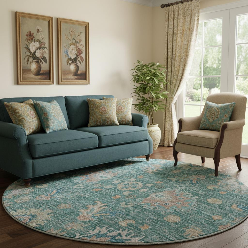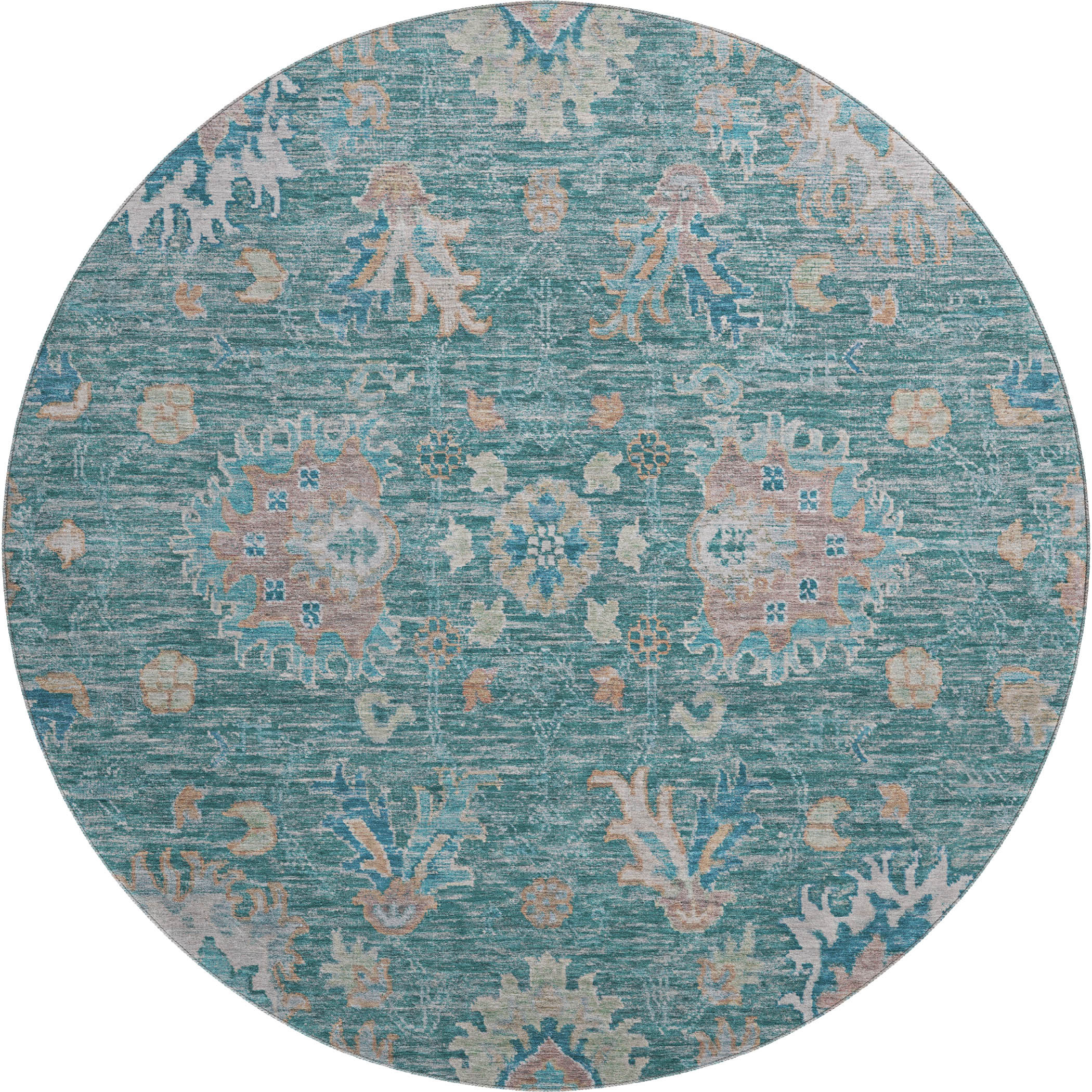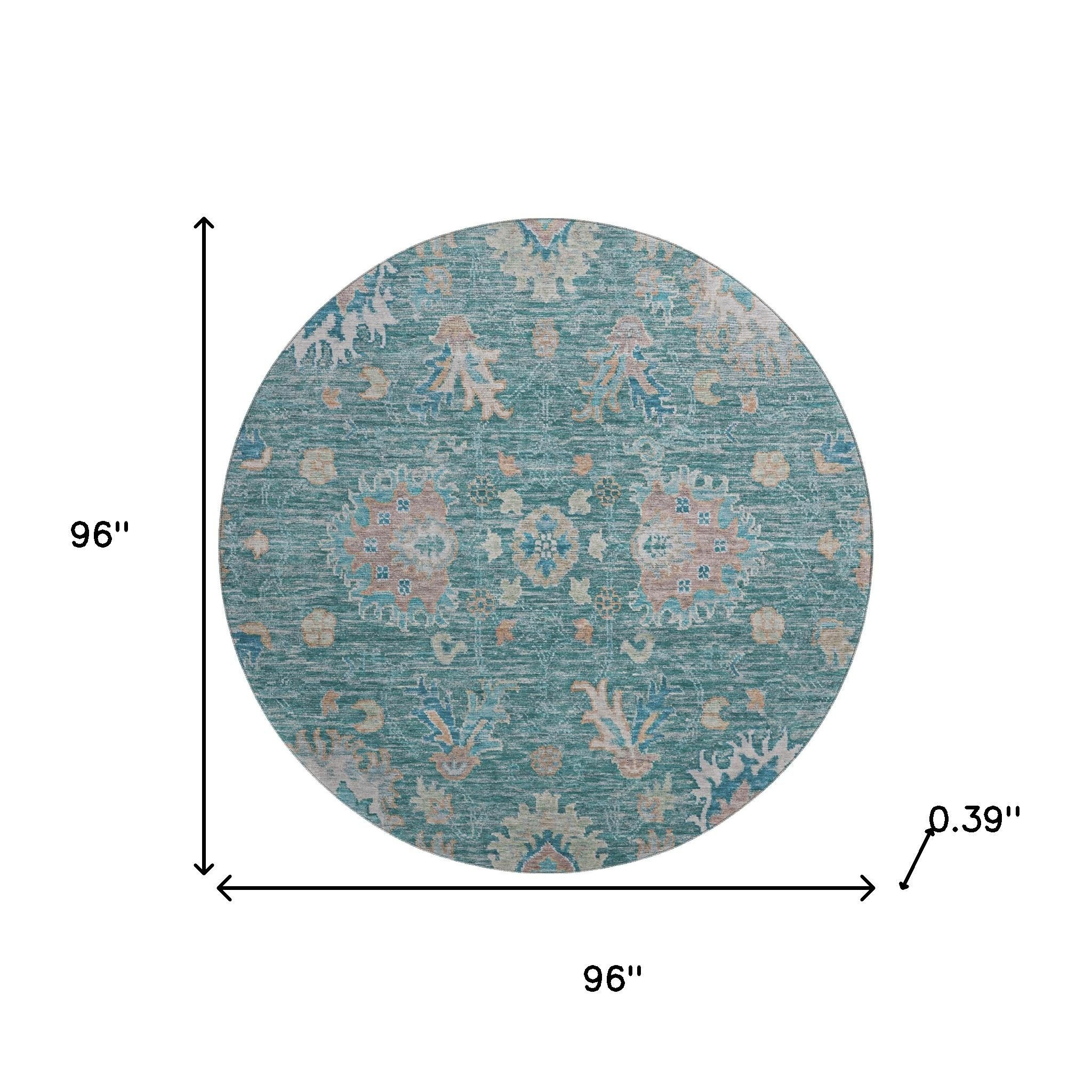 Set an inviting tone in your space with this 8-foot teal and copper oriental washable round rug with uv protection. Ideal for spaces with kids and pets, this rug is stain resistant to help repel dirt and spilled liquids. Built to last, this rug crafted from polyester fibers is known for its durability and long lasting appeal. Rugs are a great way to showcase your style, hide imperfections, warm your home and reduce noise. This larger sized, traditional styled rug is ready to create a focal point or statement piece in your room. 96.00-inch h x 96.00-inch w x 0.39-inch d.