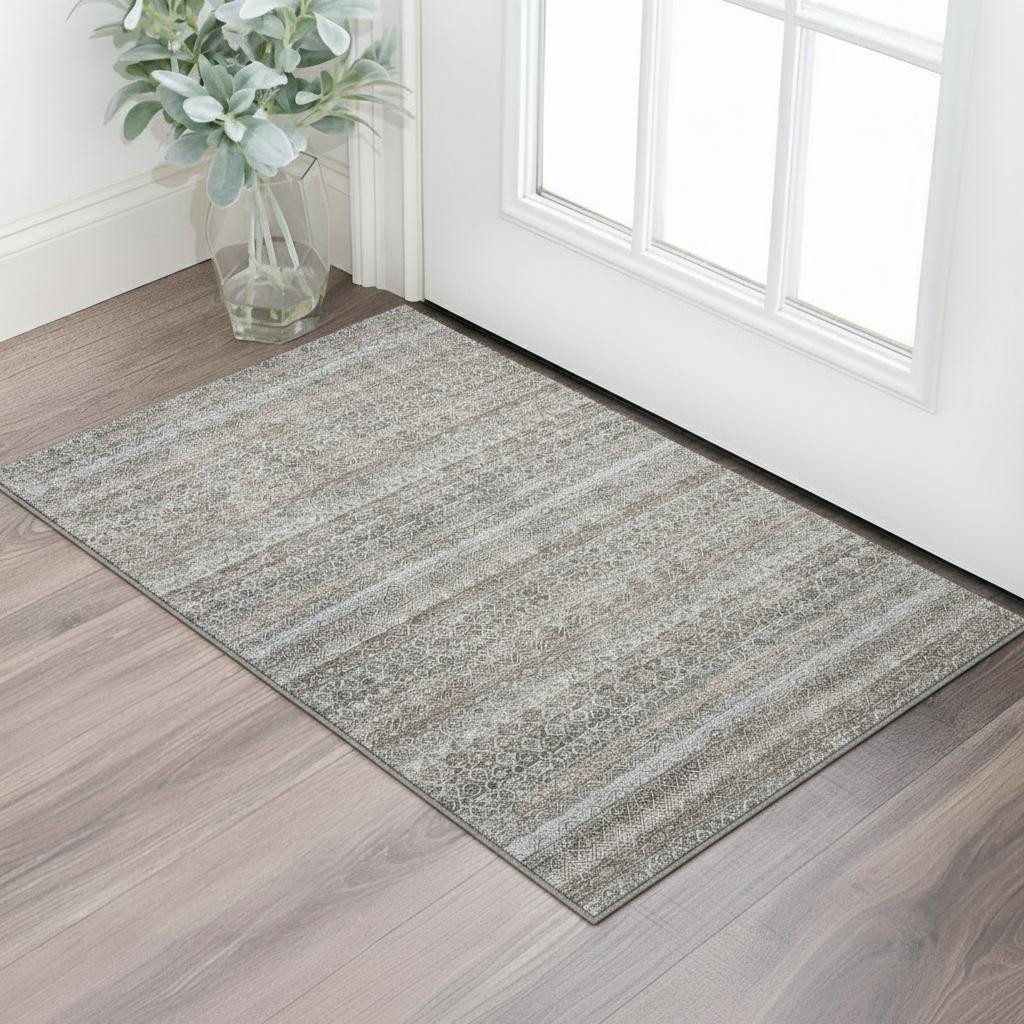 Set an inviting tone in your space with this 3-foot x 5-foot brown and beige striped washable area rug with uv protection. Ideal for spaces with kids and pets, this rug is stain resistant to help repel dirt and spilled liquids. Built to last, this rug crafted from polyester fibers is known for its durability and long lasting appeal. Rugs are a great way to showcase your style, hide imperfections, warm your home and reduce noise. This smaller sized, transitional styled rug is just what you need for your walkway, bedside, in front of door, cabinet, refrigerator, or chair. 36.00-inch h x 60.00-inch w x 0.39-inch d.