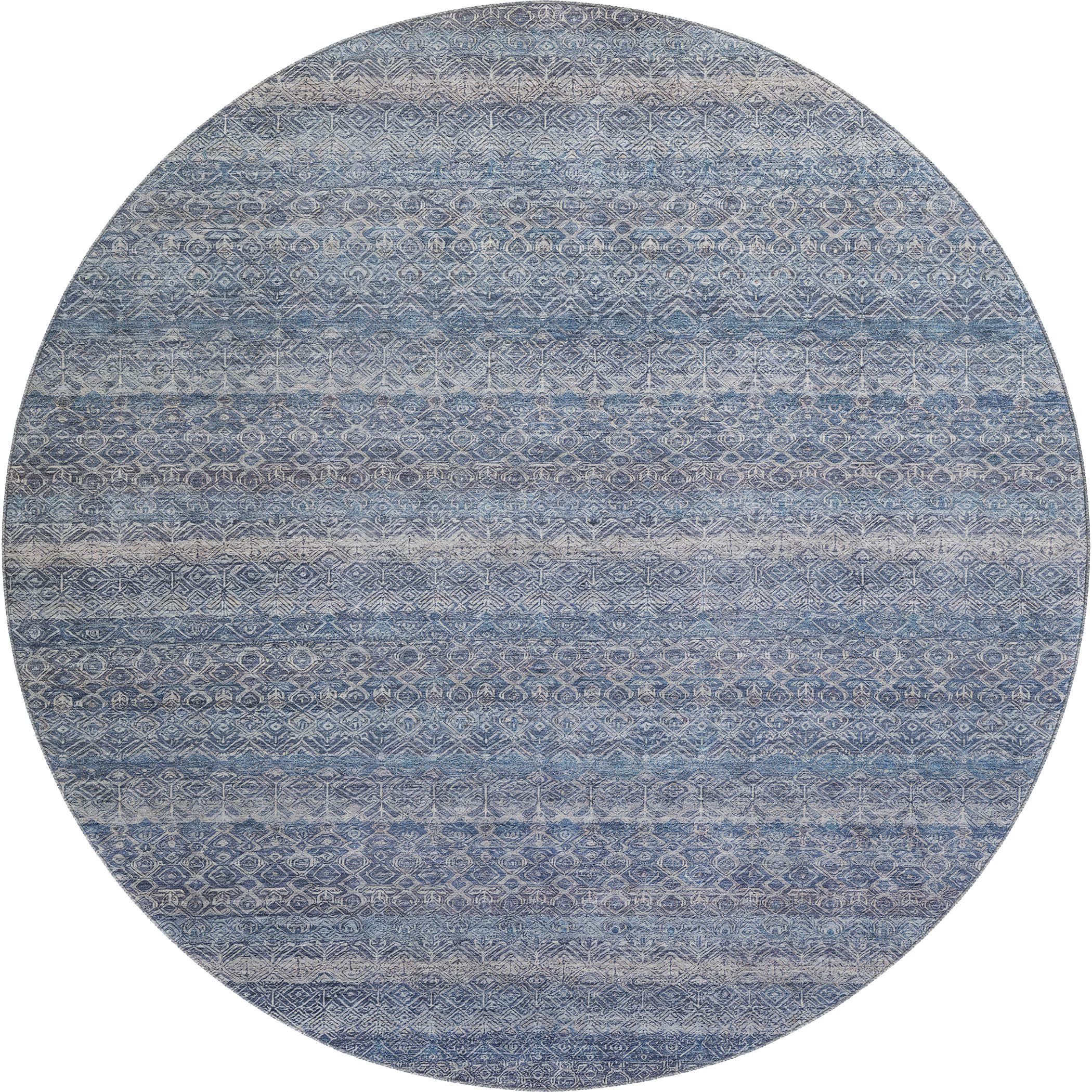 Add some artistry to your room with this 8-foot blue and beige striped washable round rug with uv protection. Ideal for spaces with kids and pets, this rug is stain resistant to help repel dirt and spilled liquids. Built to last, this rug crafted from polyester fibers is known for its durability and long lasting appeal. Rugs are a great way to showcase your style, hide imperfections, warm your home and reduce noise. This larger sized, transitional styled rug is ready to create a focal point or statement piece in your room. 96.00-inch h x 96.00-inch w x 0.39-inch d.